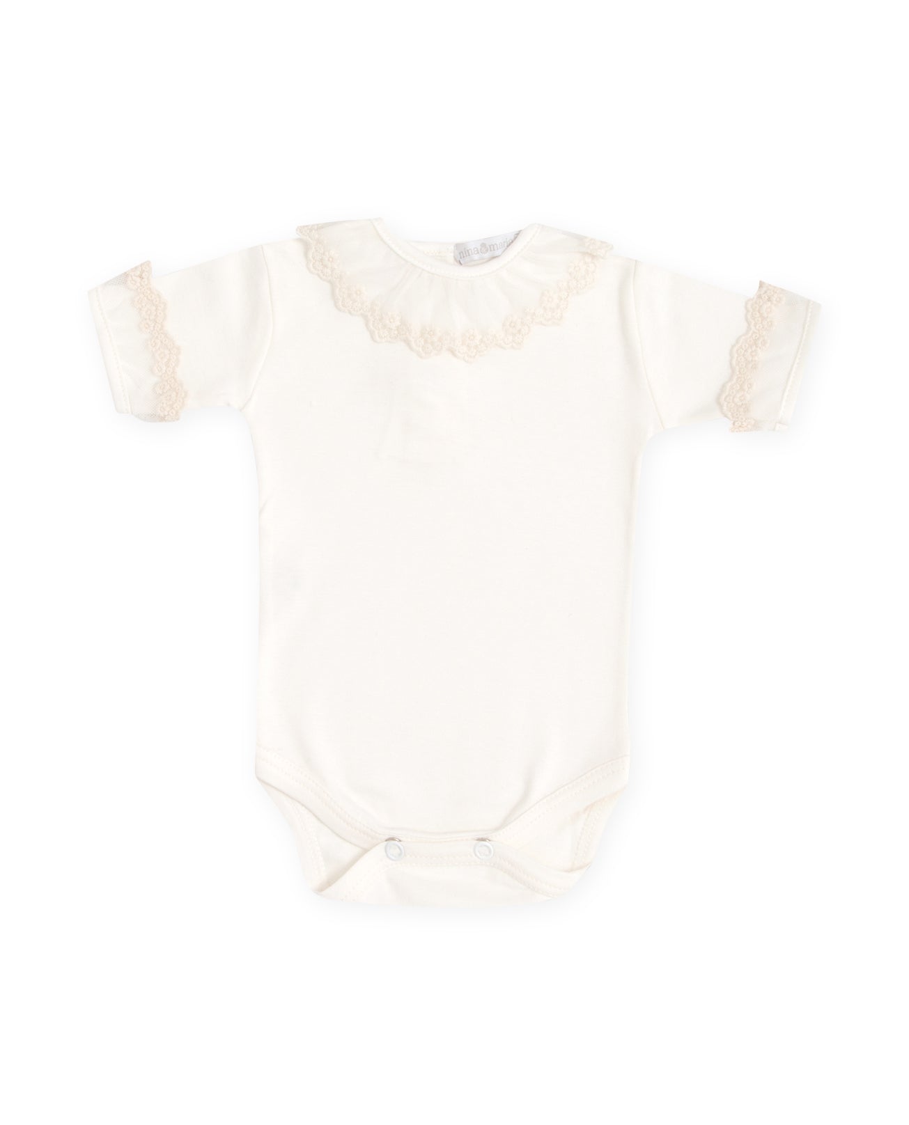 Body manga curta feminino cru com golinha e detalhes nas mangas em renda. Confeccionado em tecido suedine 100% algodão de alta gramatura e toque extra macio e confortável à delicada pele do bebê.