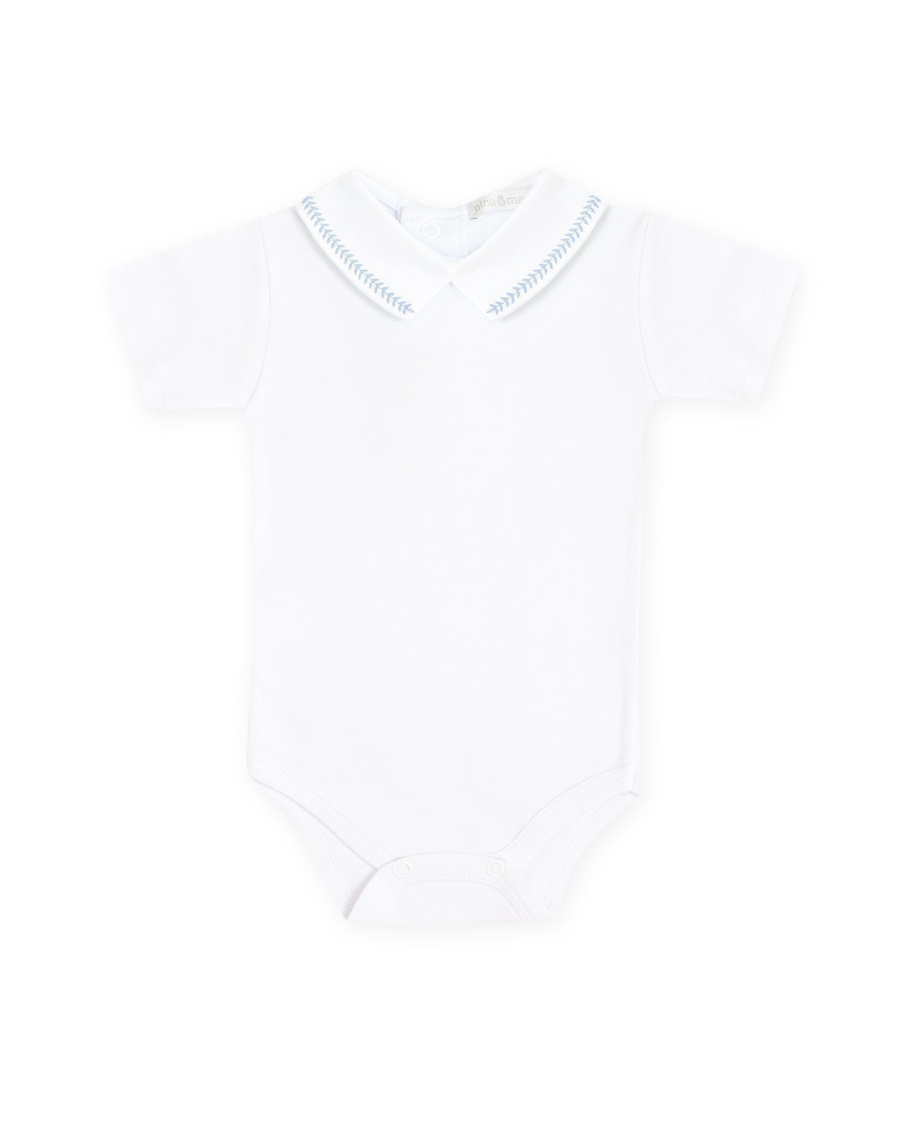 Body manga curta masculino de golinha bordada com trigo azul-claro. Confeccionado em tecido suedine 100% algodão de alta gramatura e toque extra macio e confortável à delicada pele do bebê.