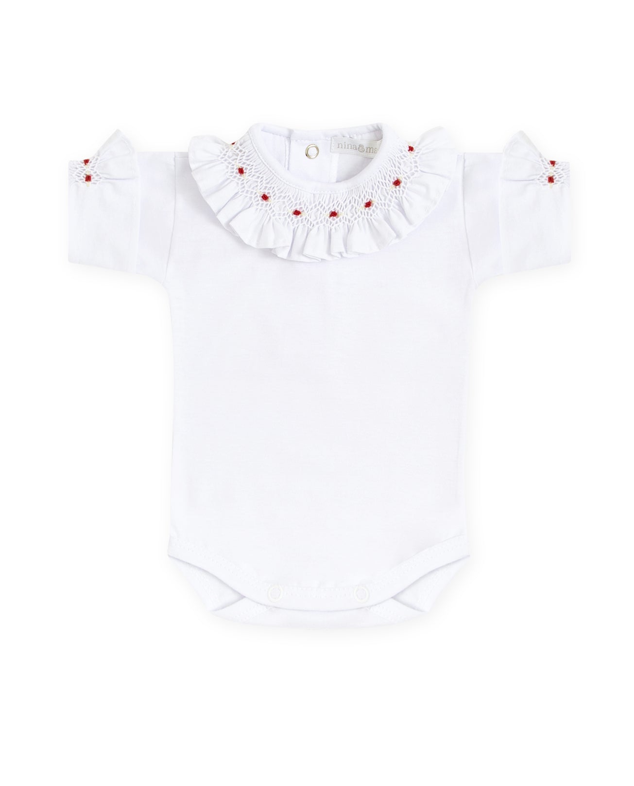 Body manga curta feminino com golinha e detalhes nas mangas bordados à mão com mini florzinhas vermelhas em estilo casinha de abelha trazendo toda a tradição e sofisticação para o enxoval de sua bebê. Confeccionado em tecido suedine 100% algodão de alta gramatura e toque extra macio e confortável à delicada pele do bebê.