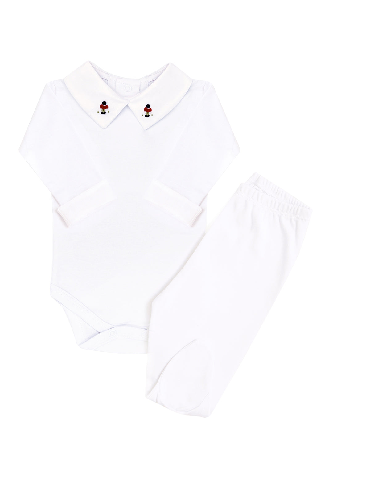 Body masculino em malha 100% algodão com toque super macio e confortável. Gola reta com bordado de soldadinho. Possui fechamento em botão de pressão nas costas e na entreperna para facilitar a troca do bebê.