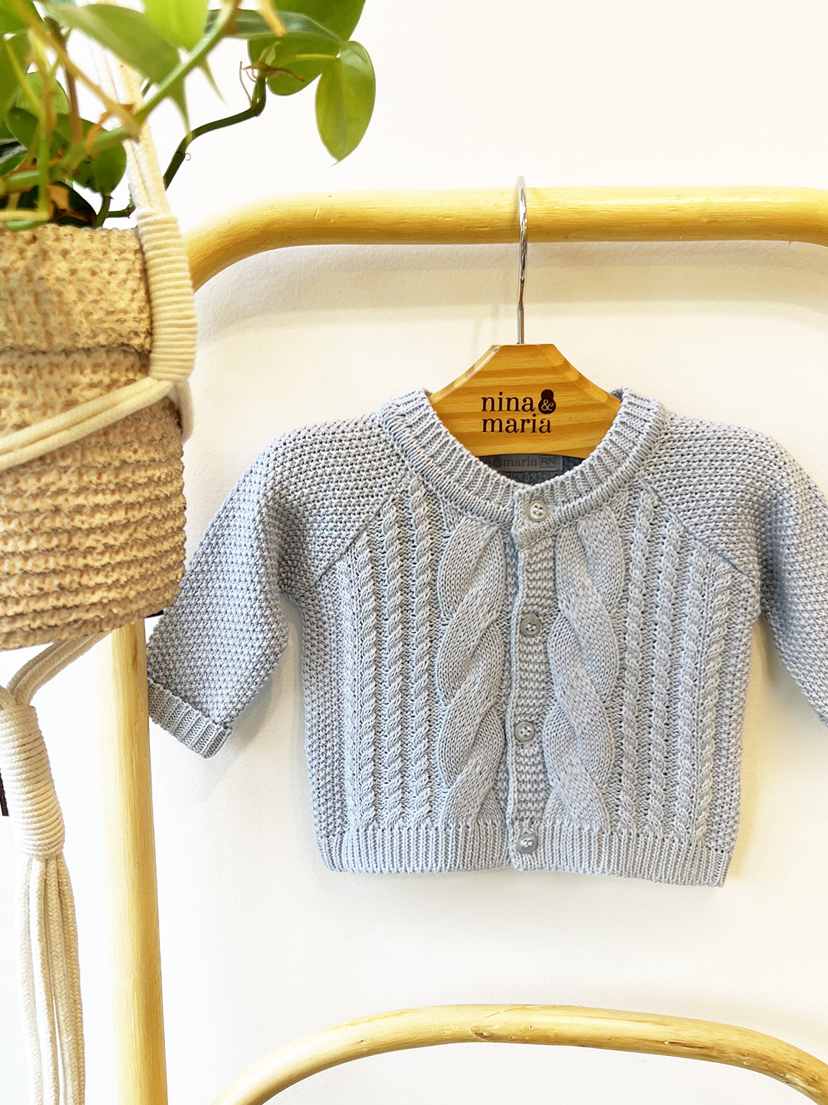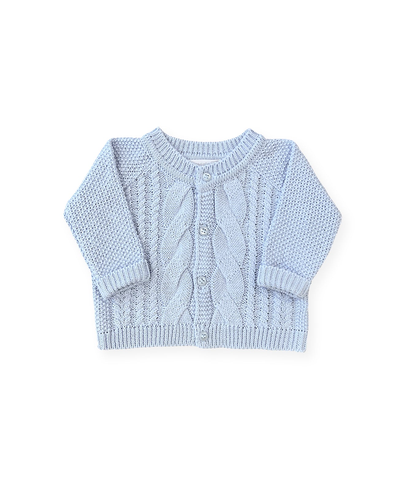 Casaquinho unissex em tricot todo trabalhado com tranças. Abotoamento frontal.