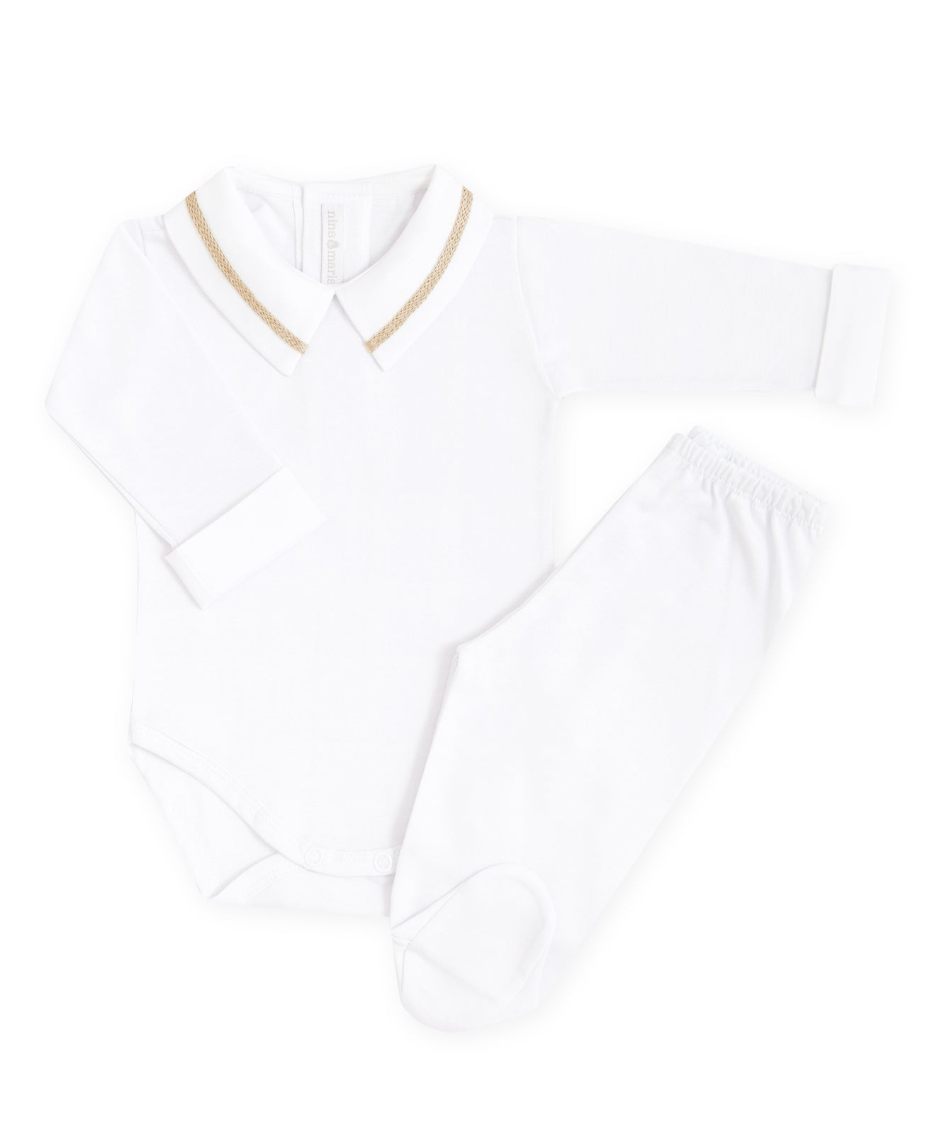 Conjunto de body e culote (mijão) masculino em malha 100% algodão com toque super macio e confortável. Gola reta com aplique bordado em faixa no mesmo fio do tricot. Gola e vira do punho em fustão. Possui fechamento em botão de pressão nas costas e na entreperna para facilitar a troca do bebê.