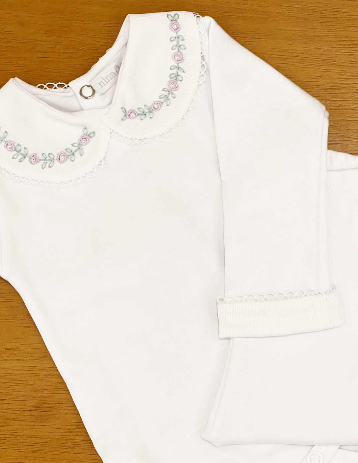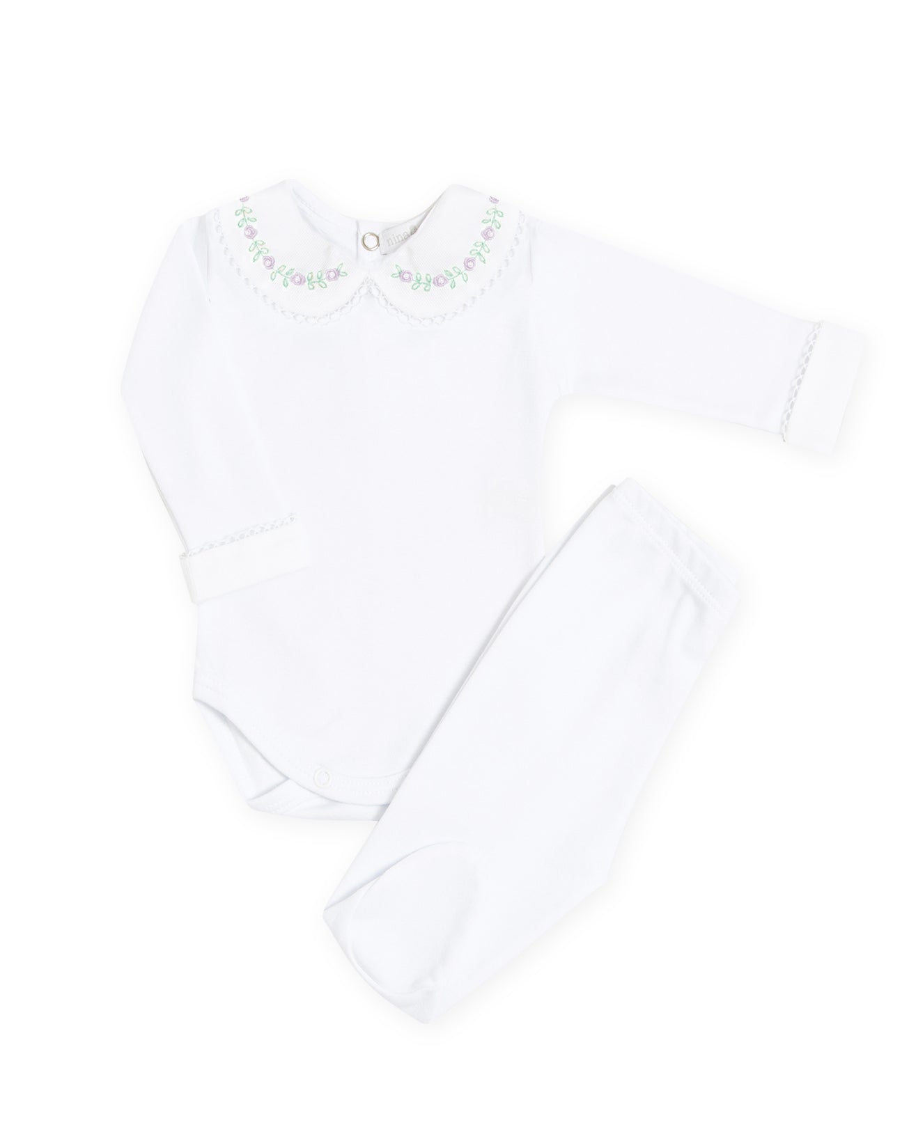 Conjunto de body e culote (mijão) feminino em malha 100% algodão com toque super macio e confortável. Gola redonda com flores lilás bordadas à mão em estilo rococó. Gola e vira do punho com acabamento de bicos. Possui fechamento em botão de pressão nas costas e na entreperna para facilitar a troca do bebê.