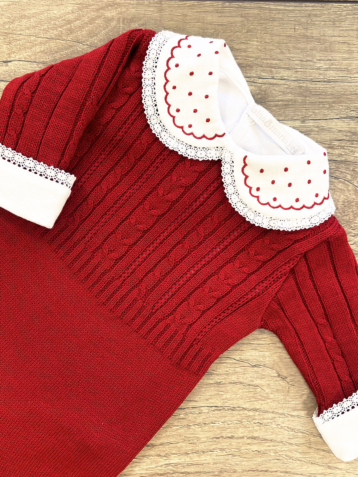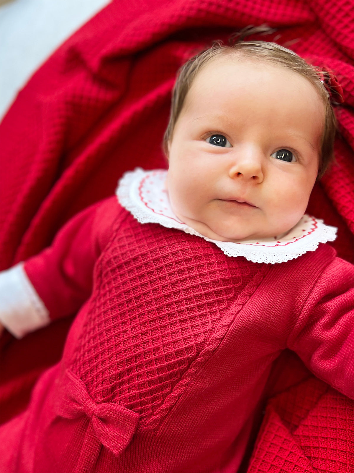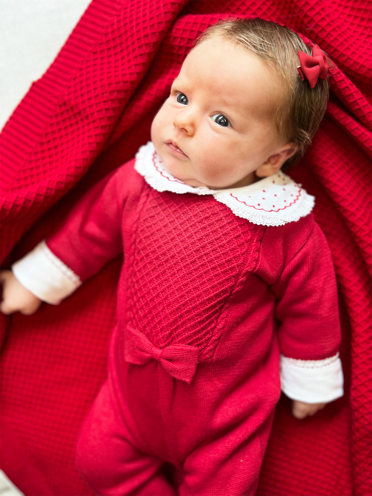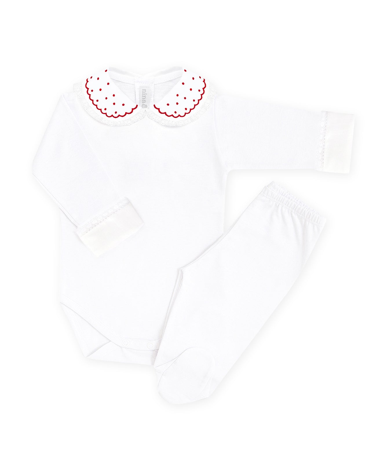 Conjunto de body e culote (mijão) feminino em malha 100% algodão com toque super macio e confortável. Gola redonda em linho com bordado de poás vermelho. Gola e vira do punho com acabamento em rendinha. Possui fechamento em botão de pressão nas costas e na entreperna para facilitar a troca do bebê.