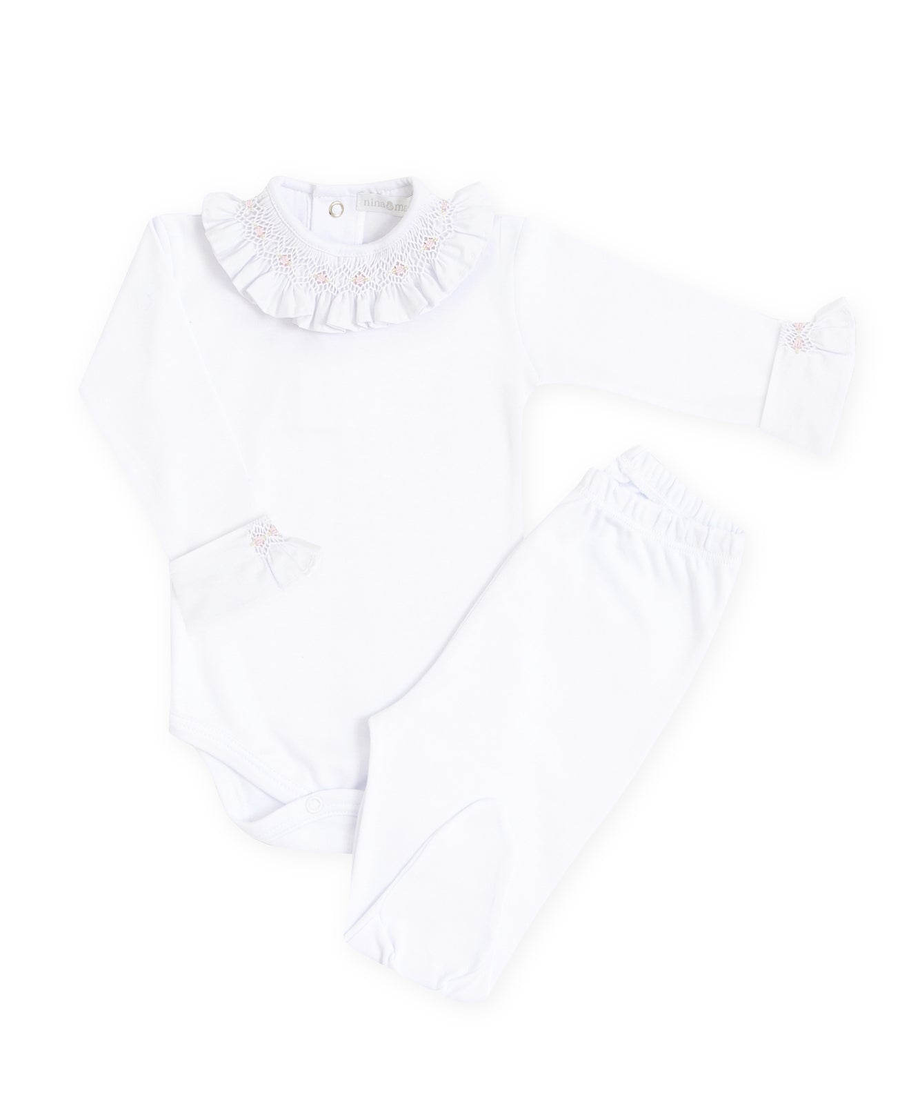 Conjunto de body e culote (mijão) em malha 100% algodão com toque super macio e confortável. Gola redonda e punho com bordado casinha de abelha e flores rococó. Possui fechamento em botão de pressão nas costas e na entreperna para facilitar a troca do bebê.
