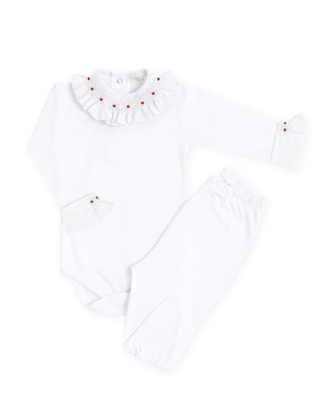 Conjunto de body e culote (mijão) em malha 100% algodão com toque super macio e confortável. Gola redonda e punho com bordado casinha de abelha e flores rococó. Possui fechamento em botão de pressão nas costas e na entreperna para facilitar a troca do bebê.