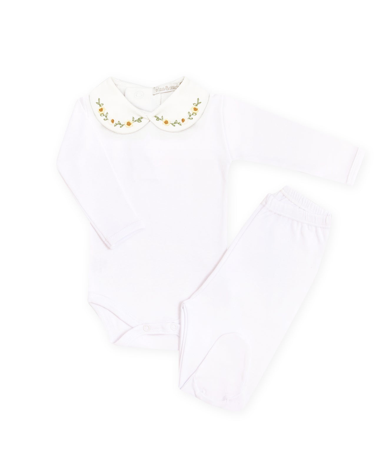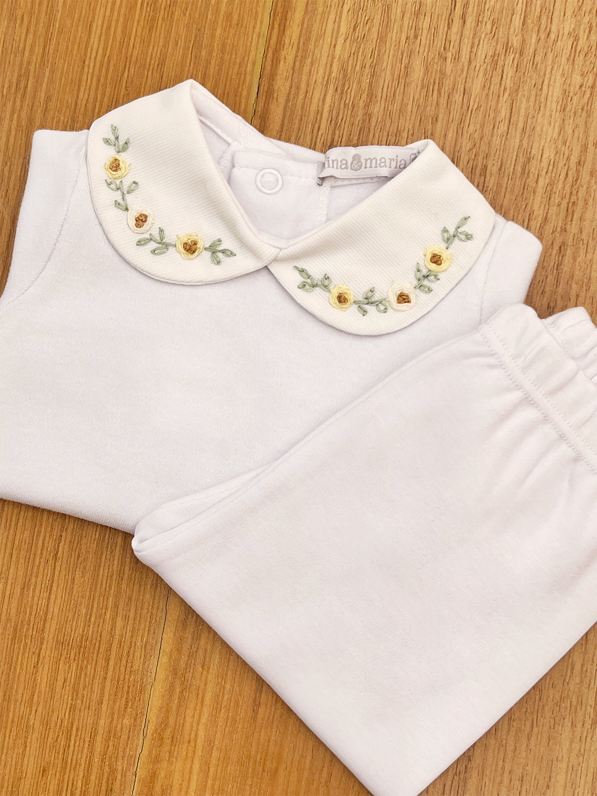 Conjunto de body e culote (mijão) feminino em malha 100% algodão com toque super macio e confortável. Gola redonda com flores amarelas bordadas. Possui fechamento em botão de pressão nas costas e na entreperna para facilitar a troca do bebê.