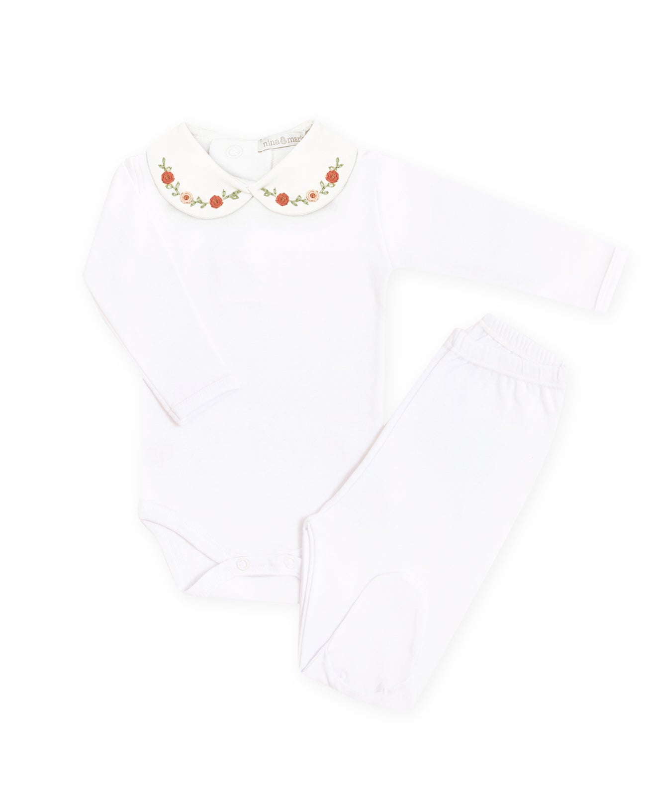 Conjunto de body e culote (mijão) feminino em malha 100% algodão com toque super macio e confortável. Gola redonda com flores rosê bordadas. Possui fechamento em botão de pressão nas costas e na entreperna para facilitar a troca do bebê.