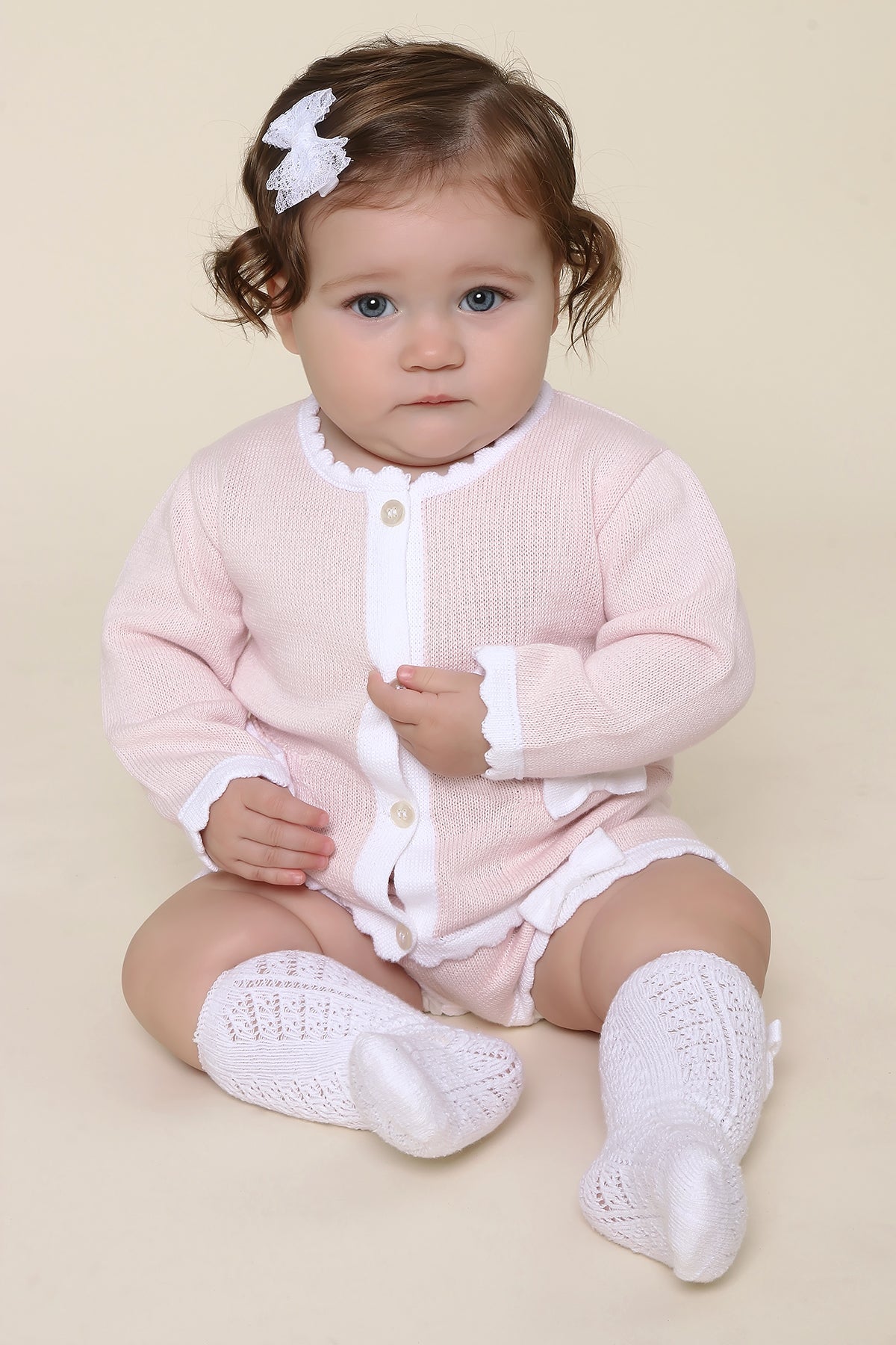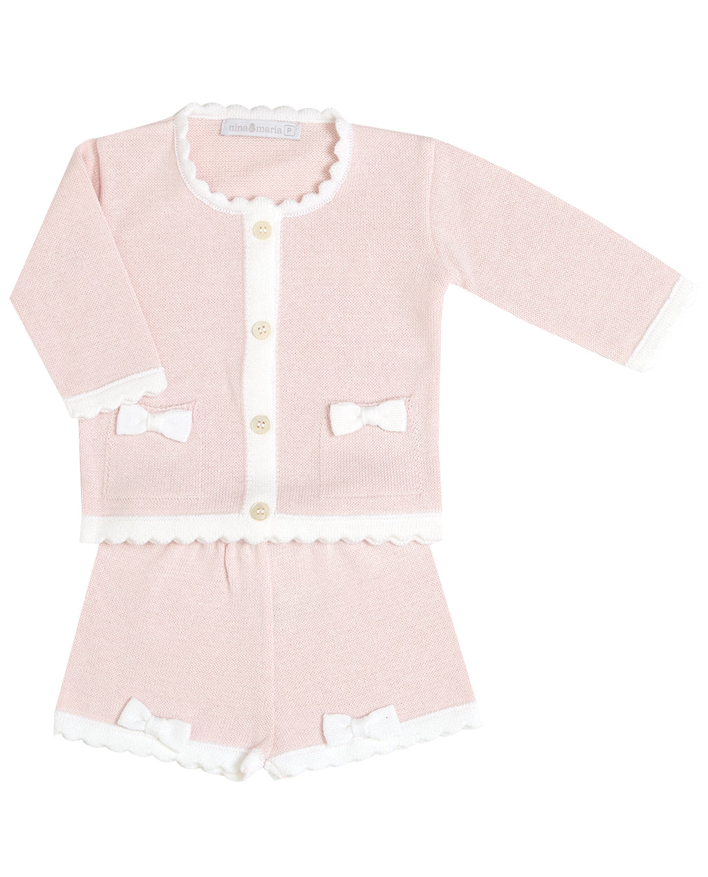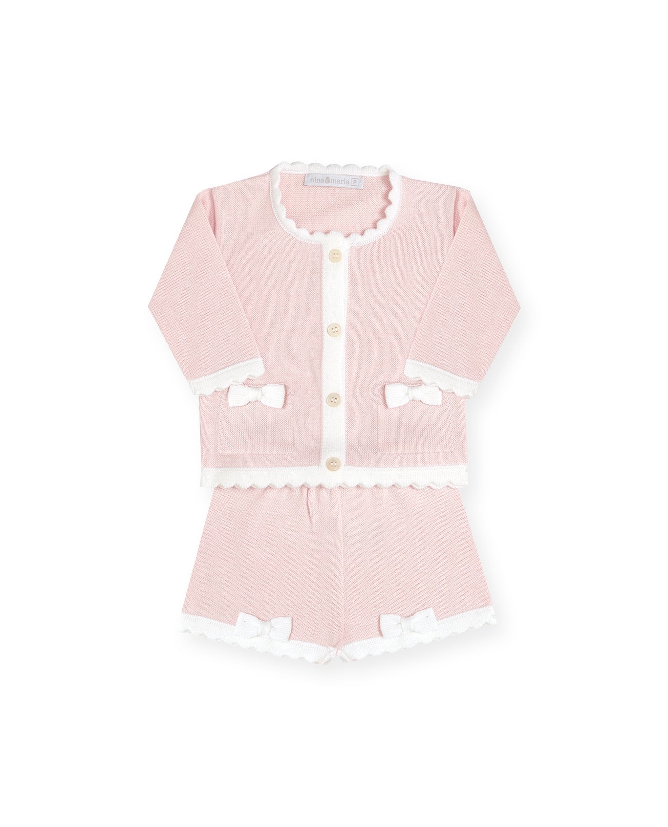 Conjuntinho de shorts e casaquinho de bolsinhos com aplique de lacinhos.