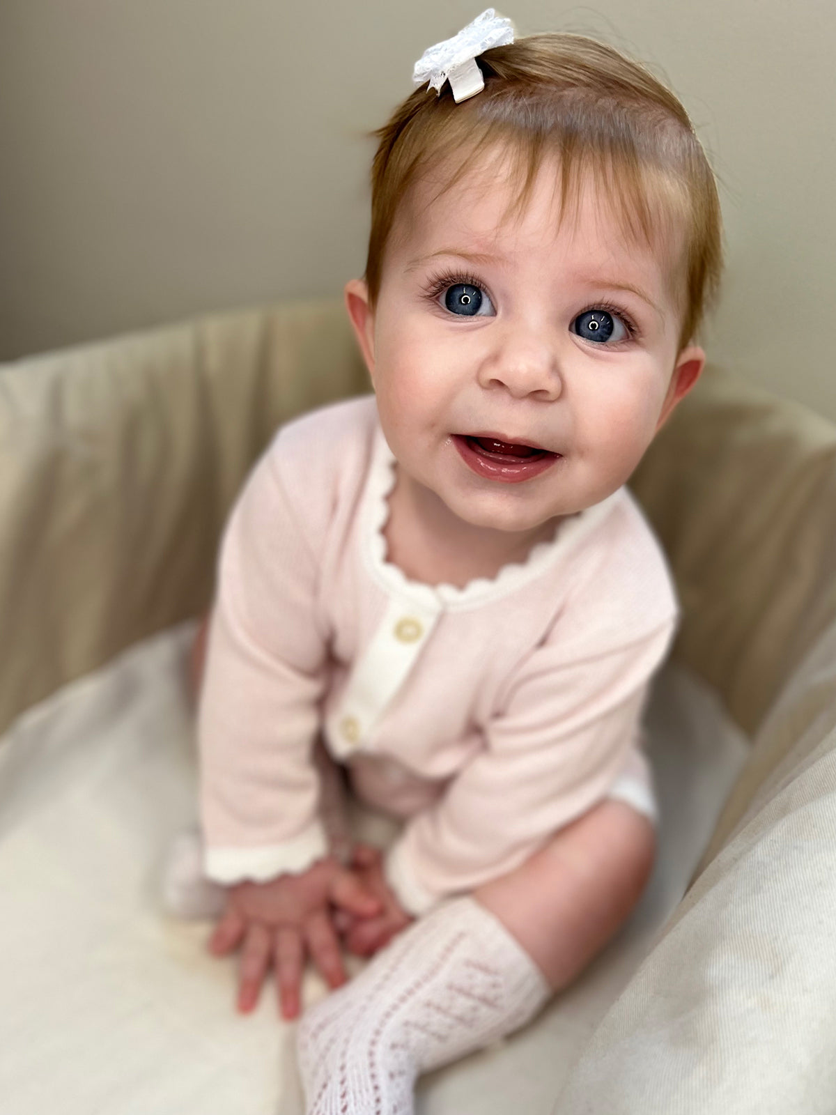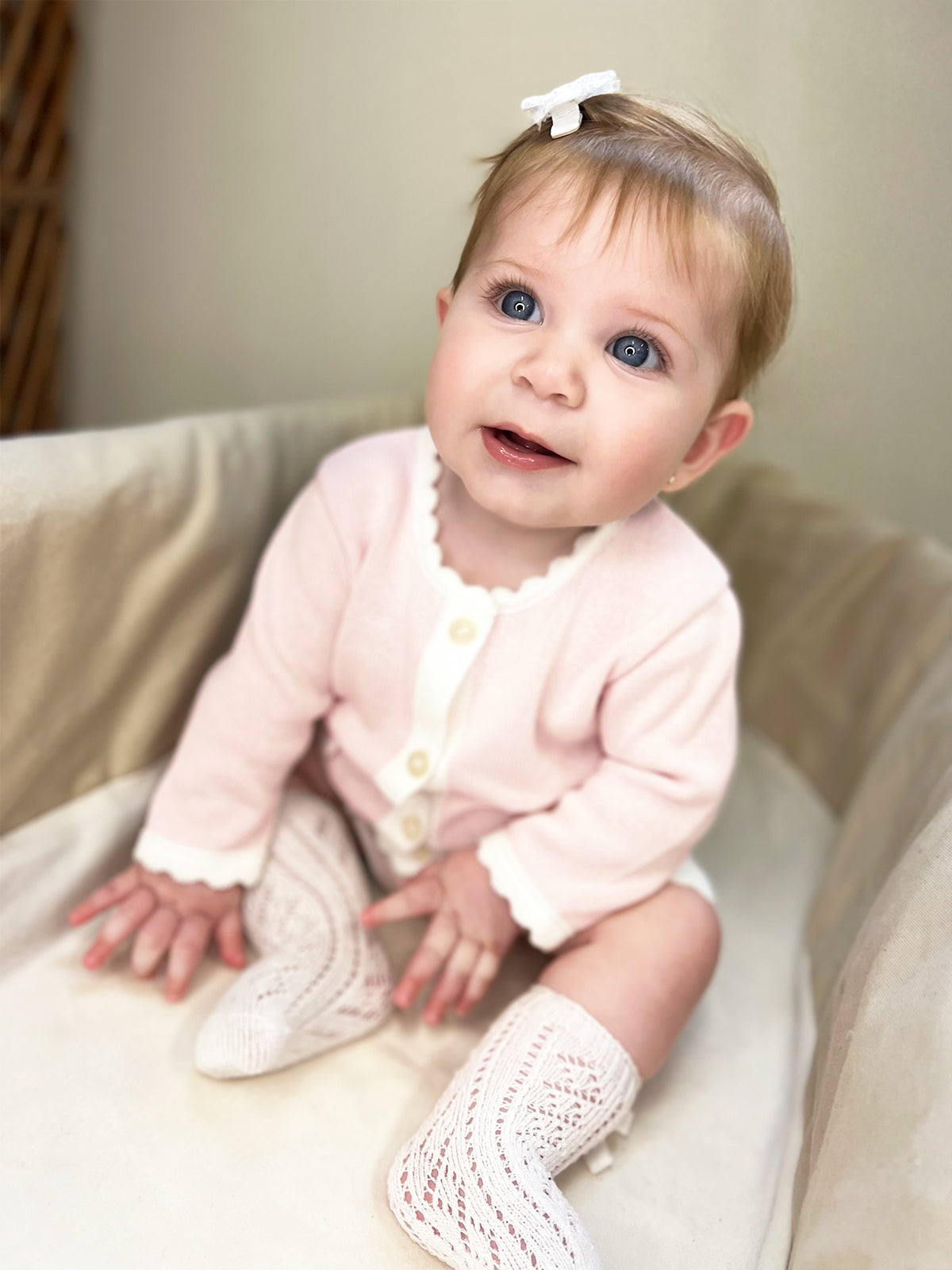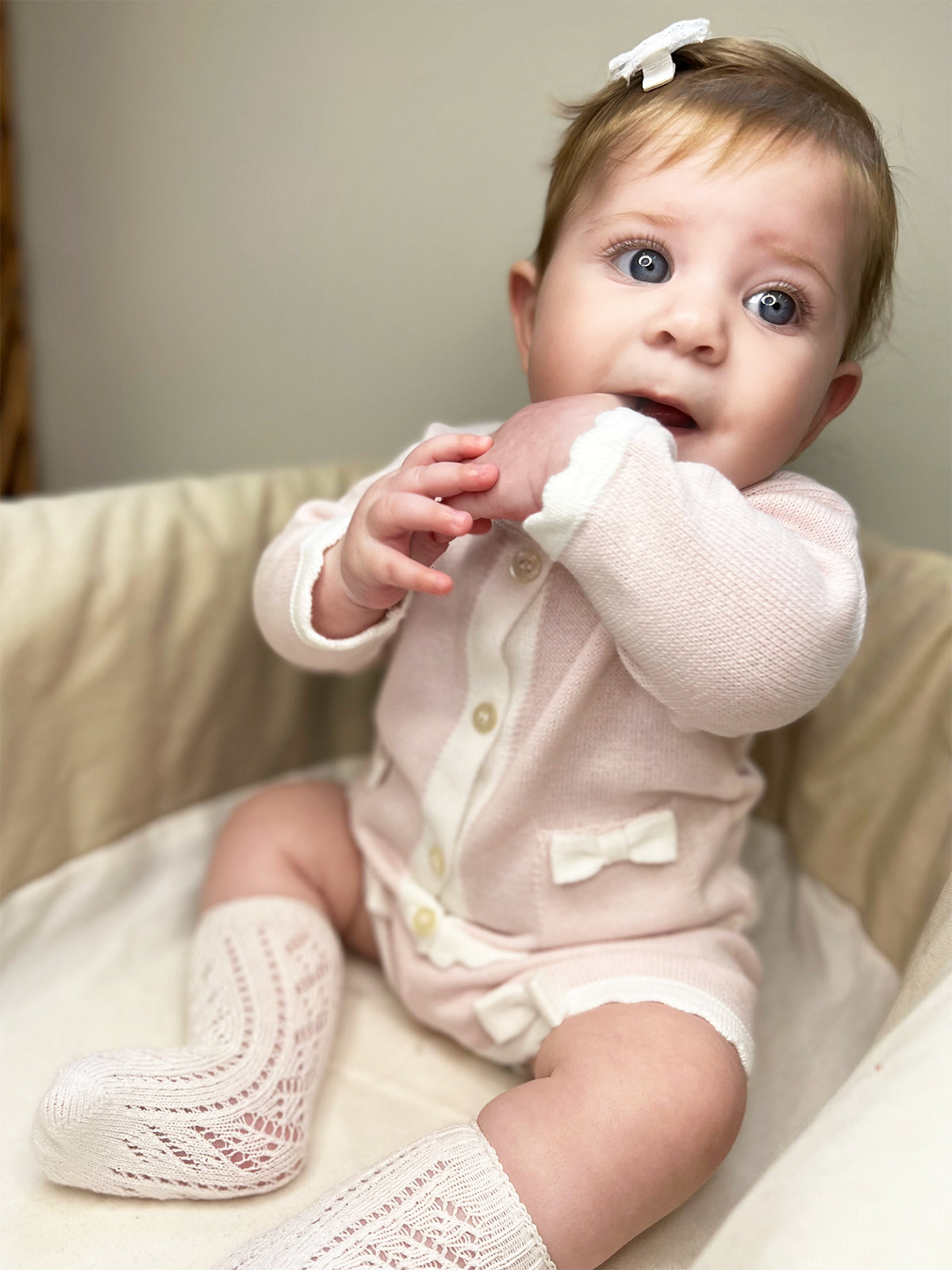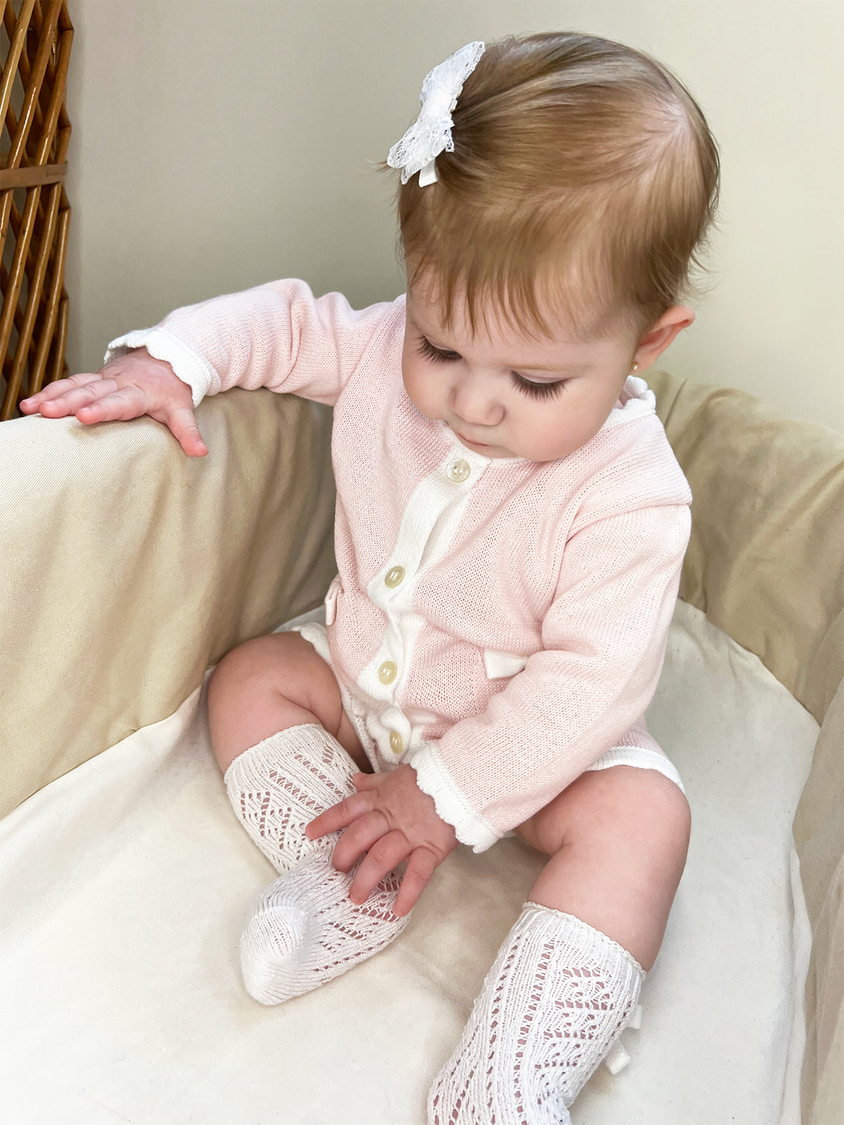 Conjuntinho de shorts e casaquinho de bolsinhos com aplique de lacinhos.