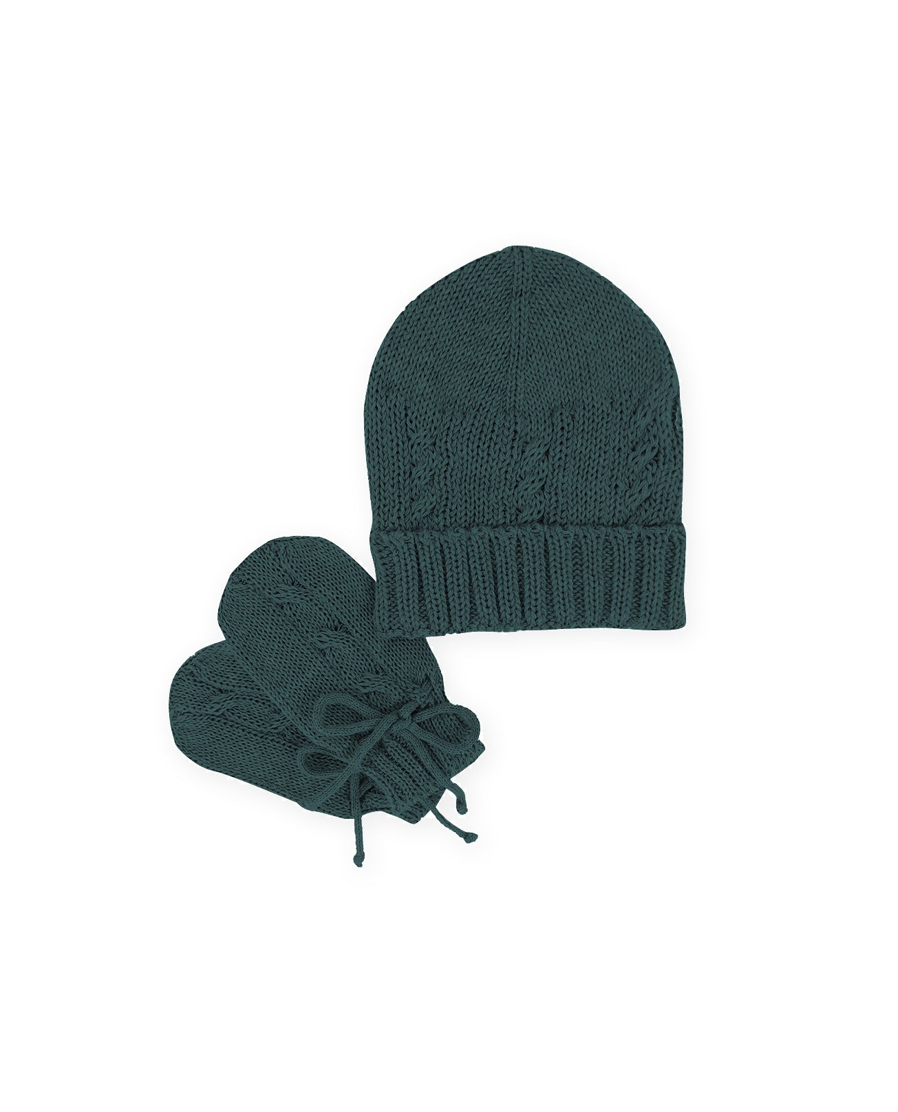 Conjunto de gorrinho e par de luvas em tricot com detalhe de tranças, ideal para a maternidade.
