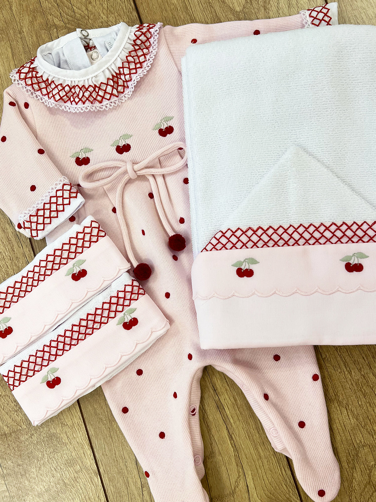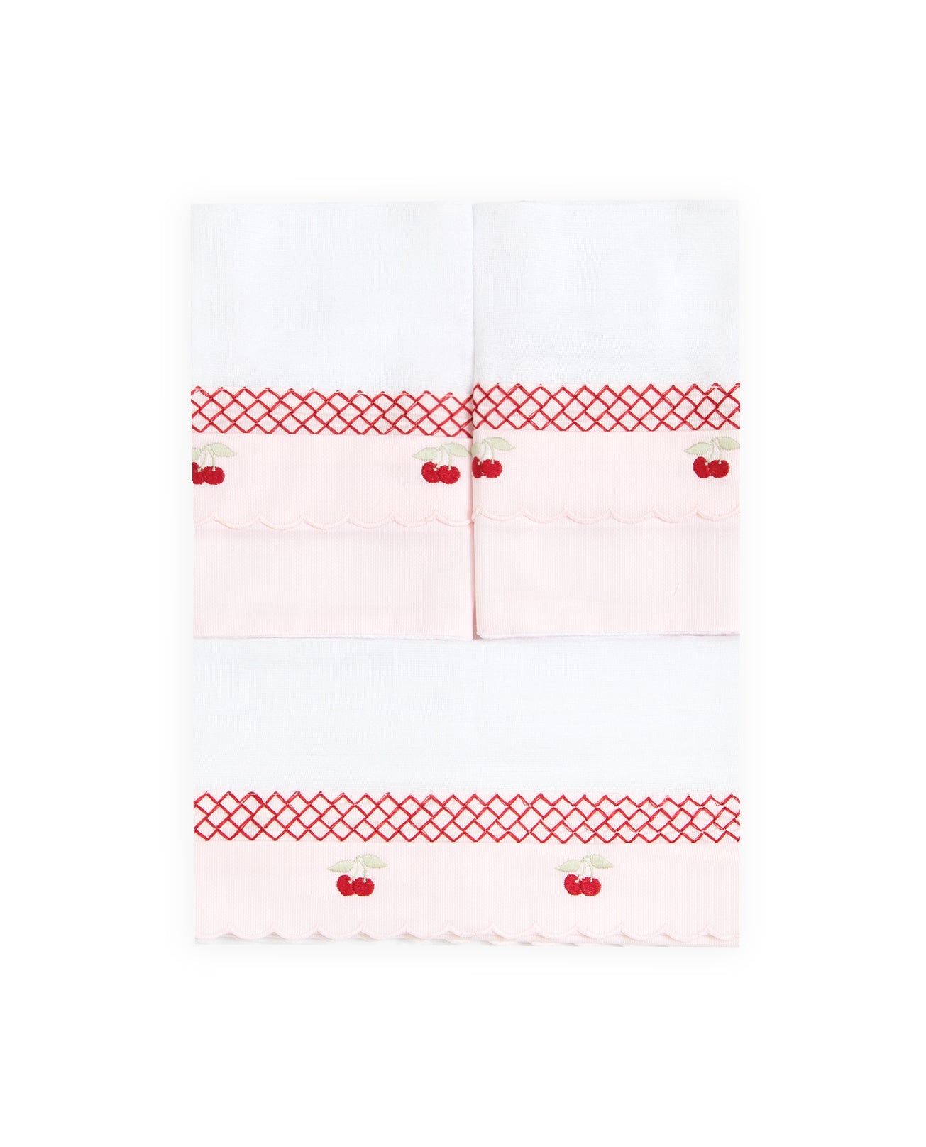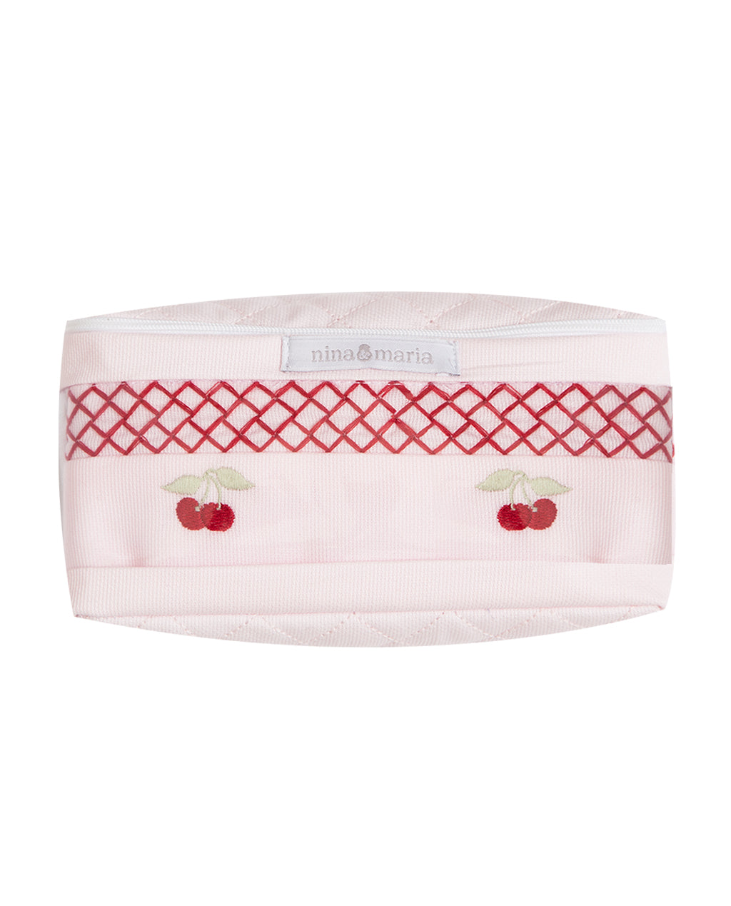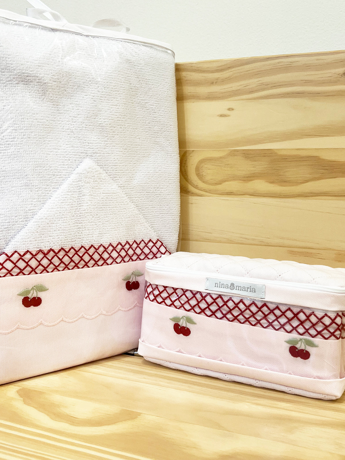 Kit de fraldinhas com barrado rosa de cerejas bordadas. Vem em uma mini frasqueira, perfeita para levar para a maternidade.