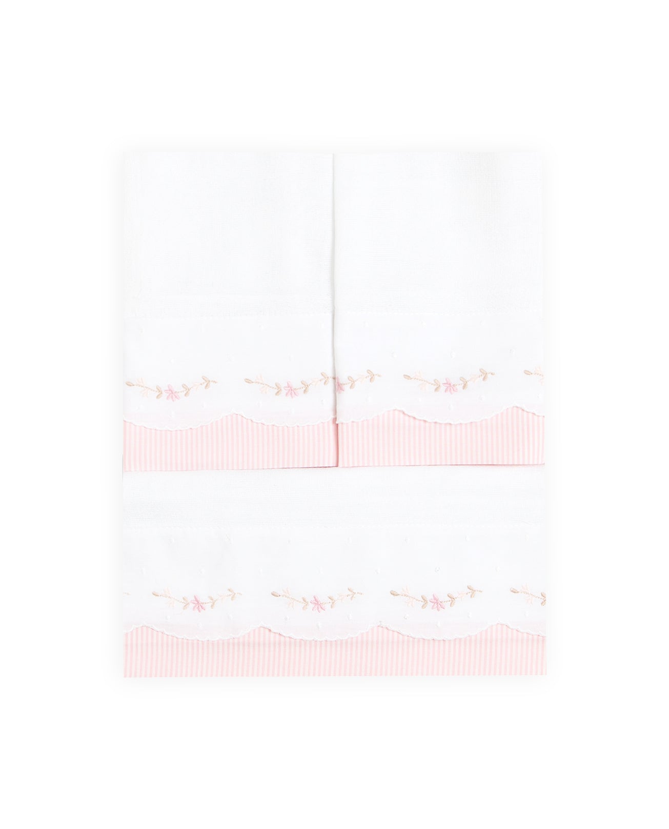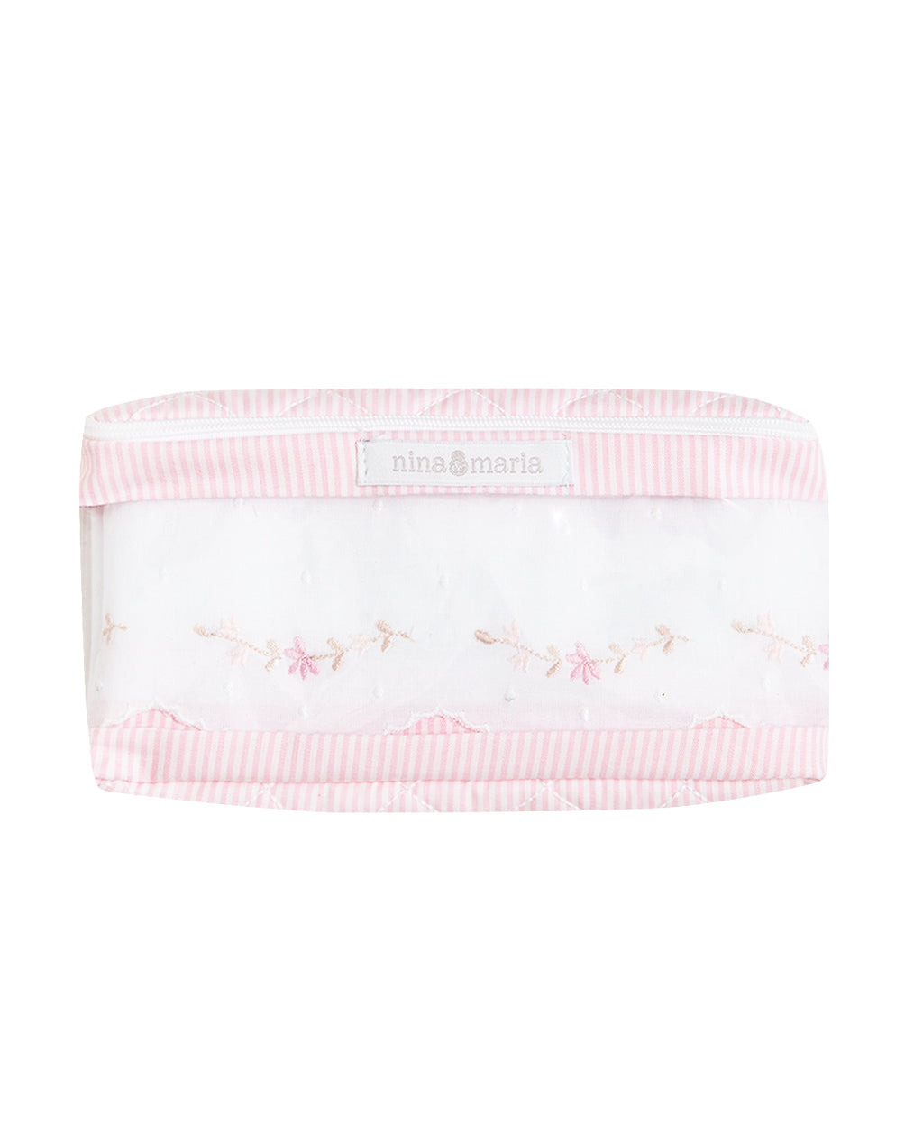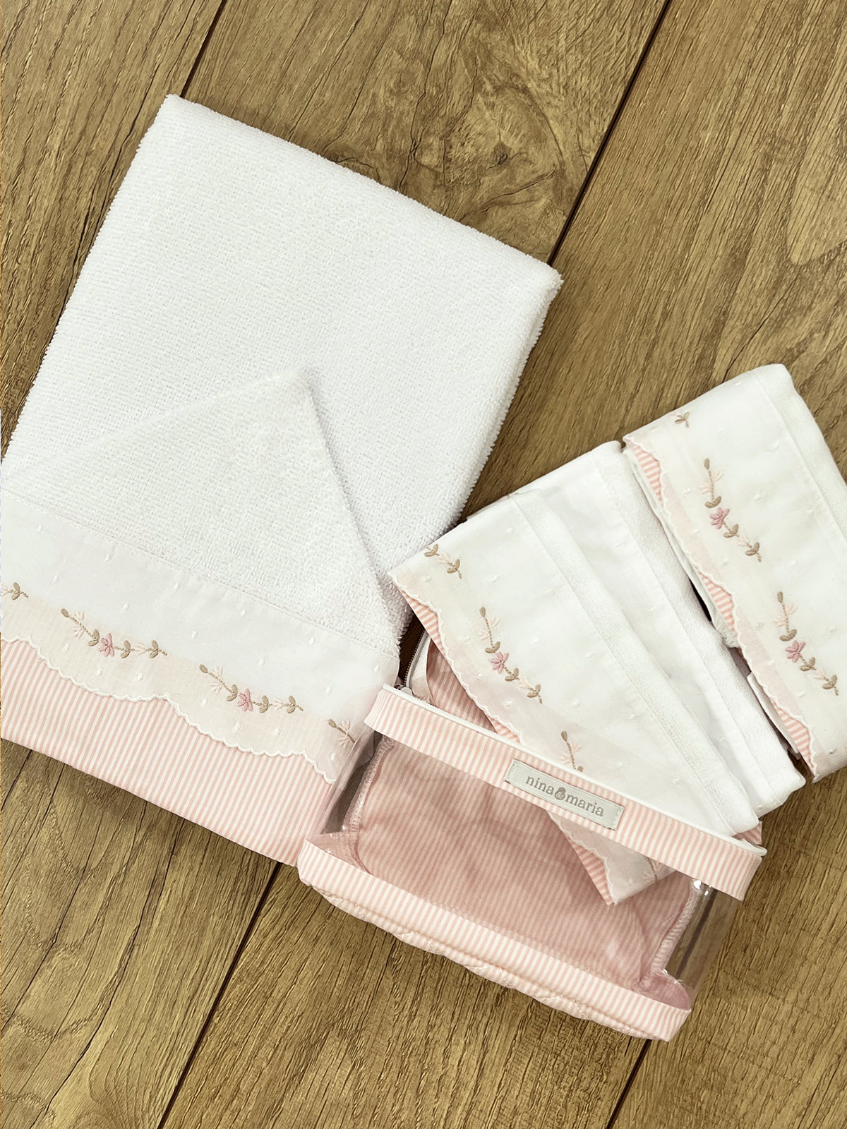 Kit de fraldinhas, barrado bordado com galhos de flores rosas e bolinhas branquinhas. Vem em uma mini frasqueira, perfeita para levar para a maternidade.