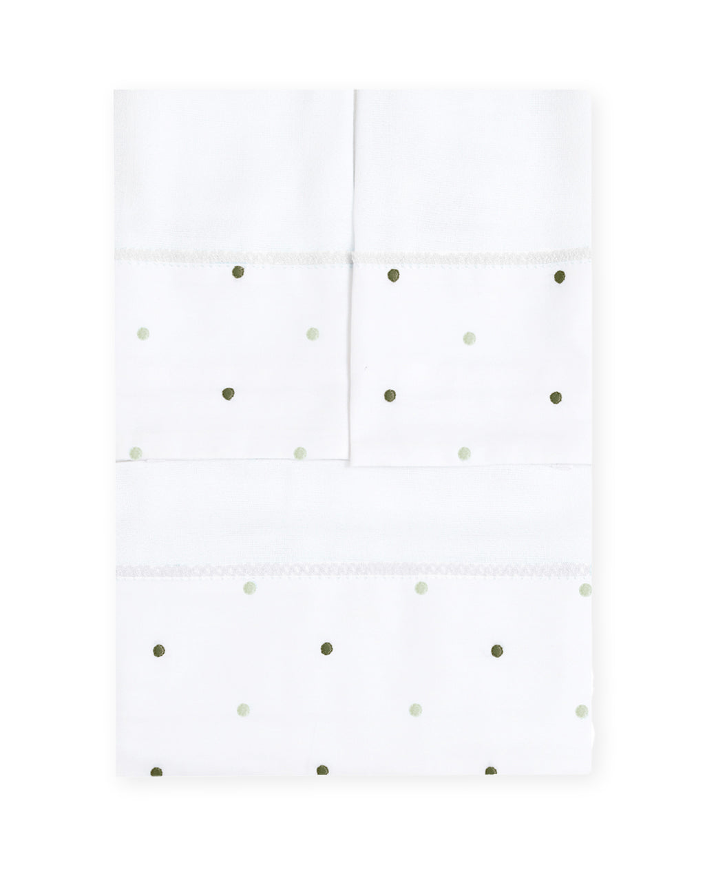 Kit de fraldinhas com barrado bordado com bolinhas em dois tons de verde. Vem em uma mini frasqueira, perfeita para levar para a maternidade.