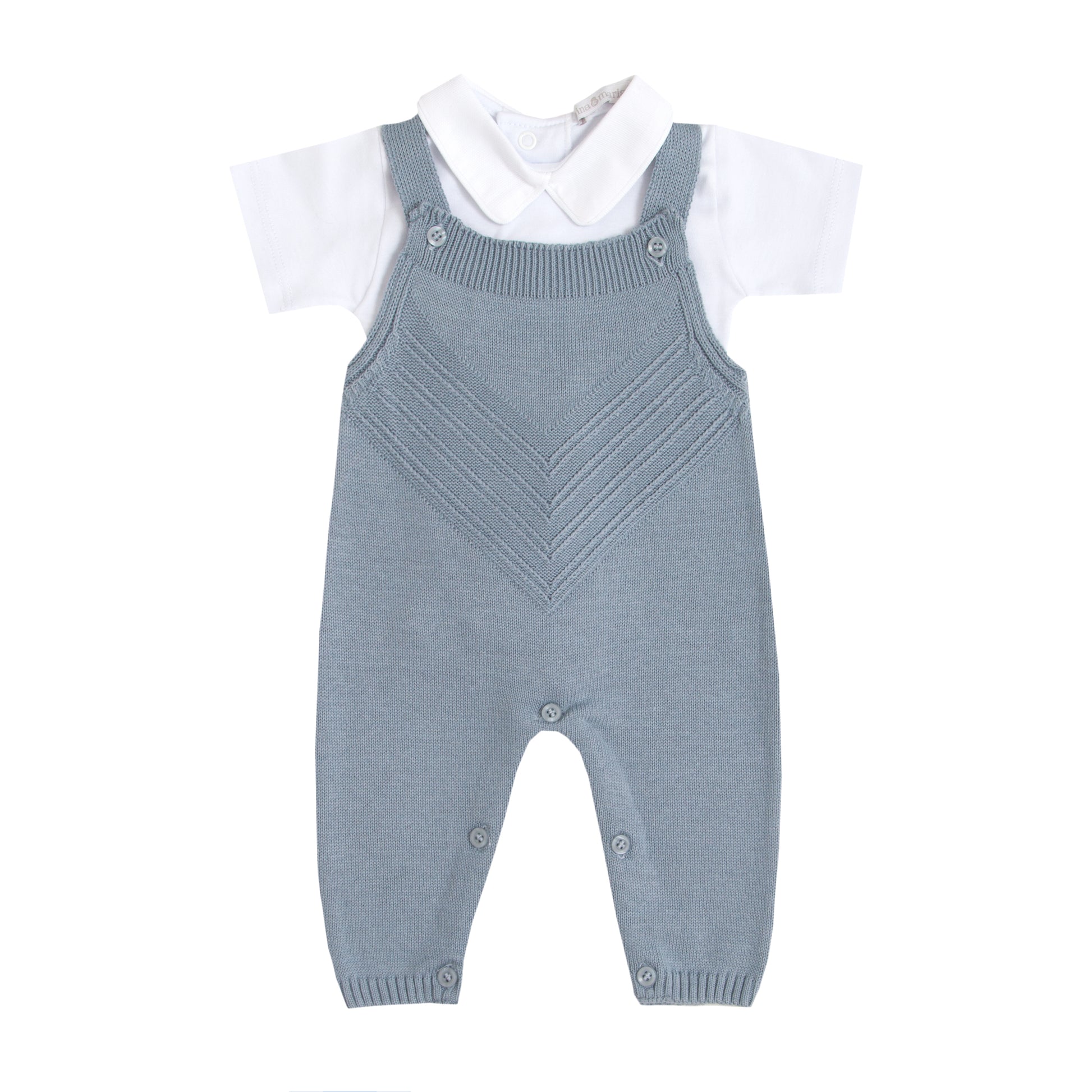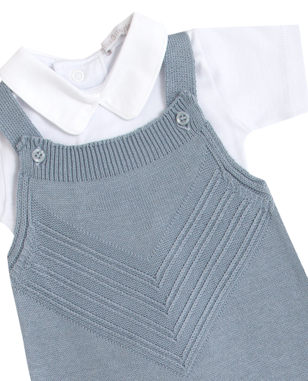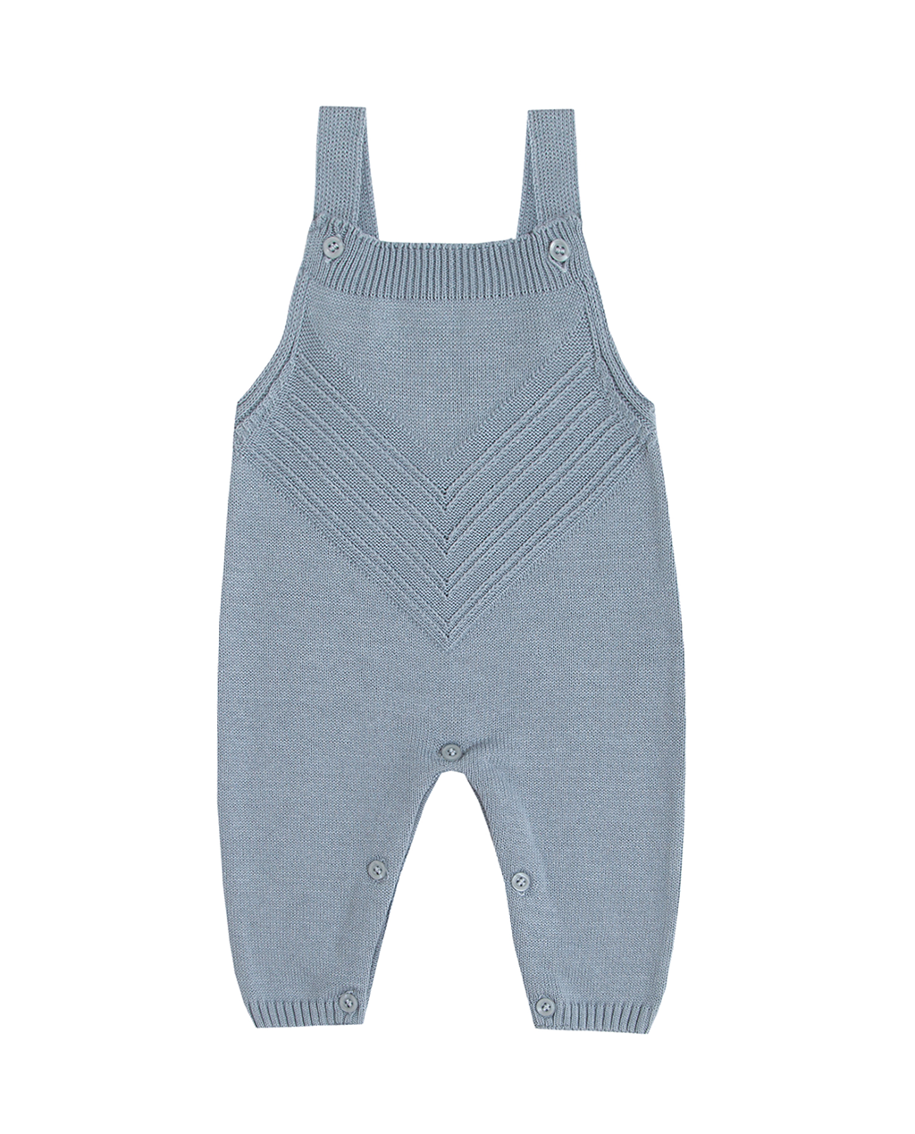 Jardineira em tricot com abotoamento nas alças e nas entrepernas para facilitar a troca do bebê.