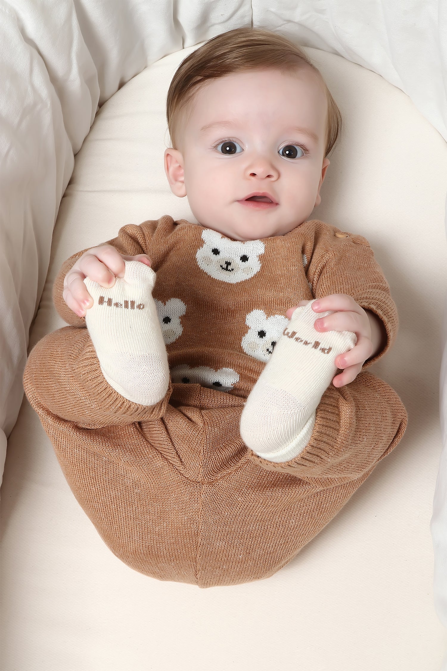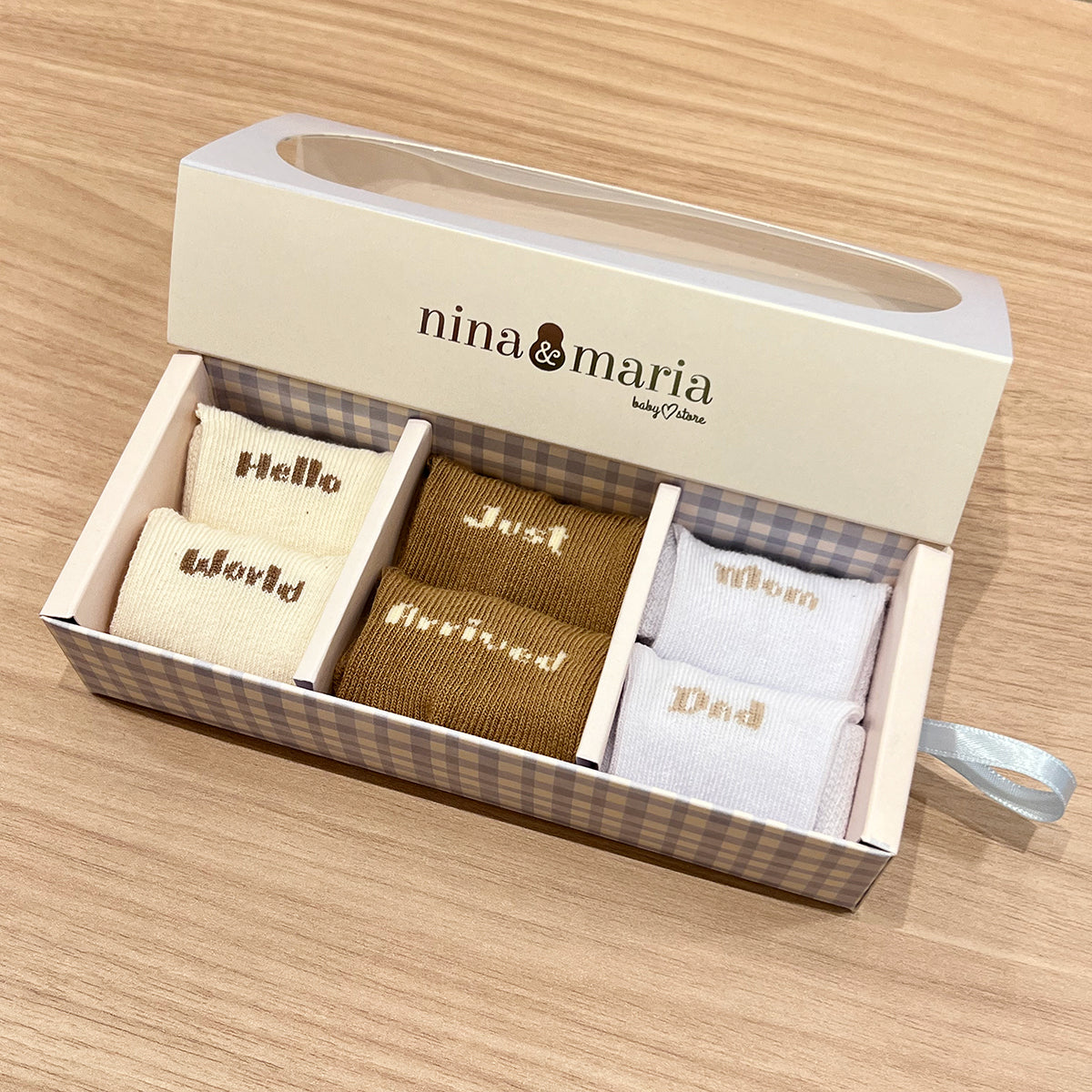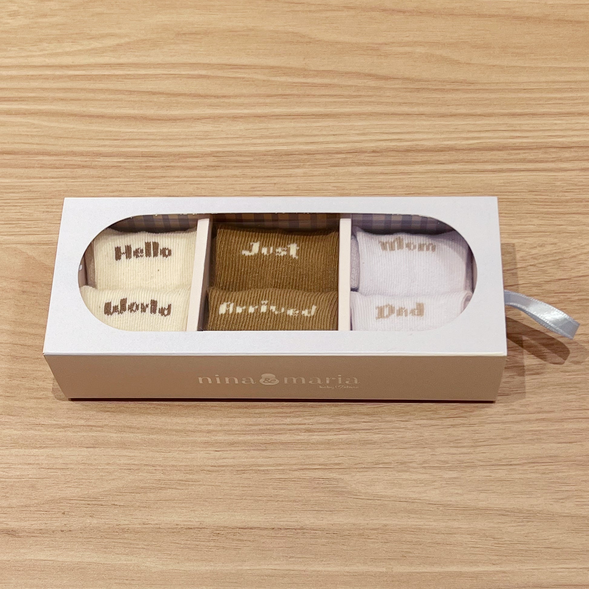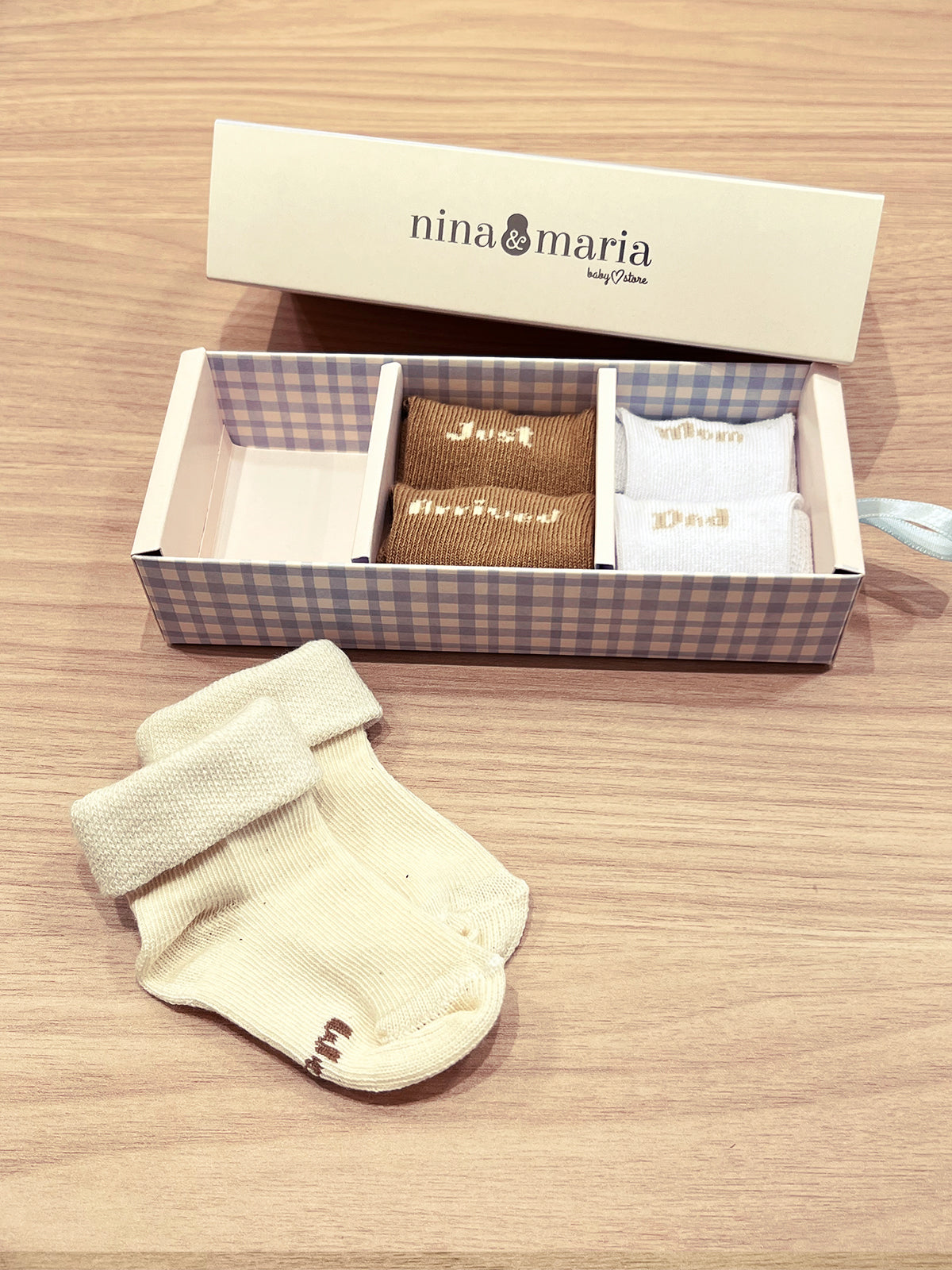 Kit com 3 pares de meias unissex com escrito na sola do pezinho.