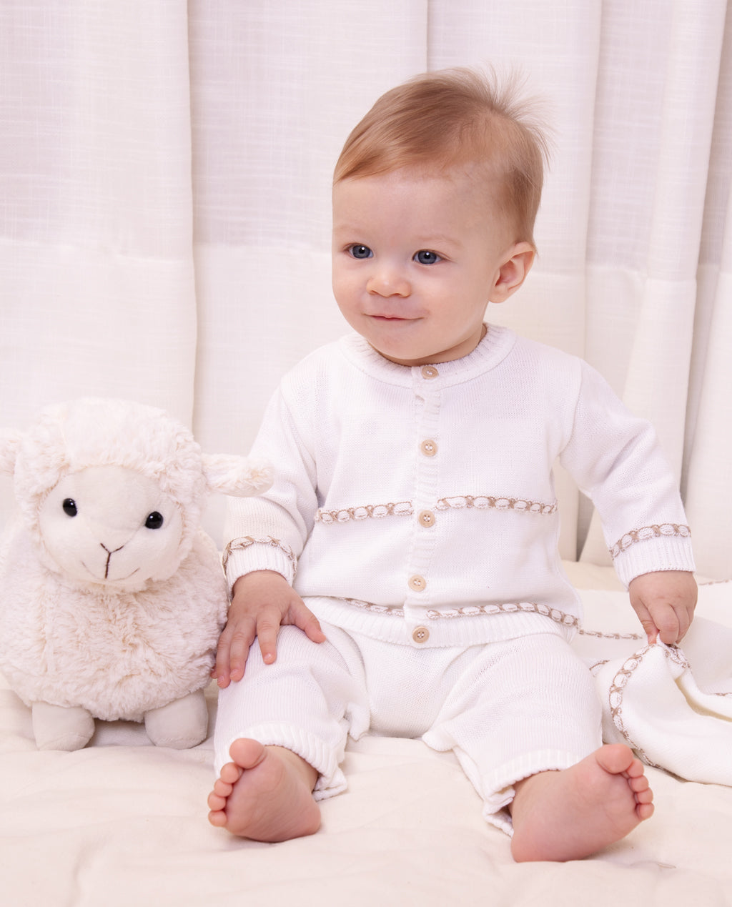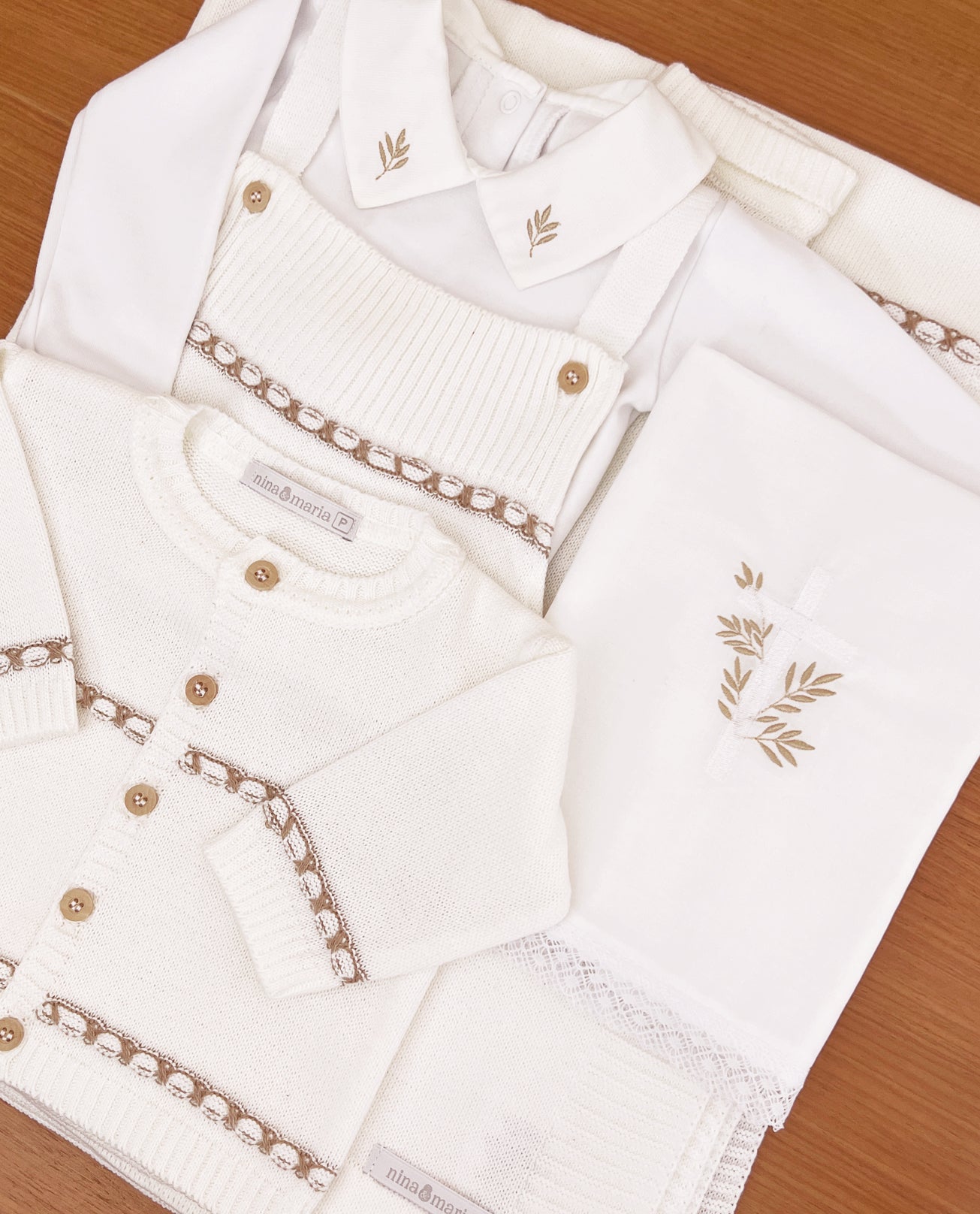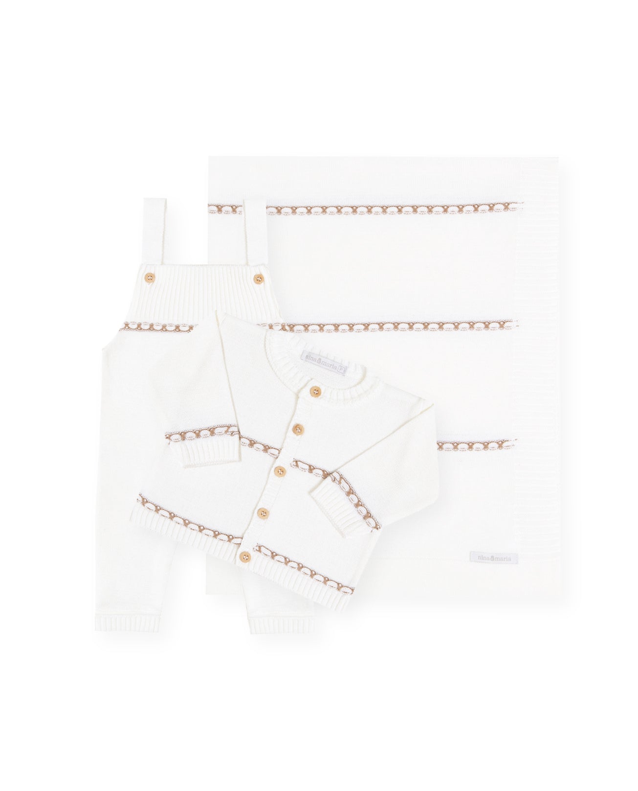 Kit com 3 peças em tricot: Casaquinho com detalhes em ponto especial bege, com botões em madeira, jardineira sem pé com abotoamento nas alças para facilitar a troca do bebê e manta de tricot com o mesmo trabalho do casaquinho.