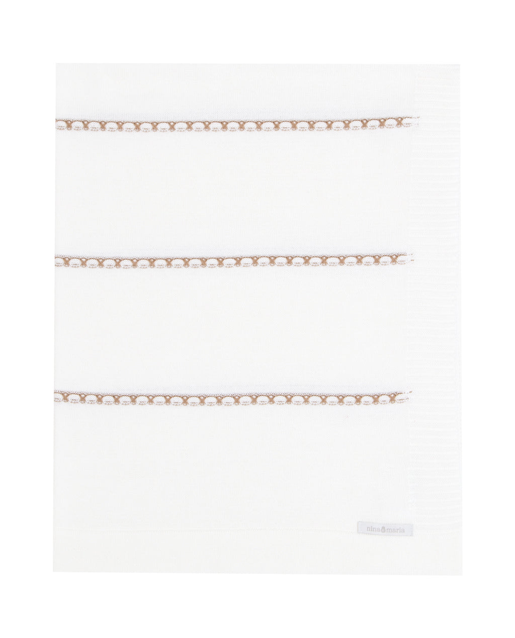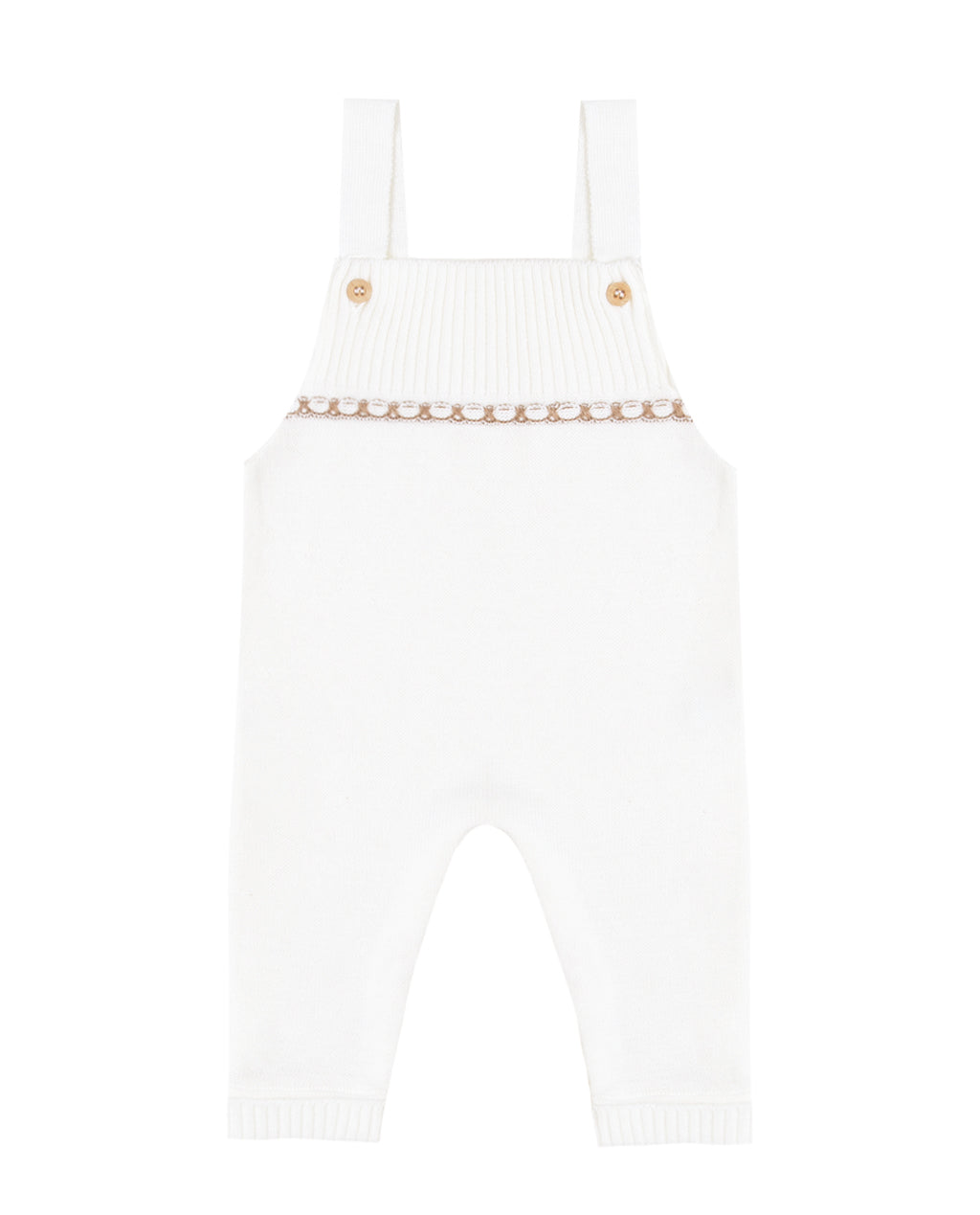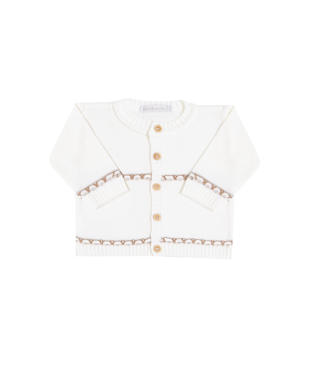 Kit com 3 peças em tricot: Casaquinho com detalhes em ponto especial bege, com botões em madeira, jardineira sem pé com abotoamento nas alças para facilitar a troca do bebê e manta de tricot com o mesmo trabalho do casaquinho.