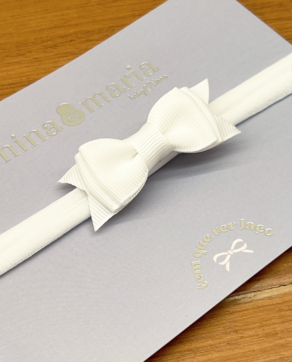 Lacinho de cabelo branco em fita de gorgurão no bico de pato antiderrapante com opção de usar na faixinha ou sem para bebês com ou sem cabelos, fácil de prender e não machuca a cabeça do bebê.