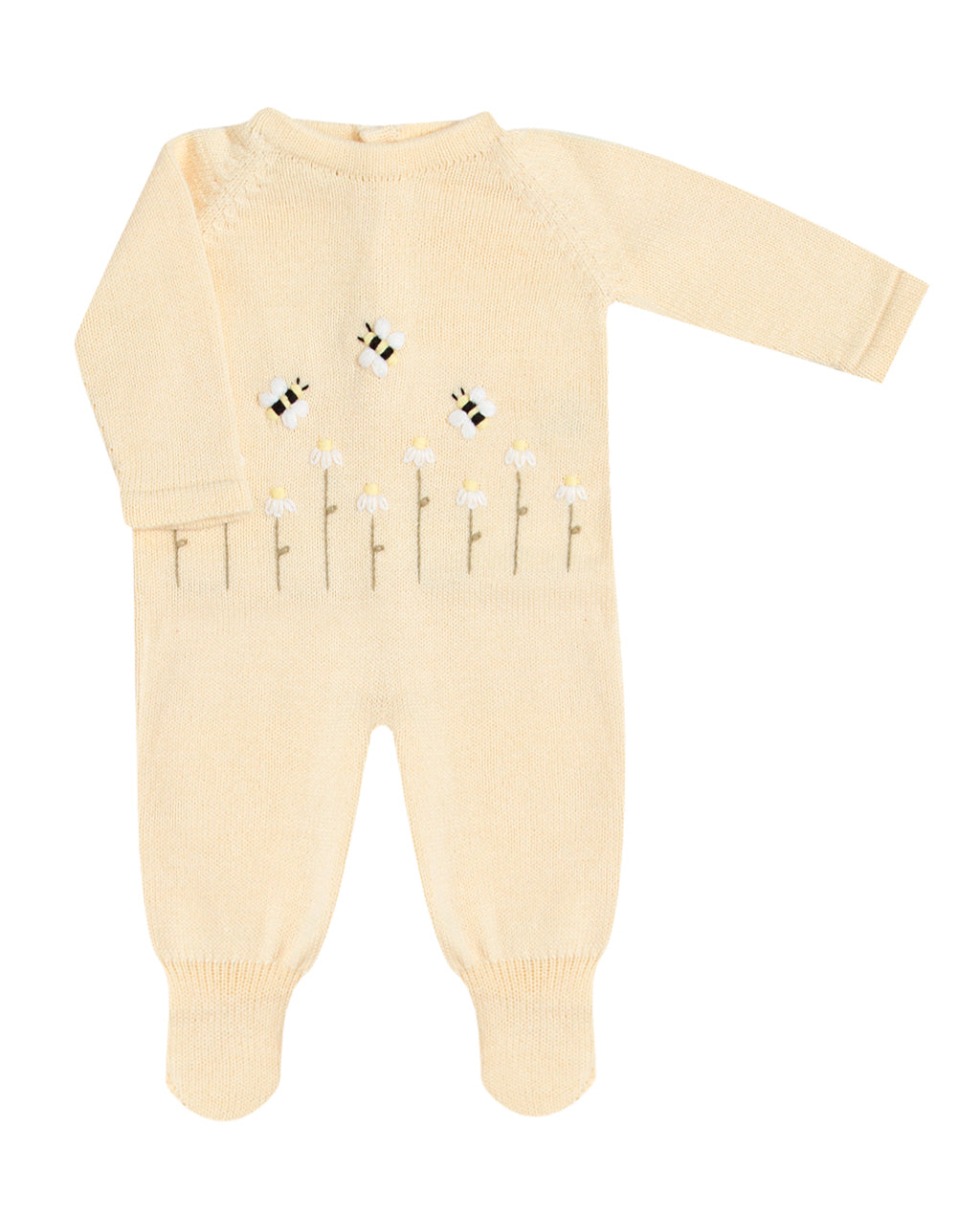 Macacão feminino com bordado à mão de abelhinhas com flores. Possui abotoamento nas entrepernas e nas costas para facilitar a troca do bebê.