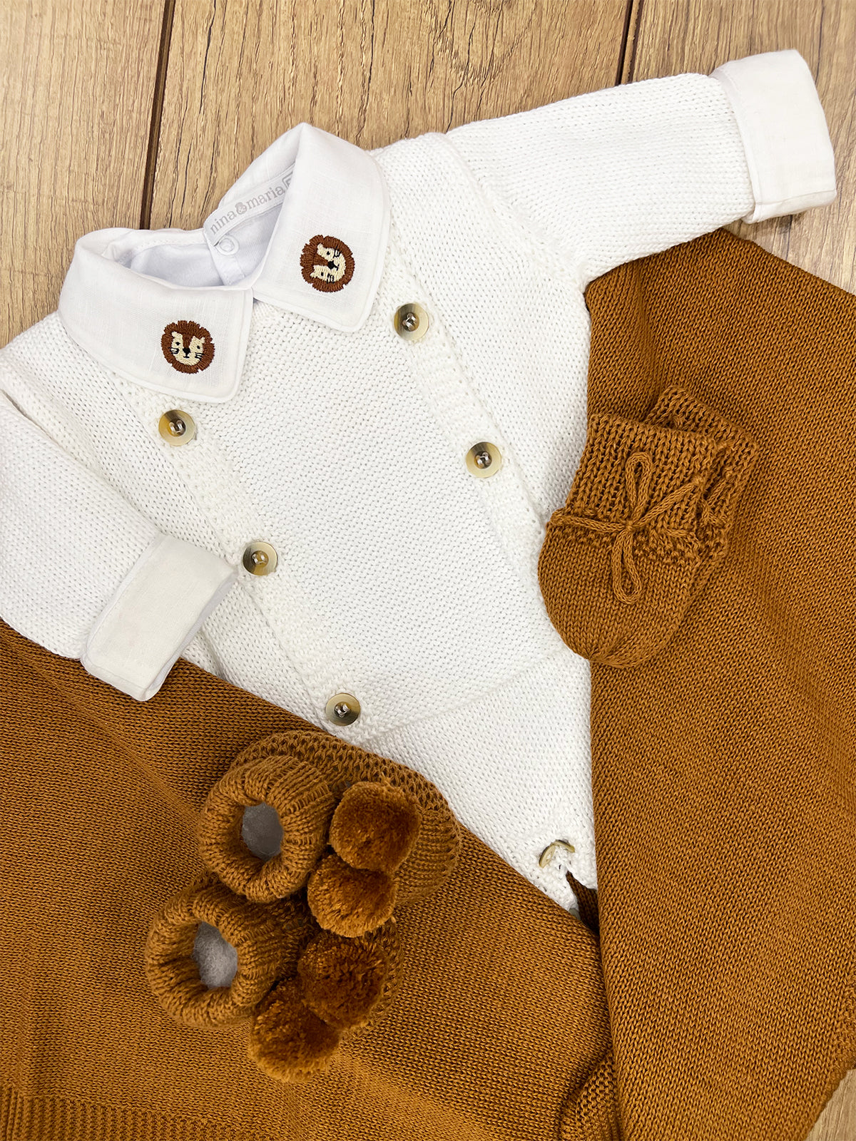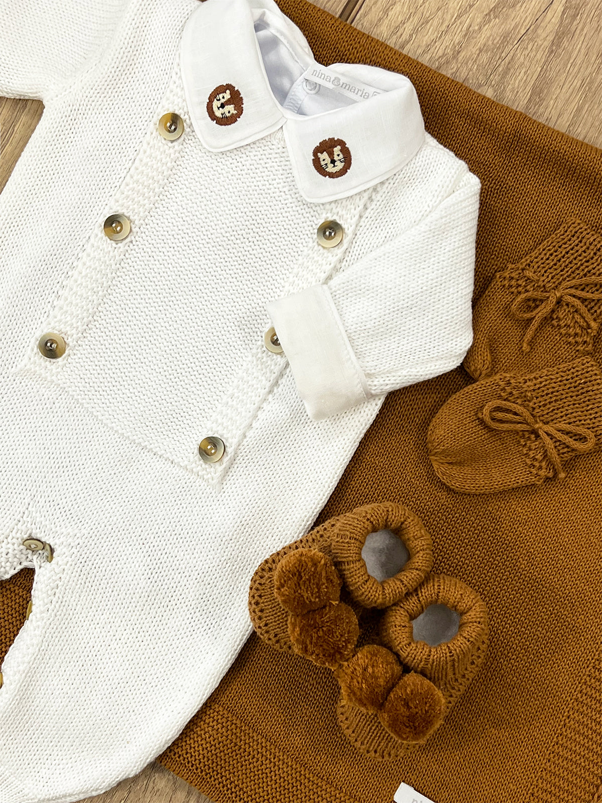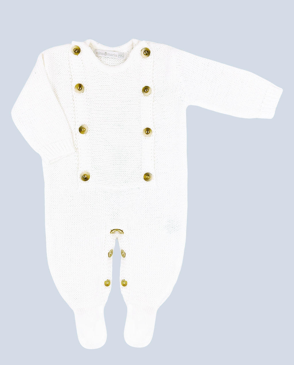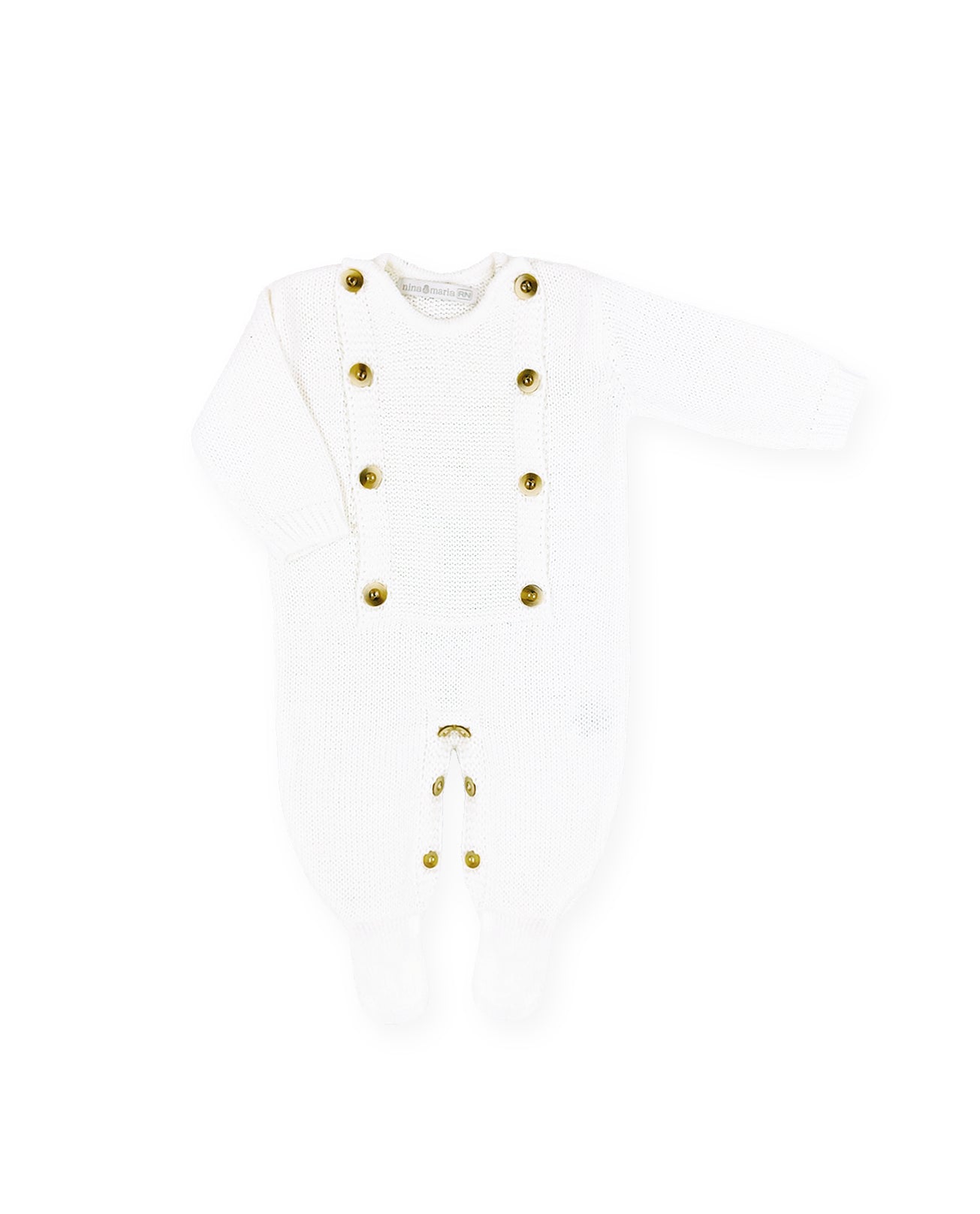 Macacão branco em tricot com abertura frontal em botões, além de estiloso facilita muito a troca do bebê.