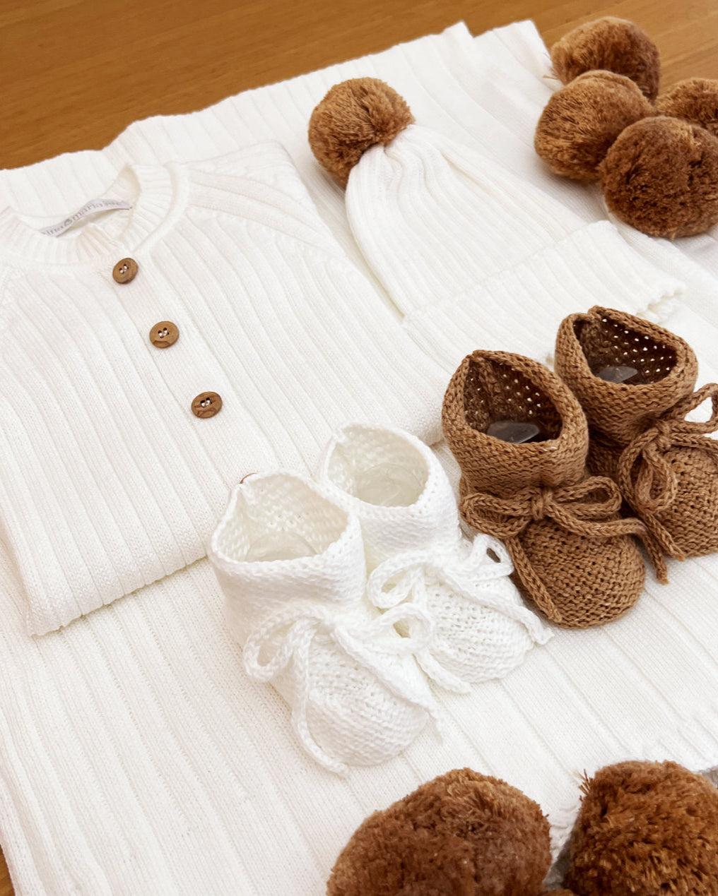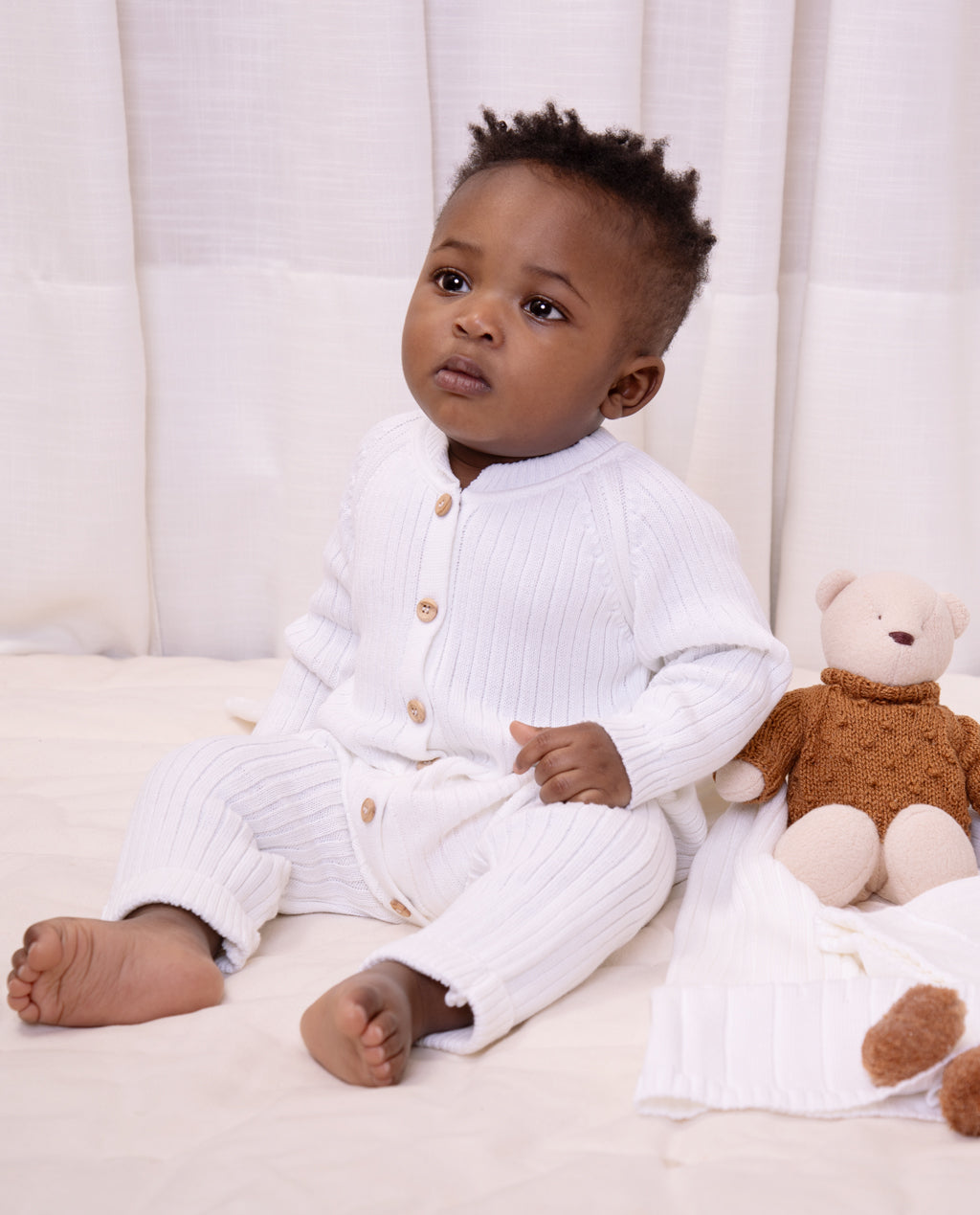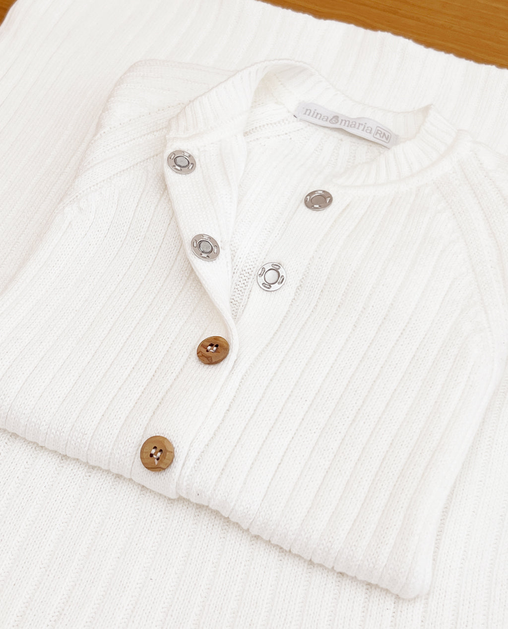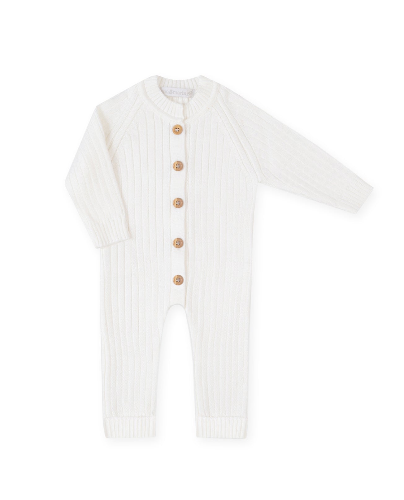 Macacão em tricot canelado com abotoamento frontal em imã para facilitar a troca do bebê.