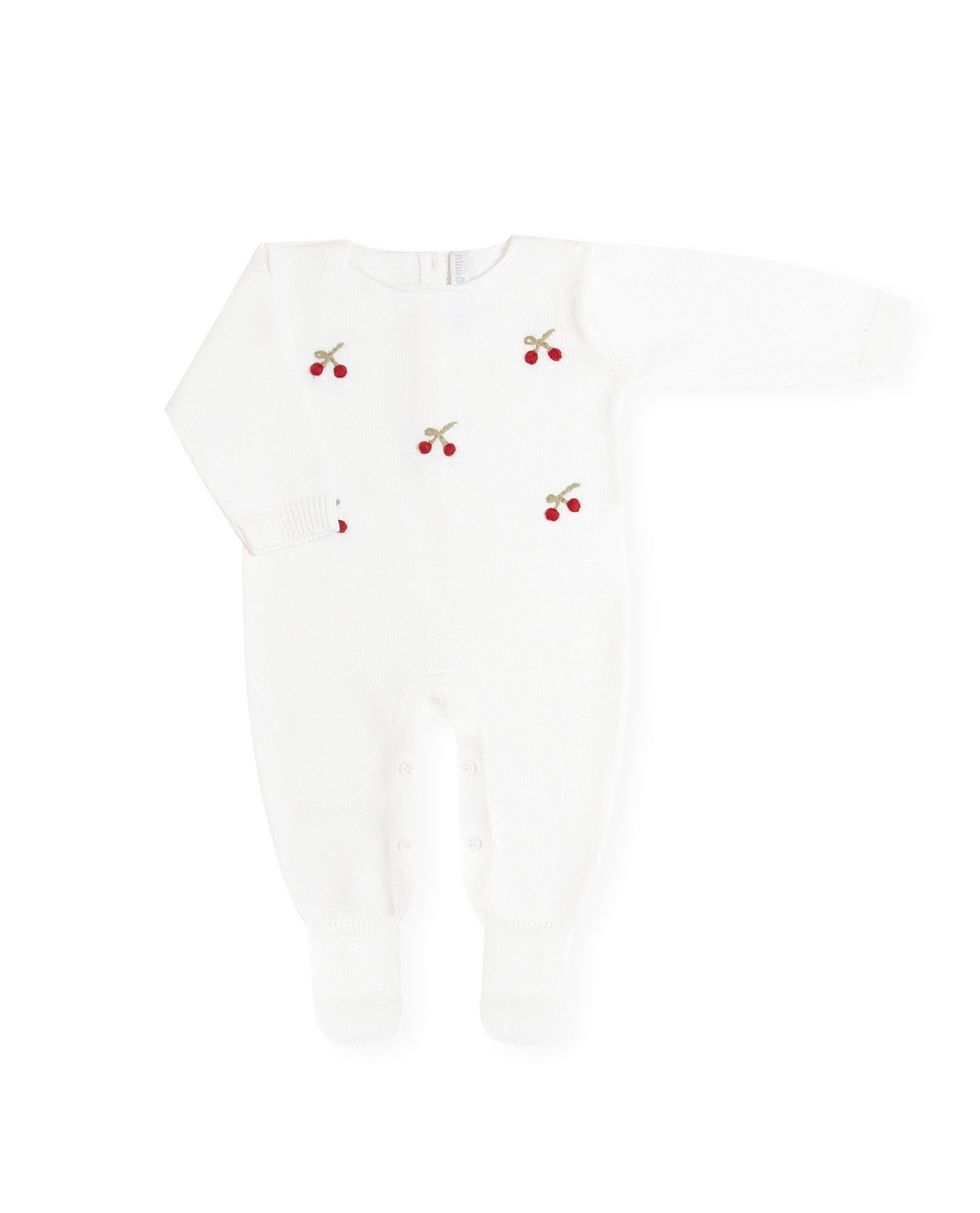 Macacão feminino de tricot branco com delicado bordado de cerejas feito à mão. Possui abotoamento nas entrepernas e nas costas para facilitar a troca do bebê.