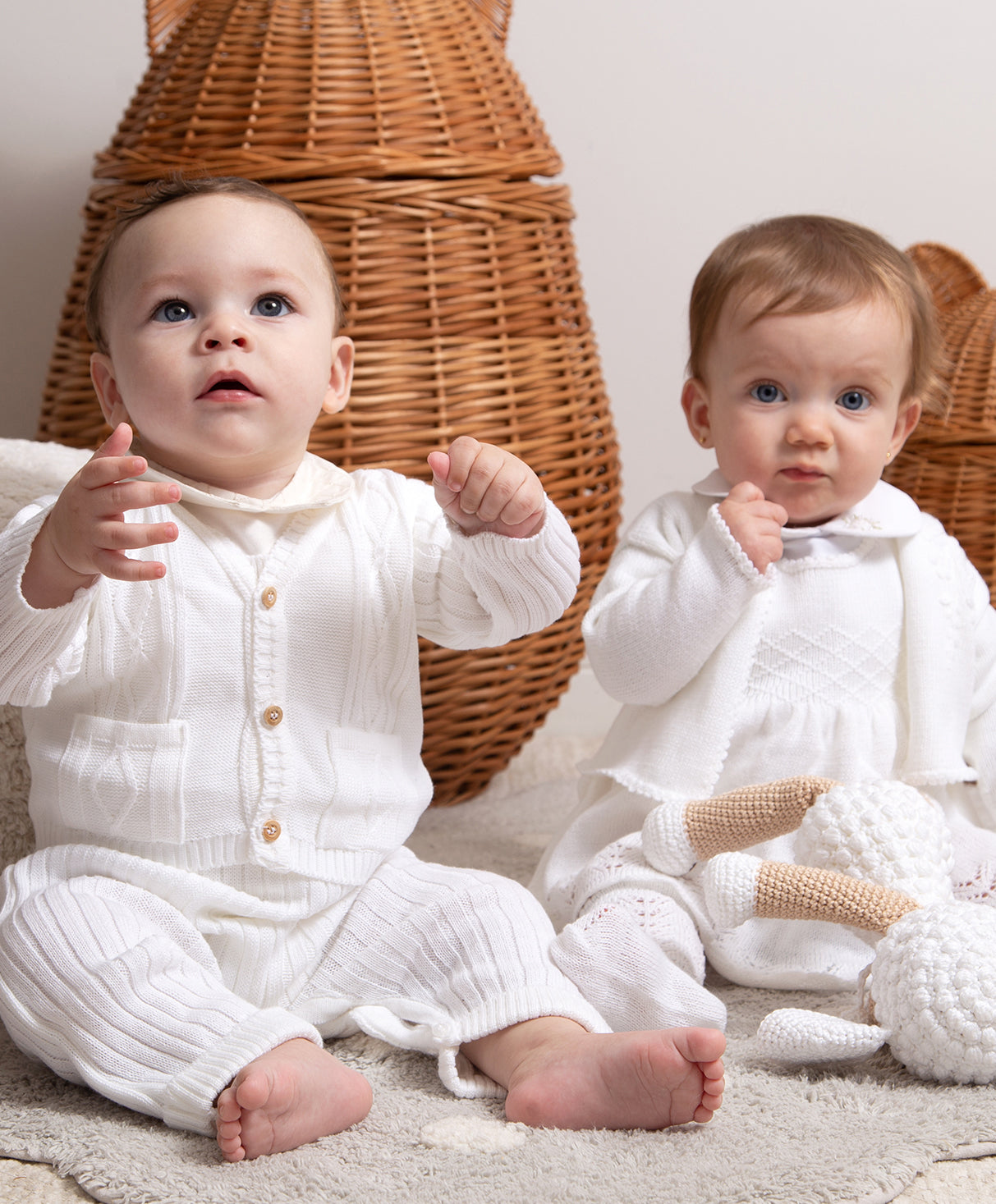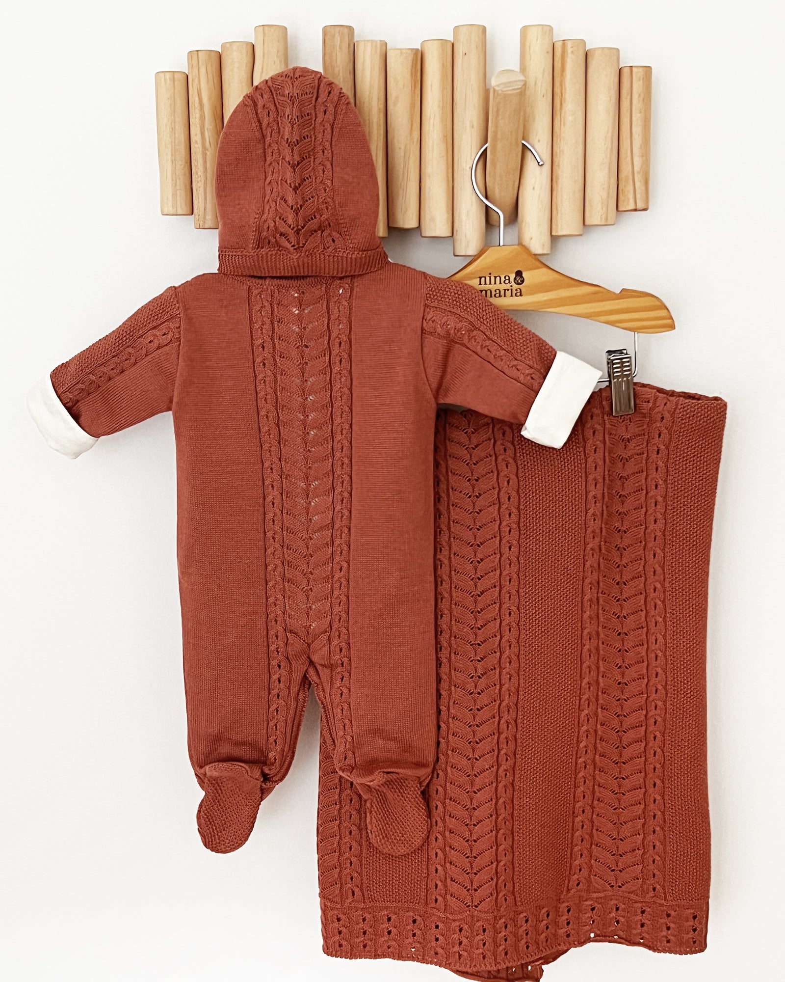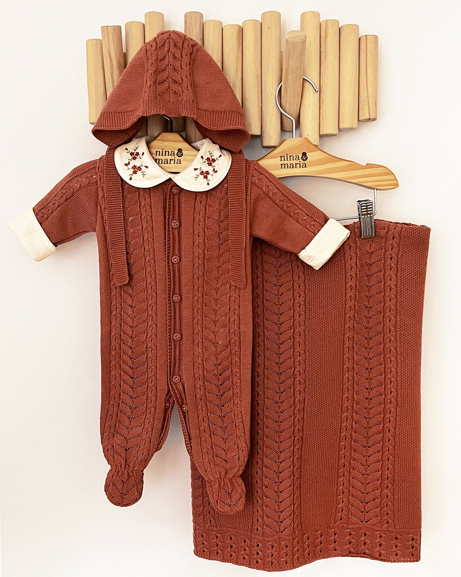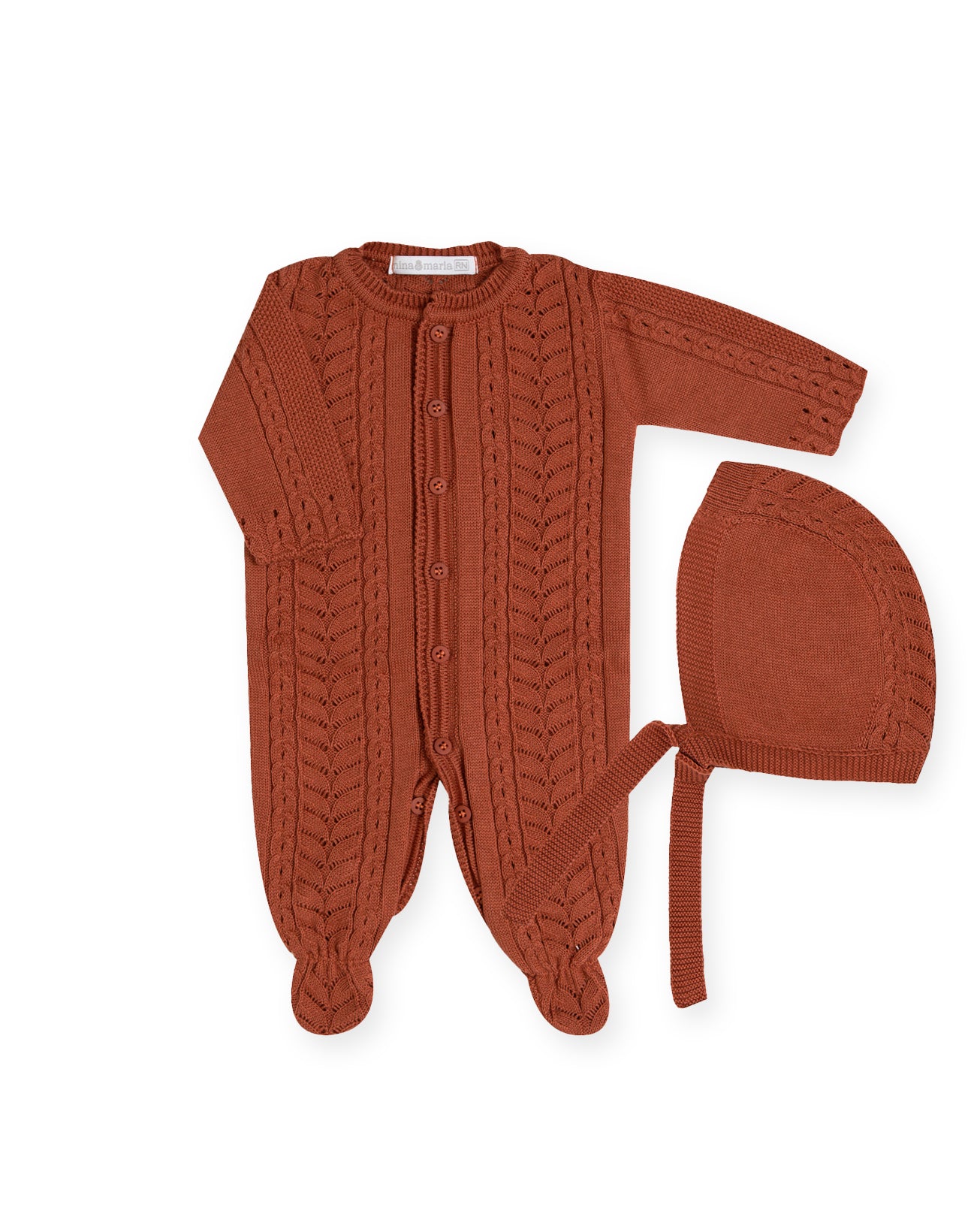 Macacão feminino em tricot trabalhado com botões frontais para facilitar a troca do bebê, vem com touquinha de amarrar.