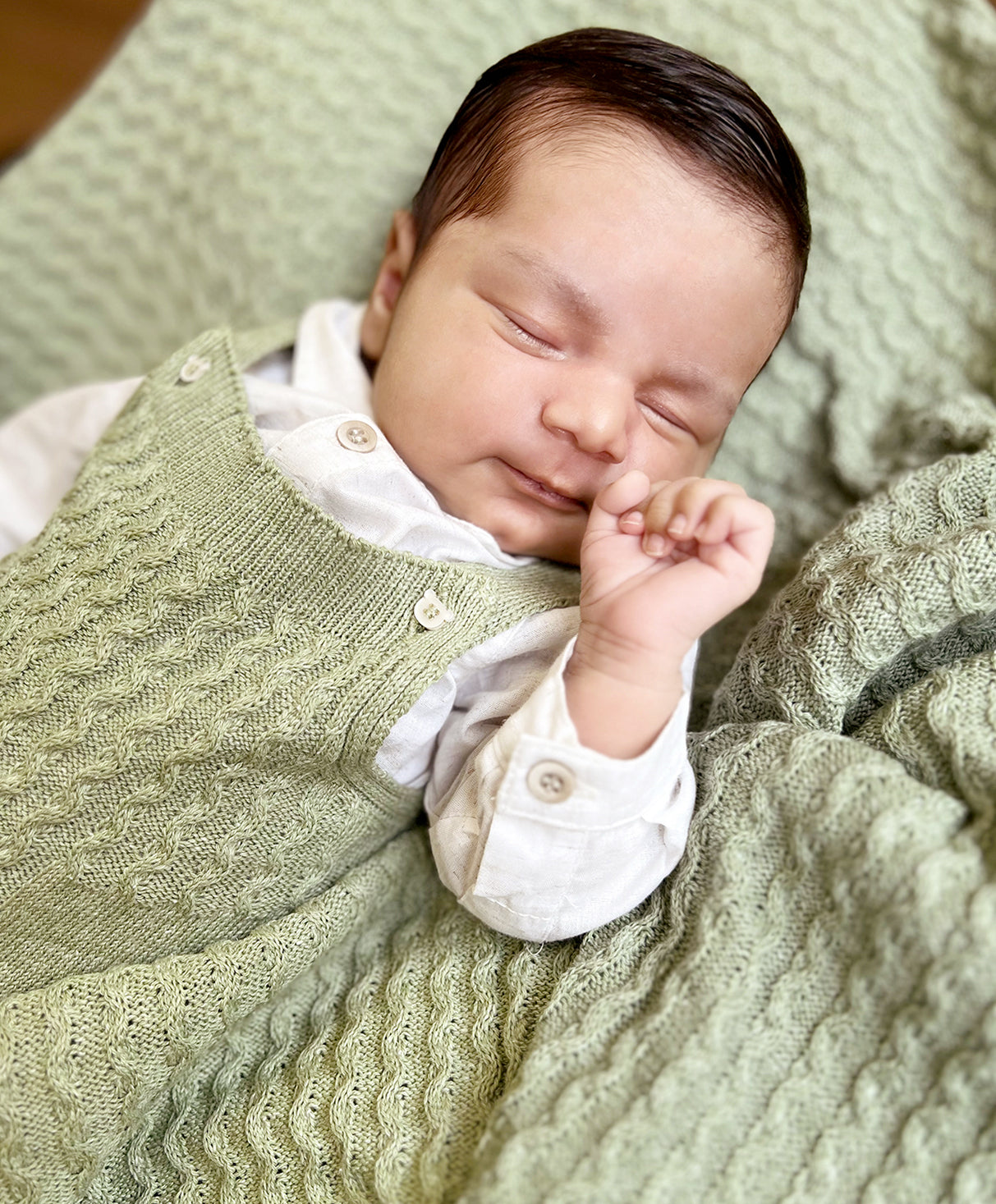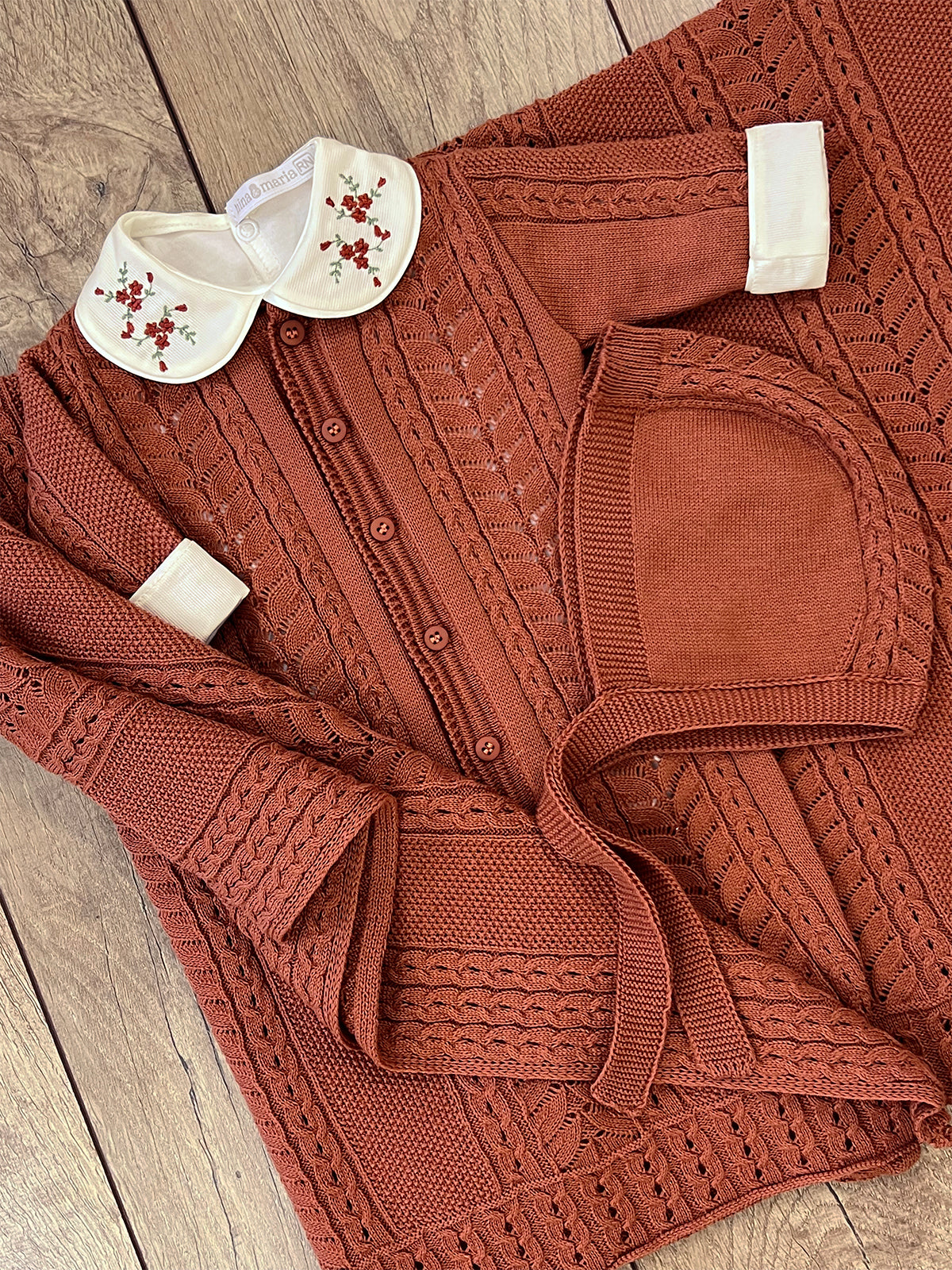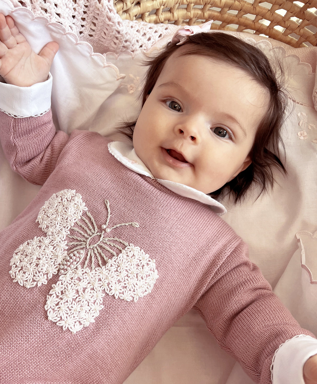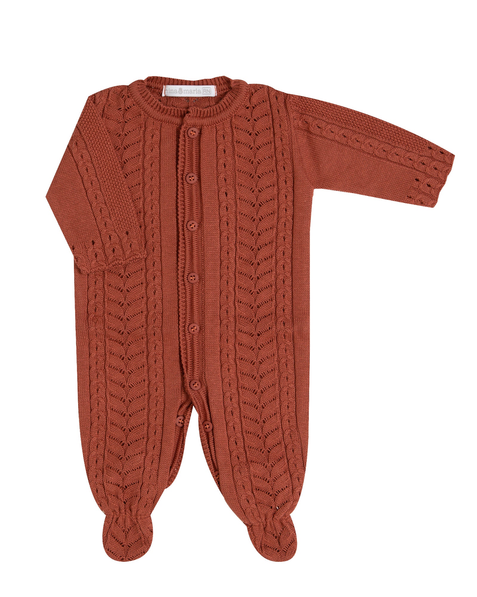 Macacão feminino em tricot trabalhado com botões frontais para facilitar a troca do bebê, vem com touquinha de amarrar.
