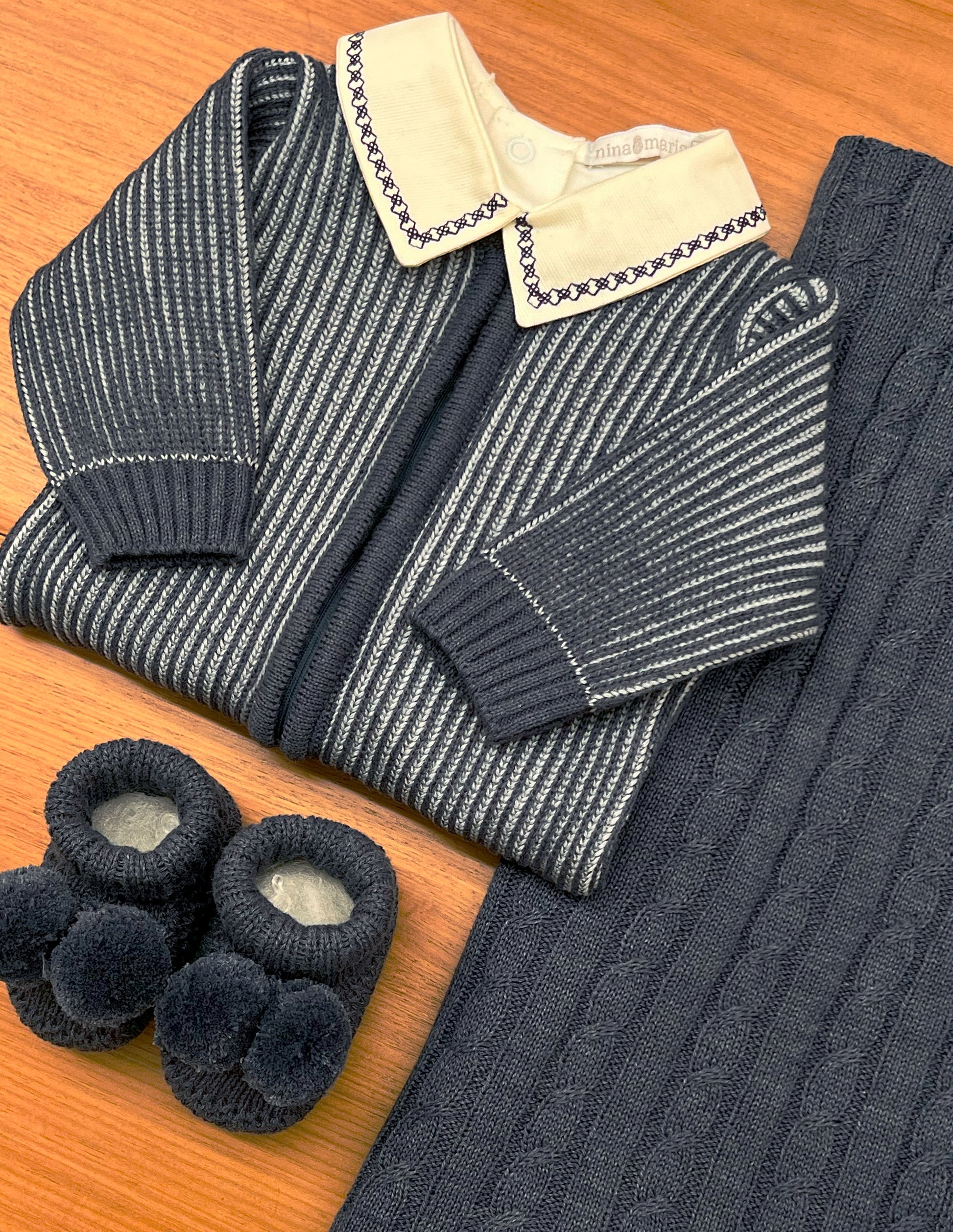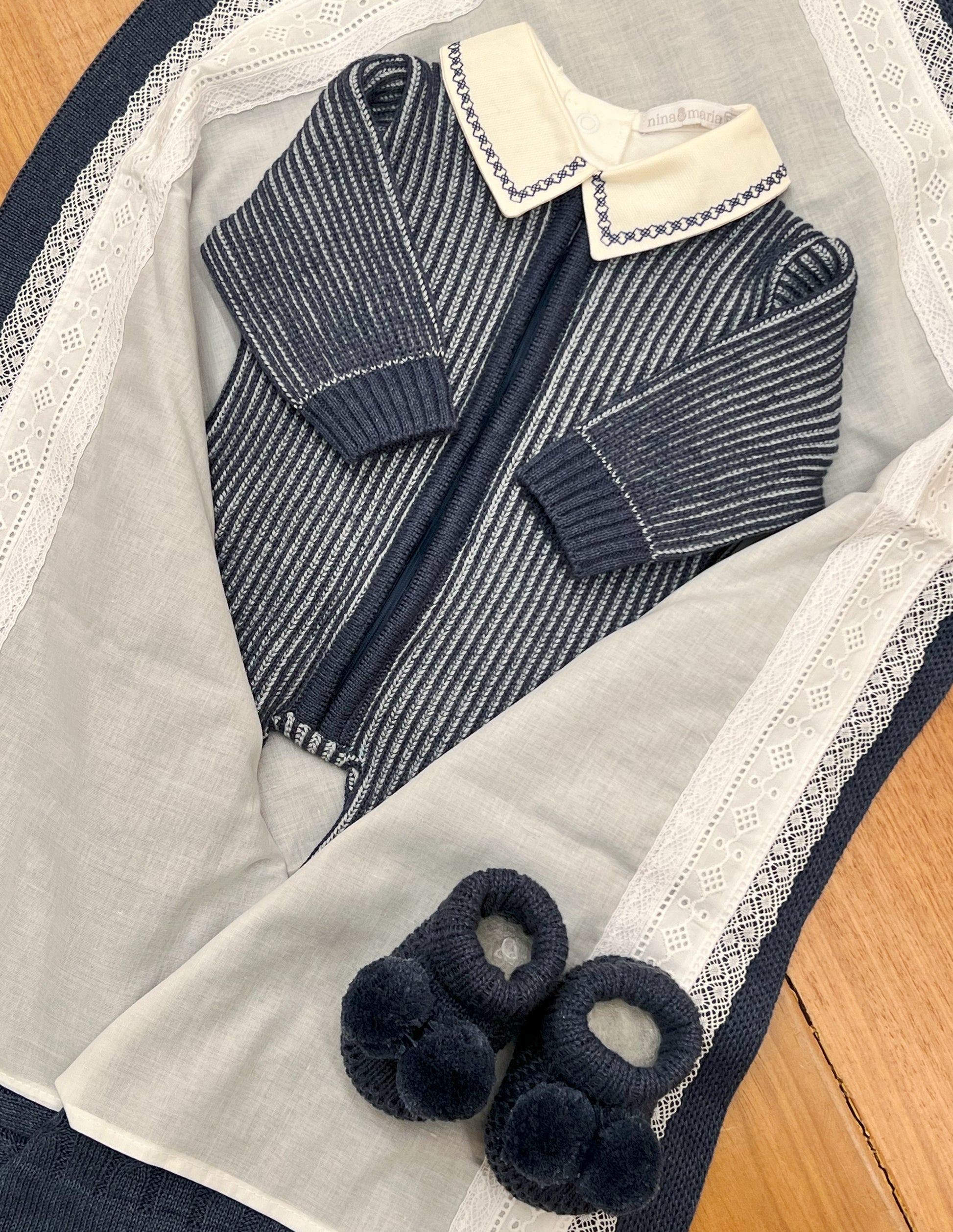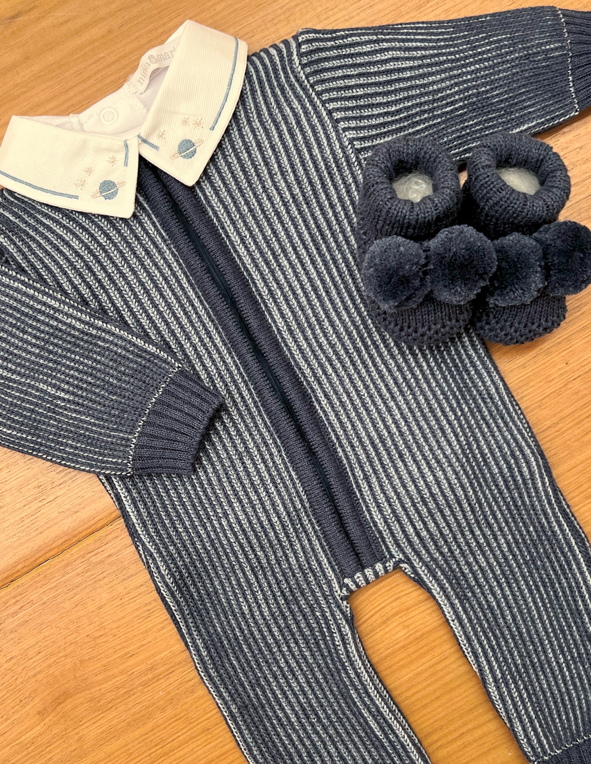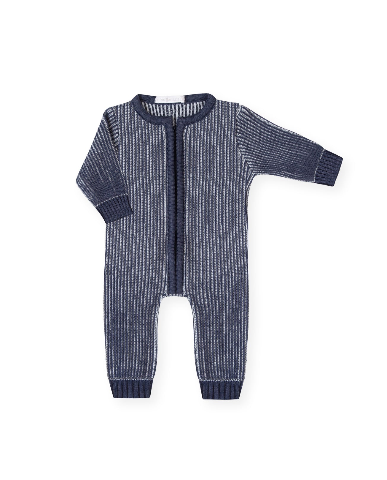Macacão de tricot texturizado em dois tons com fechamento de zíper embutido para facilitar a troca do bebê.