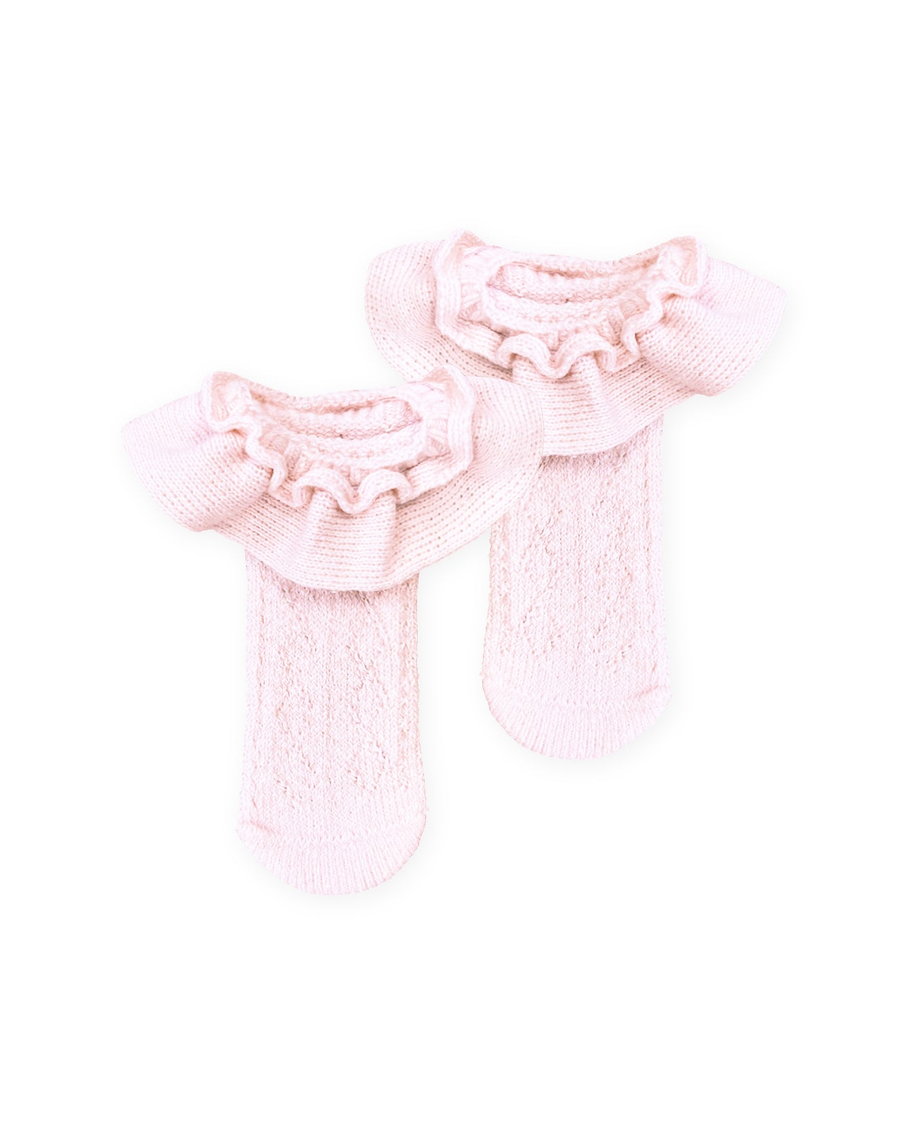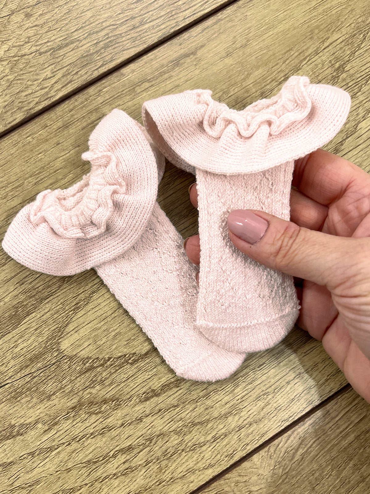 Meia em tricot rosa com trabalho rendado e babadinho no próprio tricot.