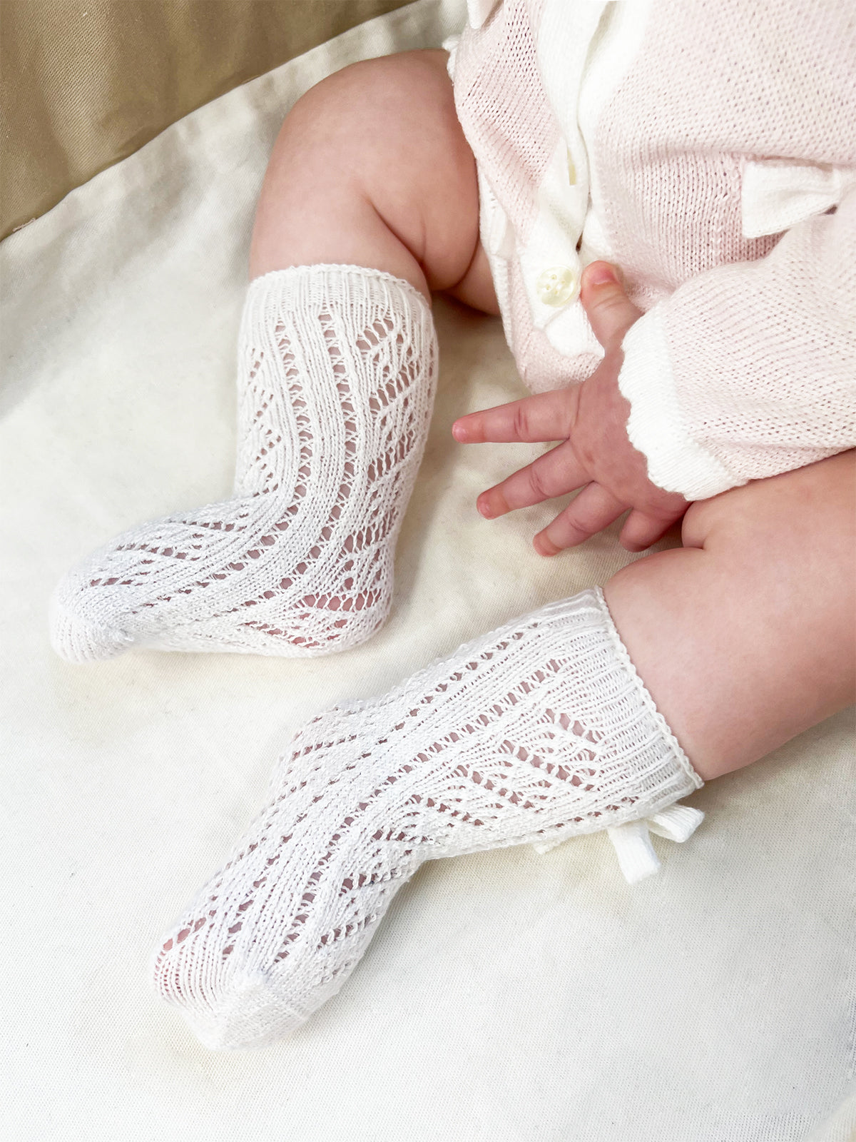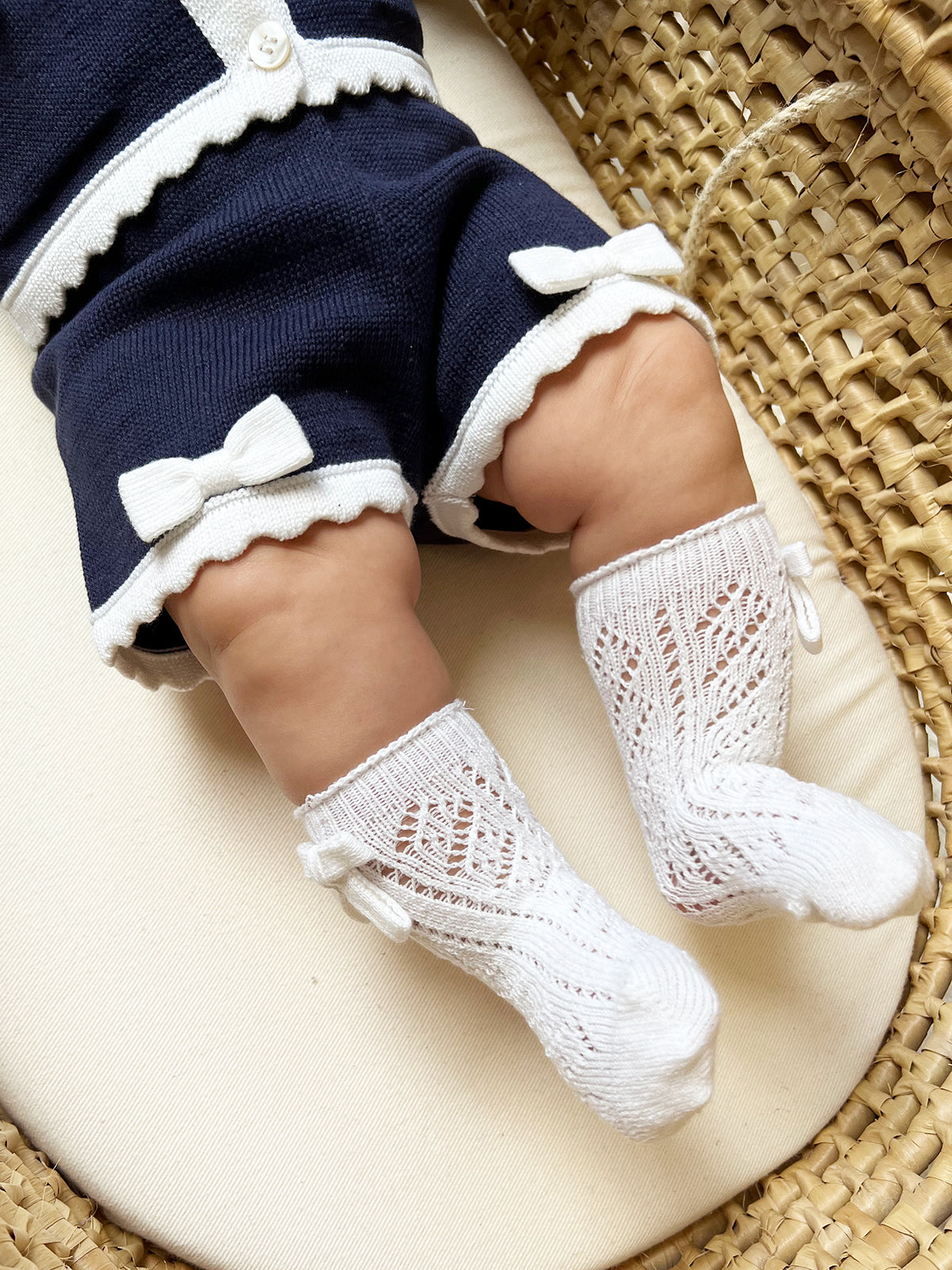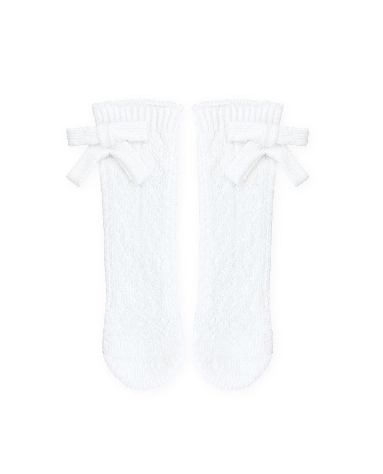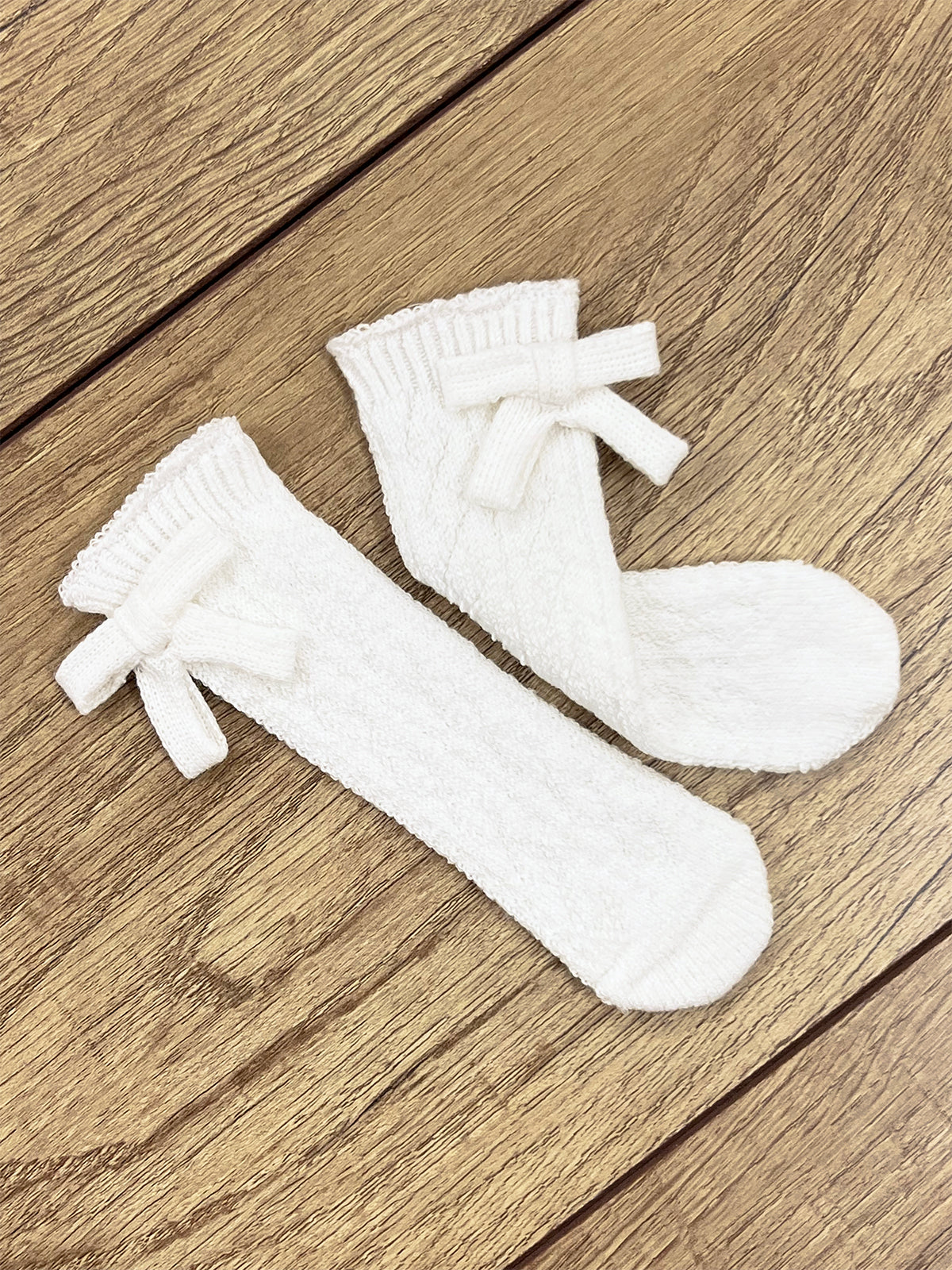 Meia feminina em tricot branca com trabalho rendado e aplique de lacinho no próprio tricot.