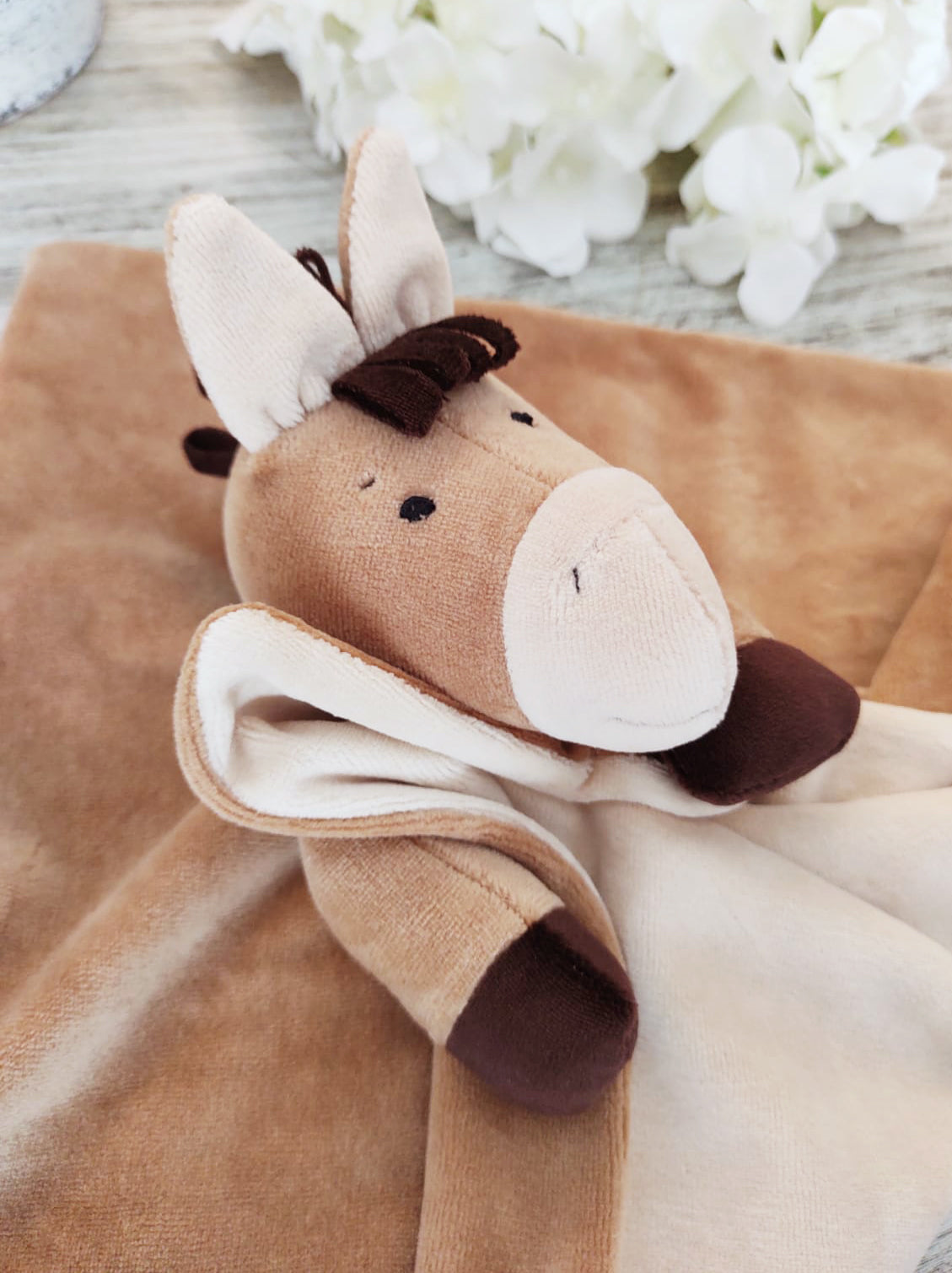 Naninha de Cavalo, confeccionada à mão pelas mais habilidosas artesãs. Utilizamos plush duplo extra macio para garantir um toque suave à delicada pele do bebê.