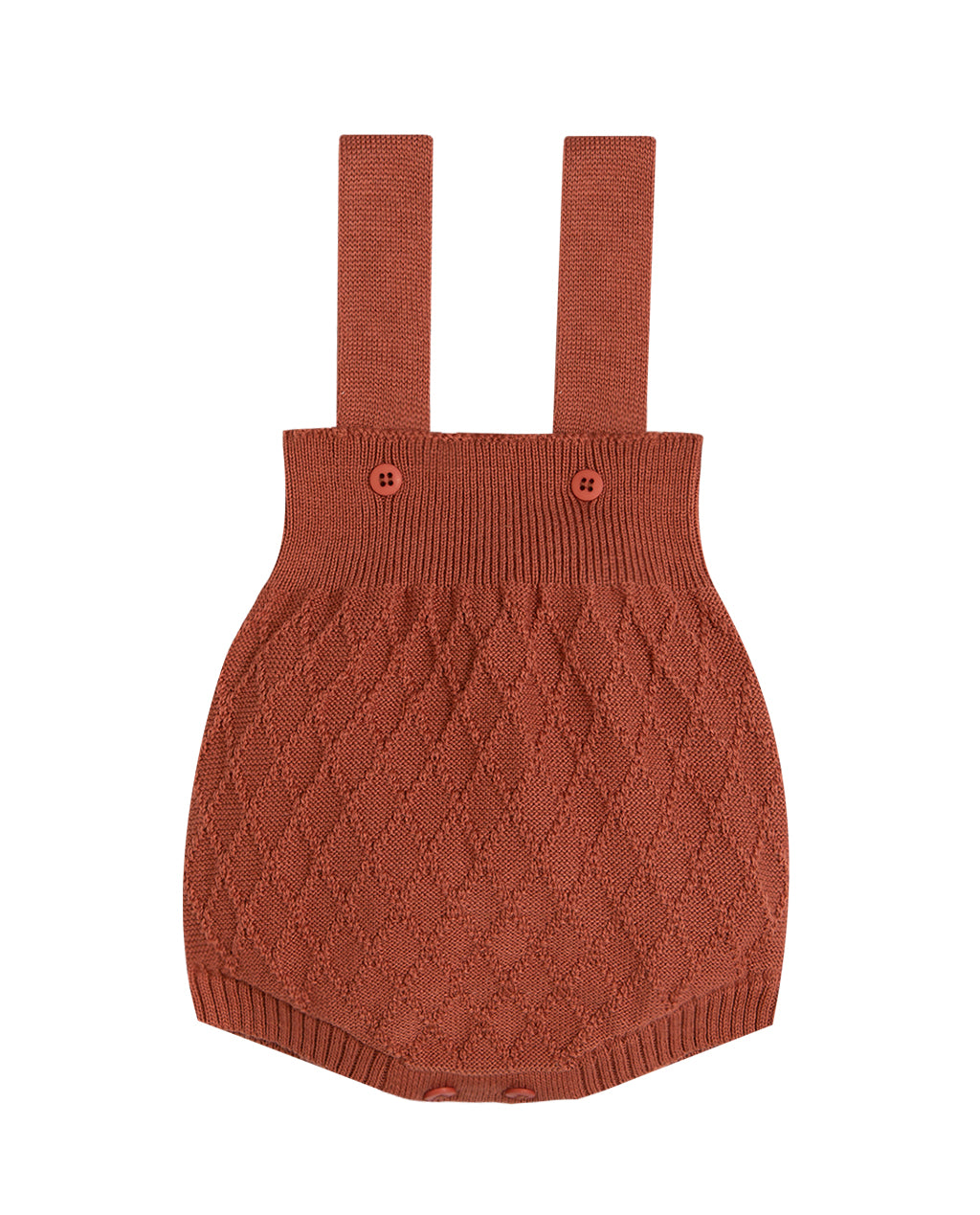 Jardineira masculina em tricot para bebê com ajuste nas alças e trabalho de losangos.