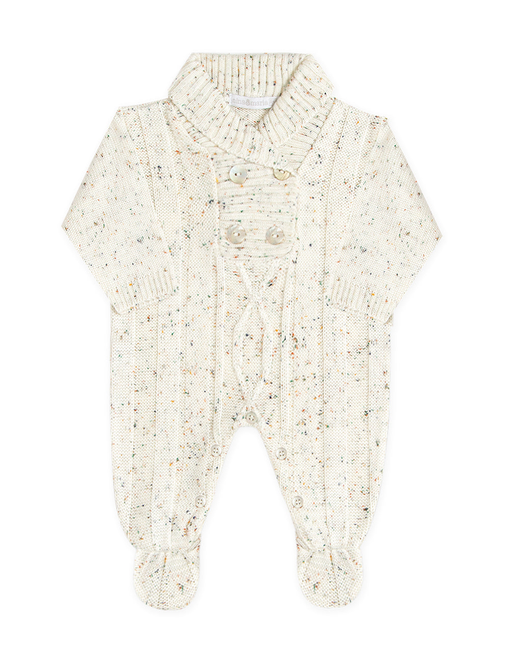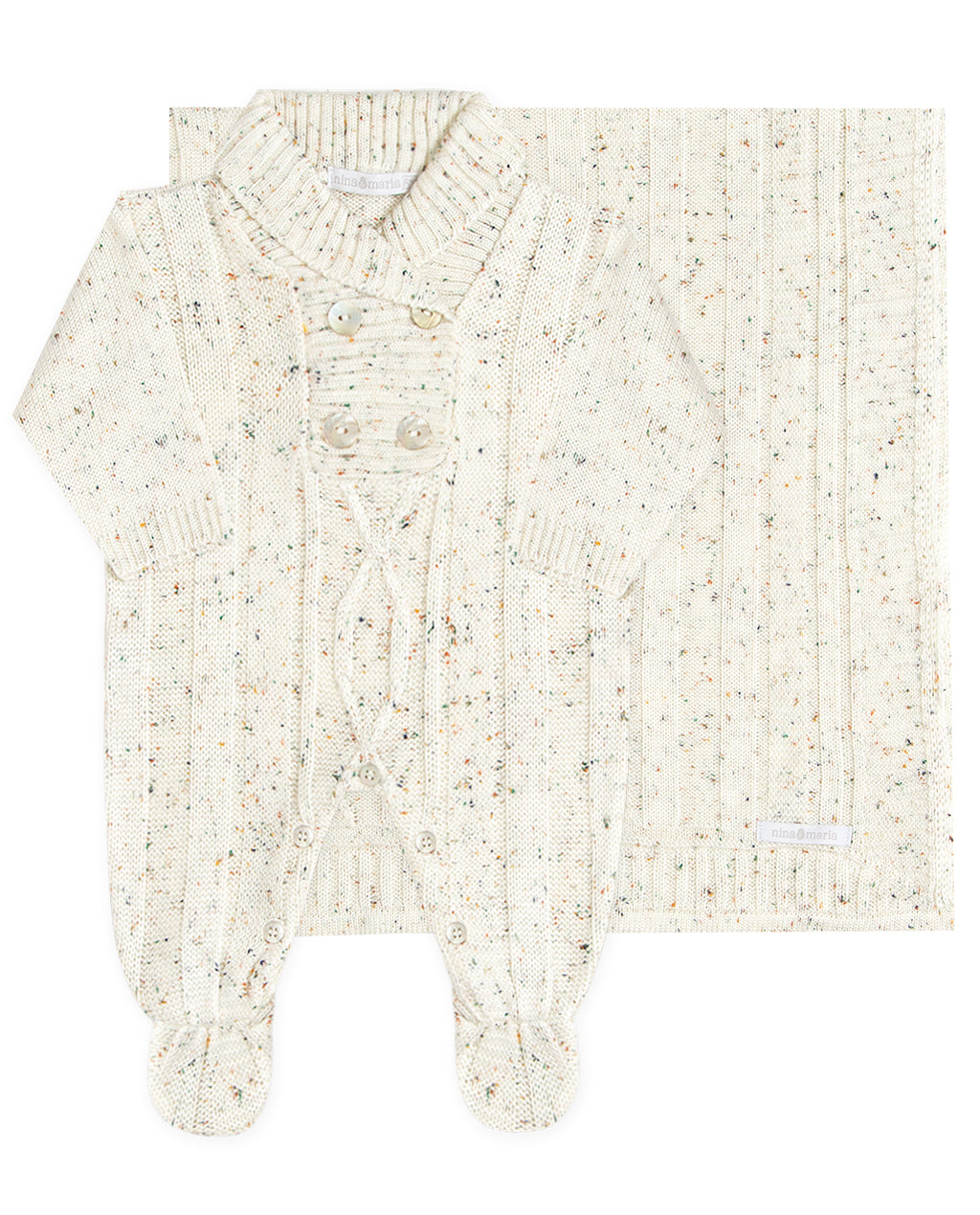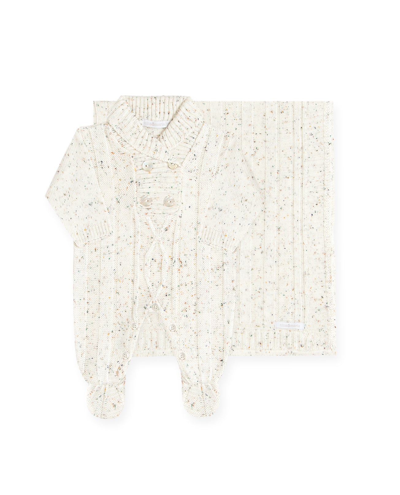 Saída de maternidade em tricot mesclado com duas peças: macacão com botões no peito e na entrepernas para facilitar troca da fralda e manta de tricot com medida aproximada: 90 x 80 cm.