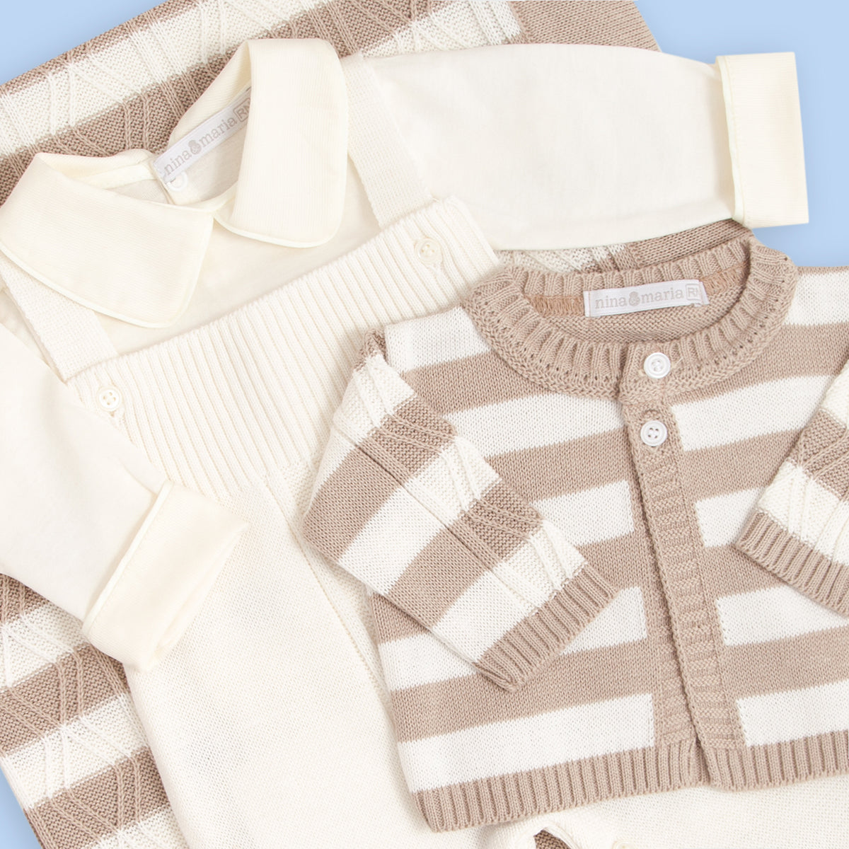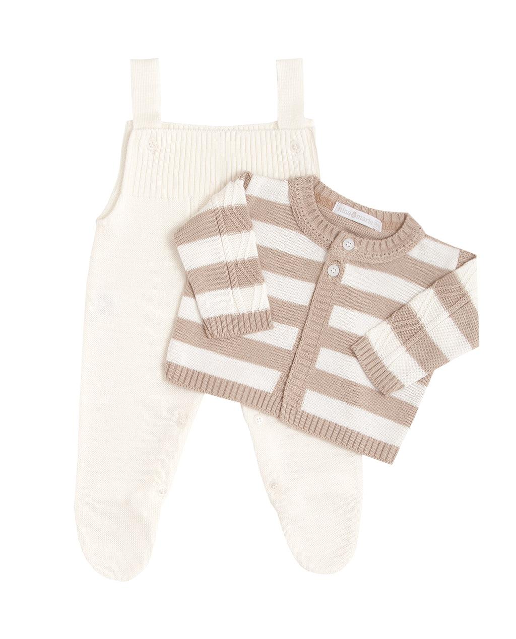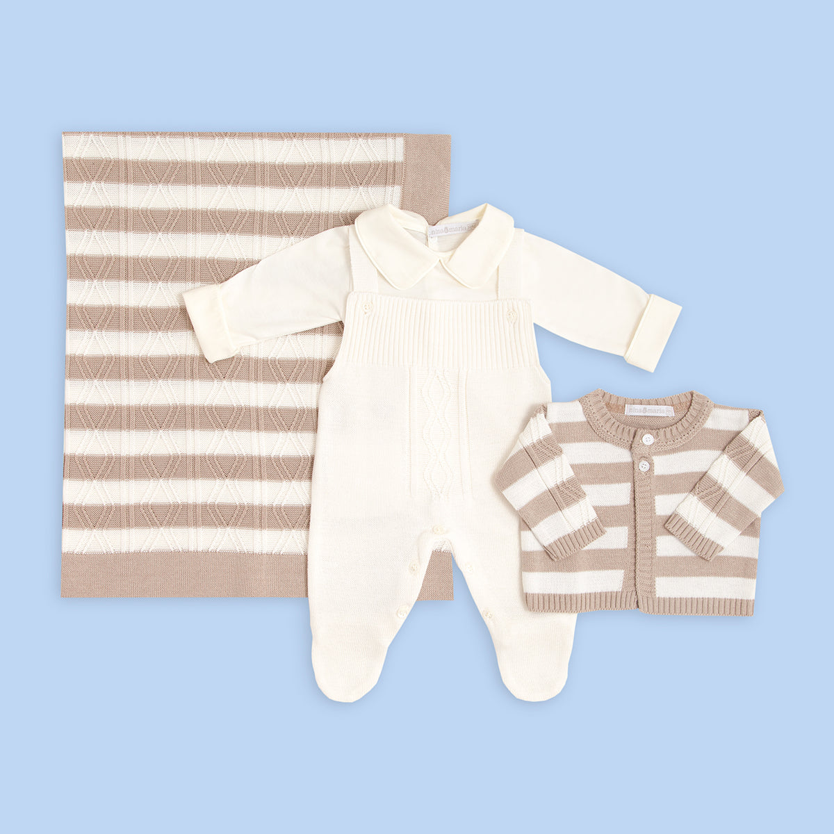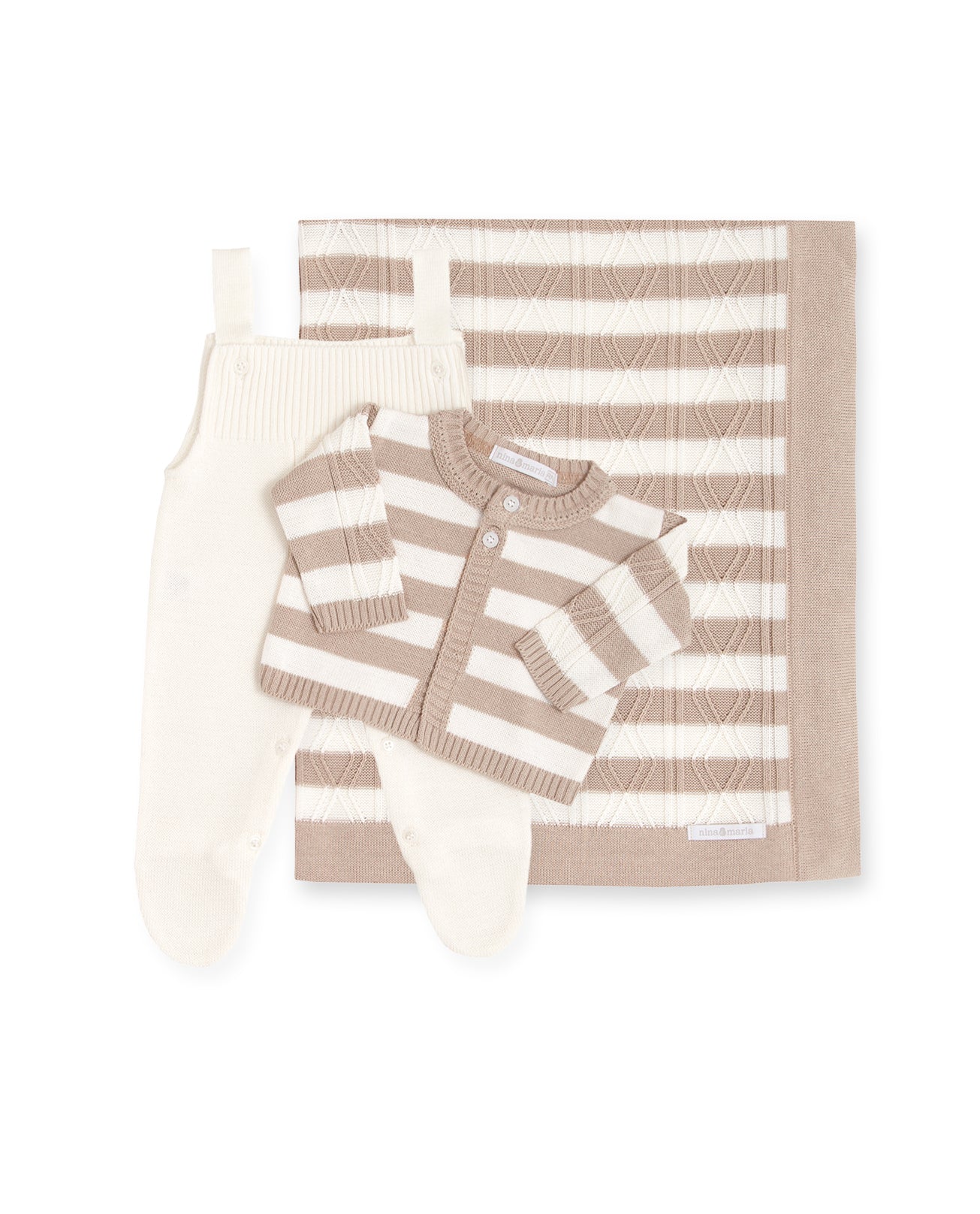 Kit saída de maternidade bege e cru. Jardineira com abotoamento nas entrepernas e nas alças para facilitar a troca do bebê casaquinho em tricot listrado com trabalho trançado. Manta de tricot com o mesmo trabalho do casaquinho.