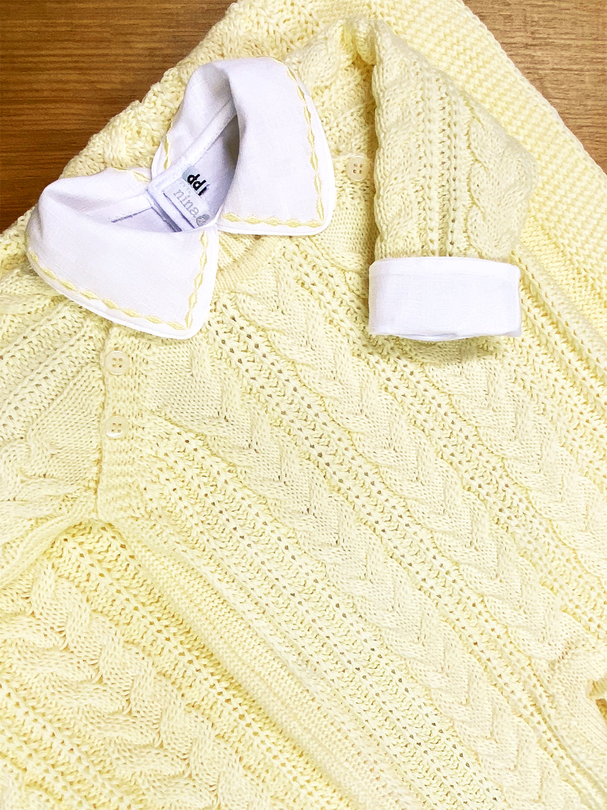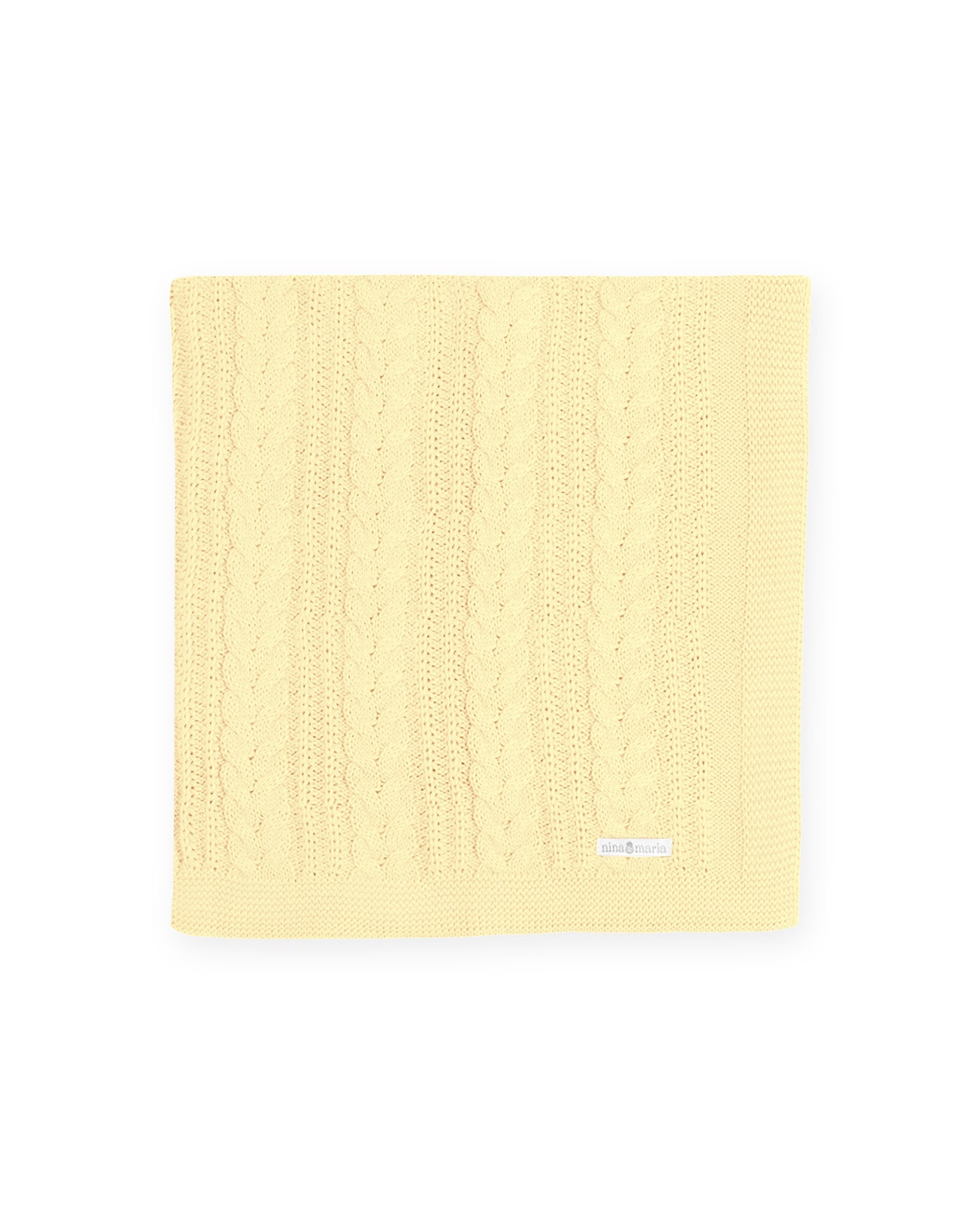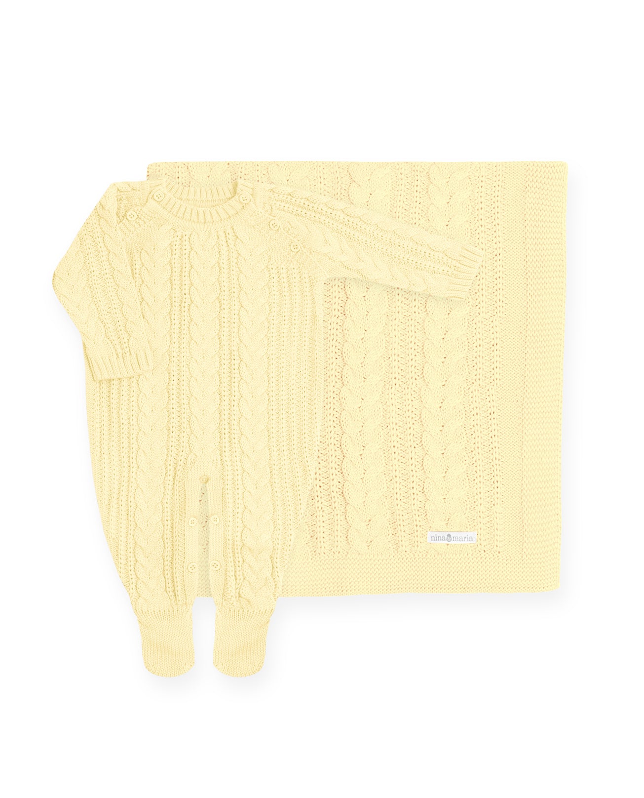 Saída de maternidade amarela 2 peças, macacão com abotoamento nas entrepernas e nos ombros para facilitar a troca do bebê e manta com o mestre trabalho de tricot.