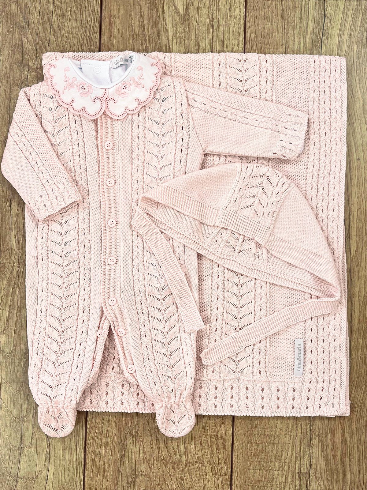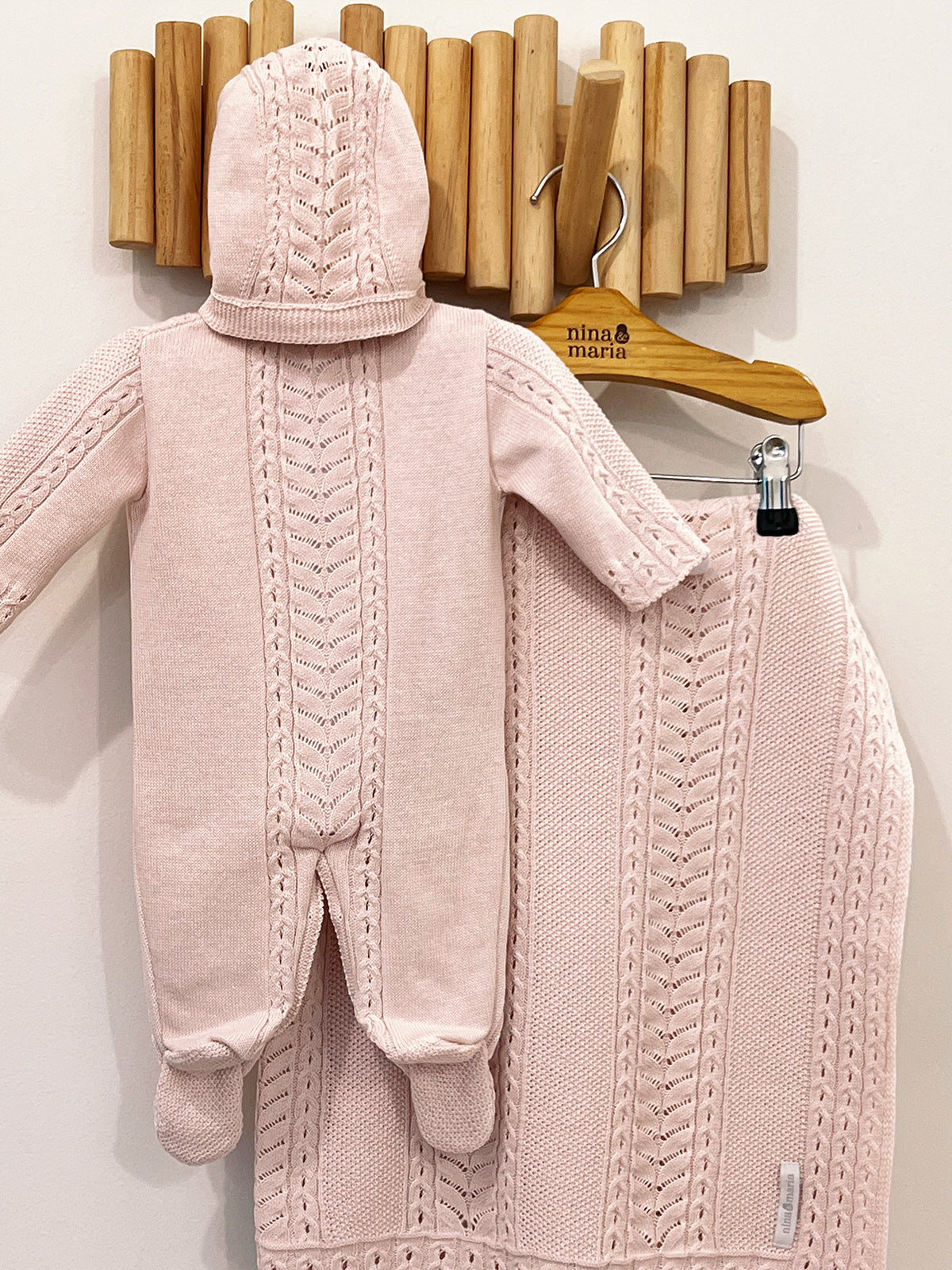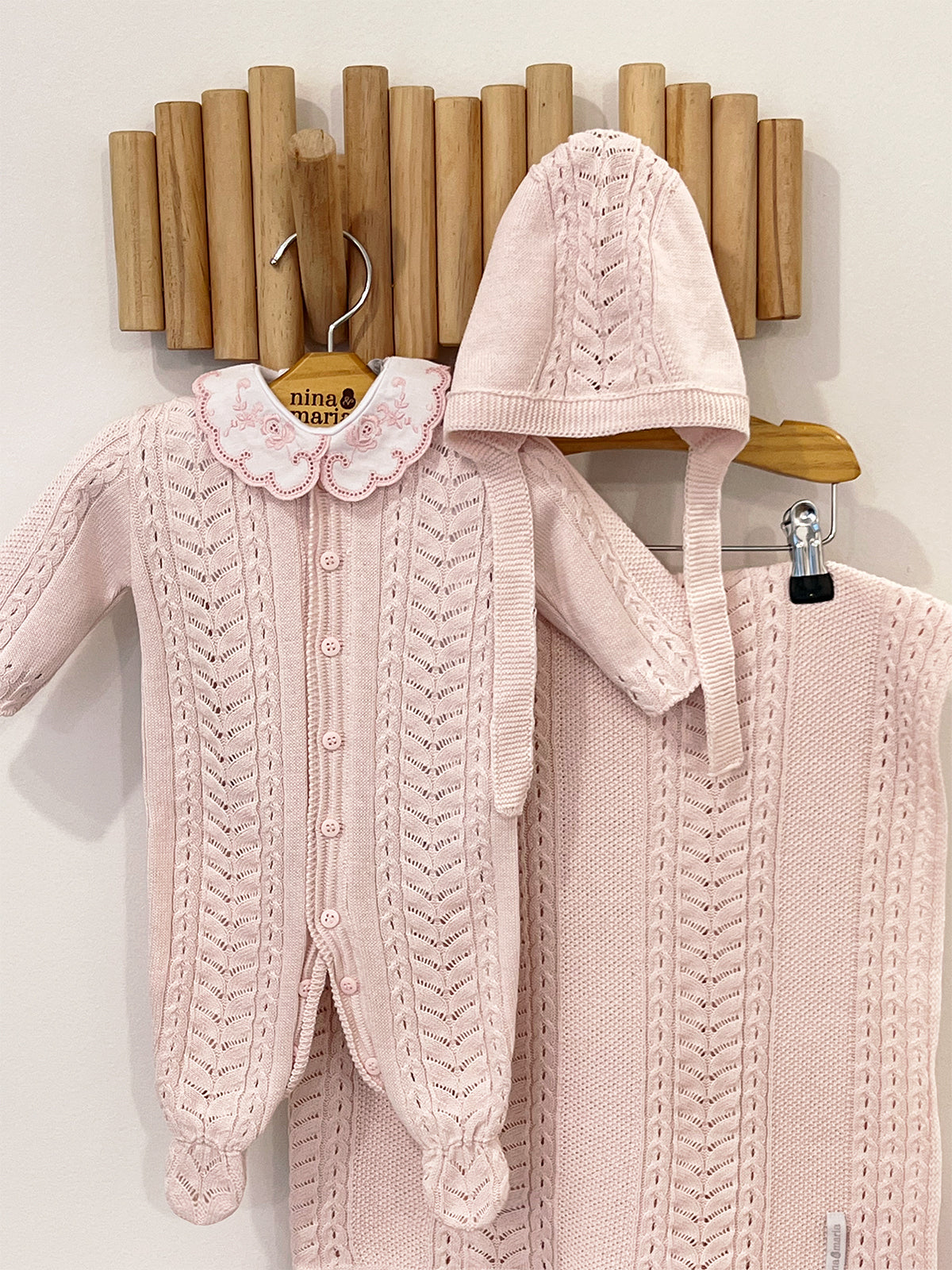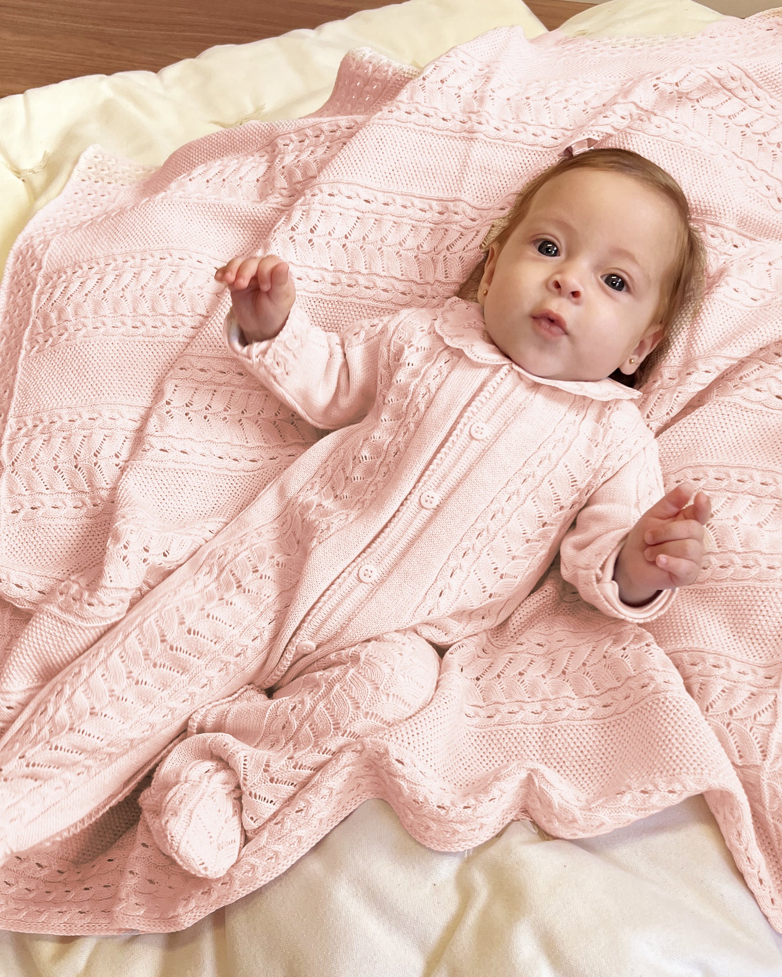 Saída de maternidade feminina em tricot 3 peças; Macacão trabalhado com botões frontais para facilitar a troca do bebê. Manta em tricot com a mesma cor e trama do macacão e touquinha de amarrar.
