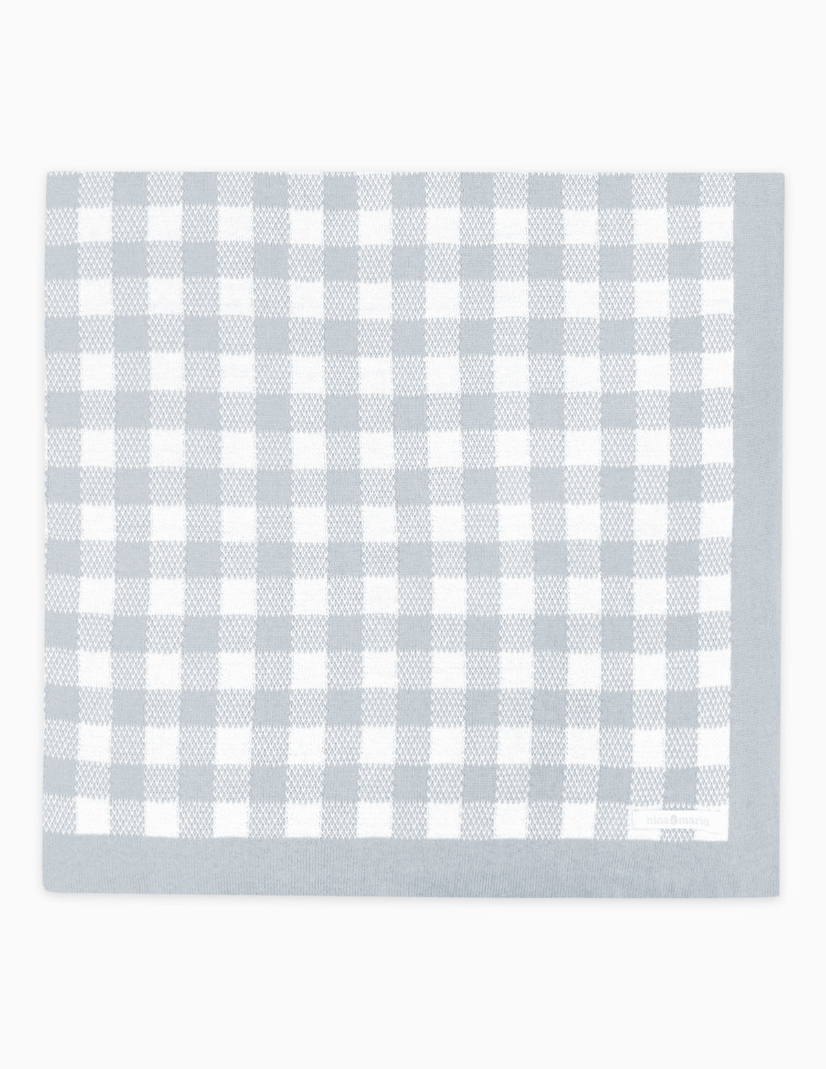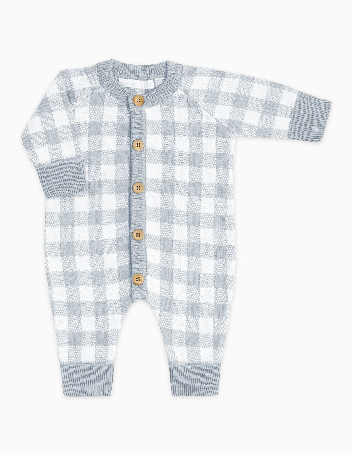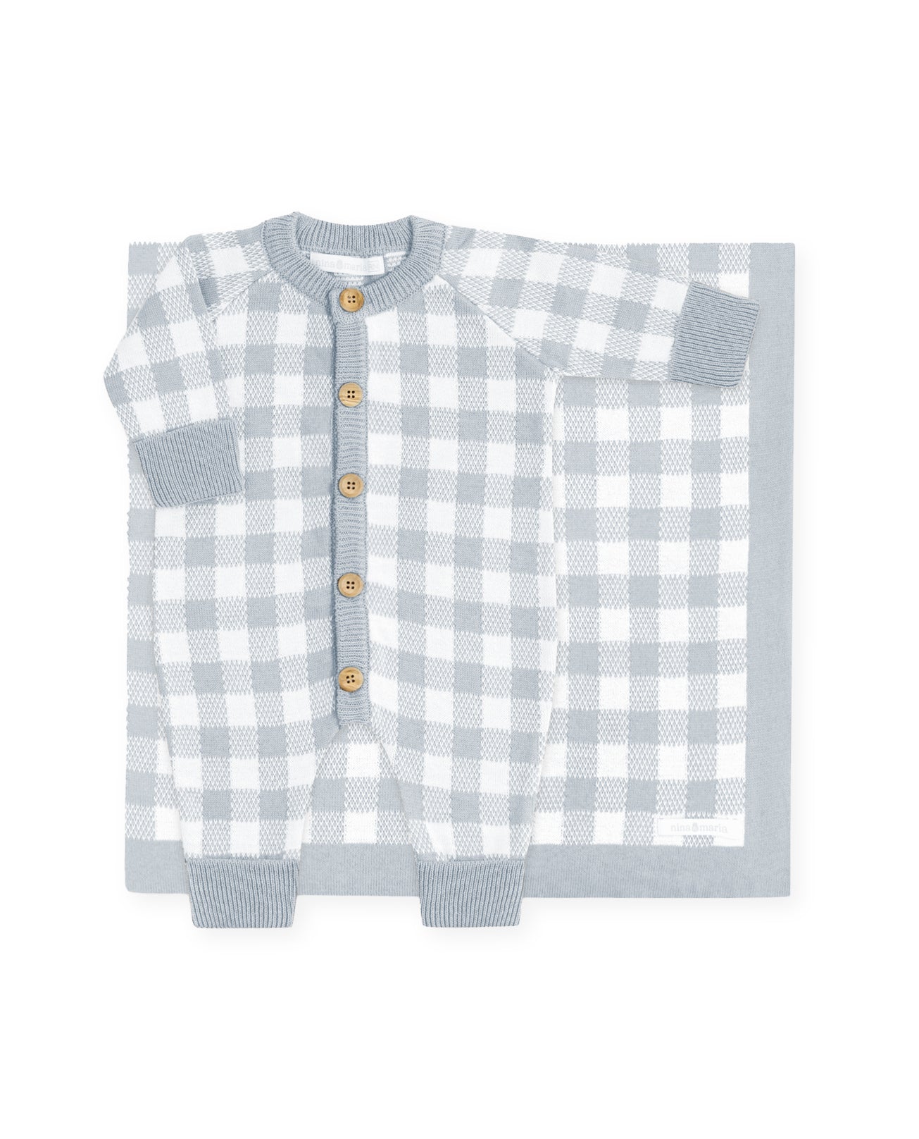 Saída de maternidade xadrez azul com 2 peças, macacão com abotoamento frontal para facilitar a troca do bebê e manta com o mesmo trabalho de tricot.