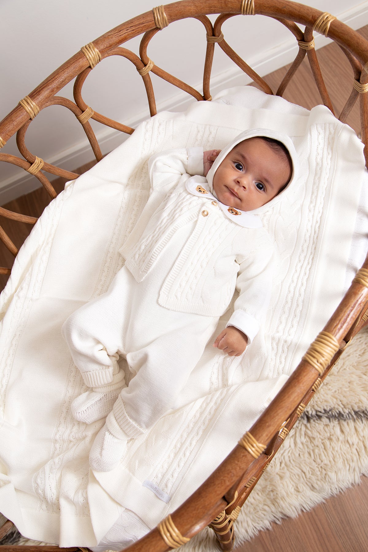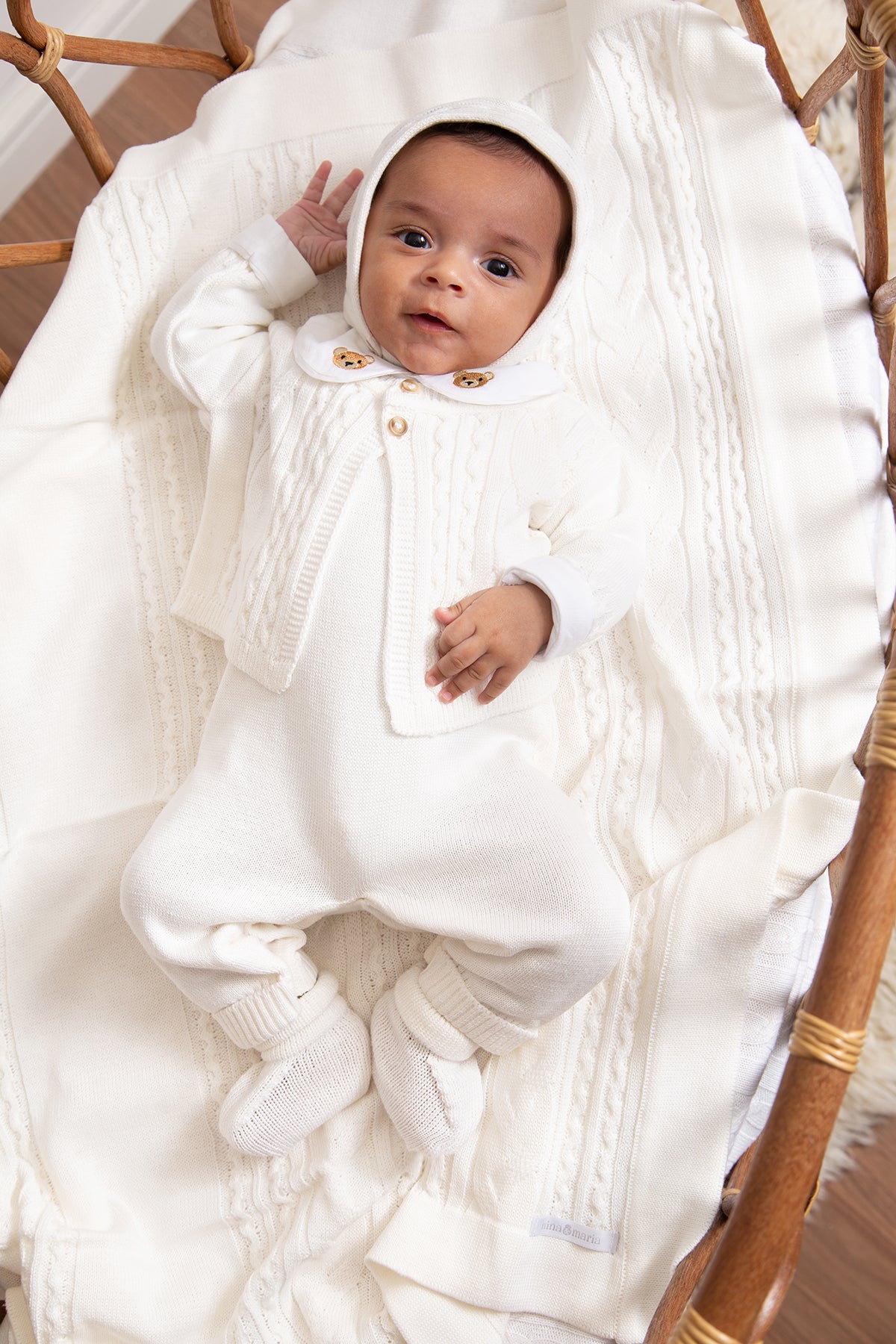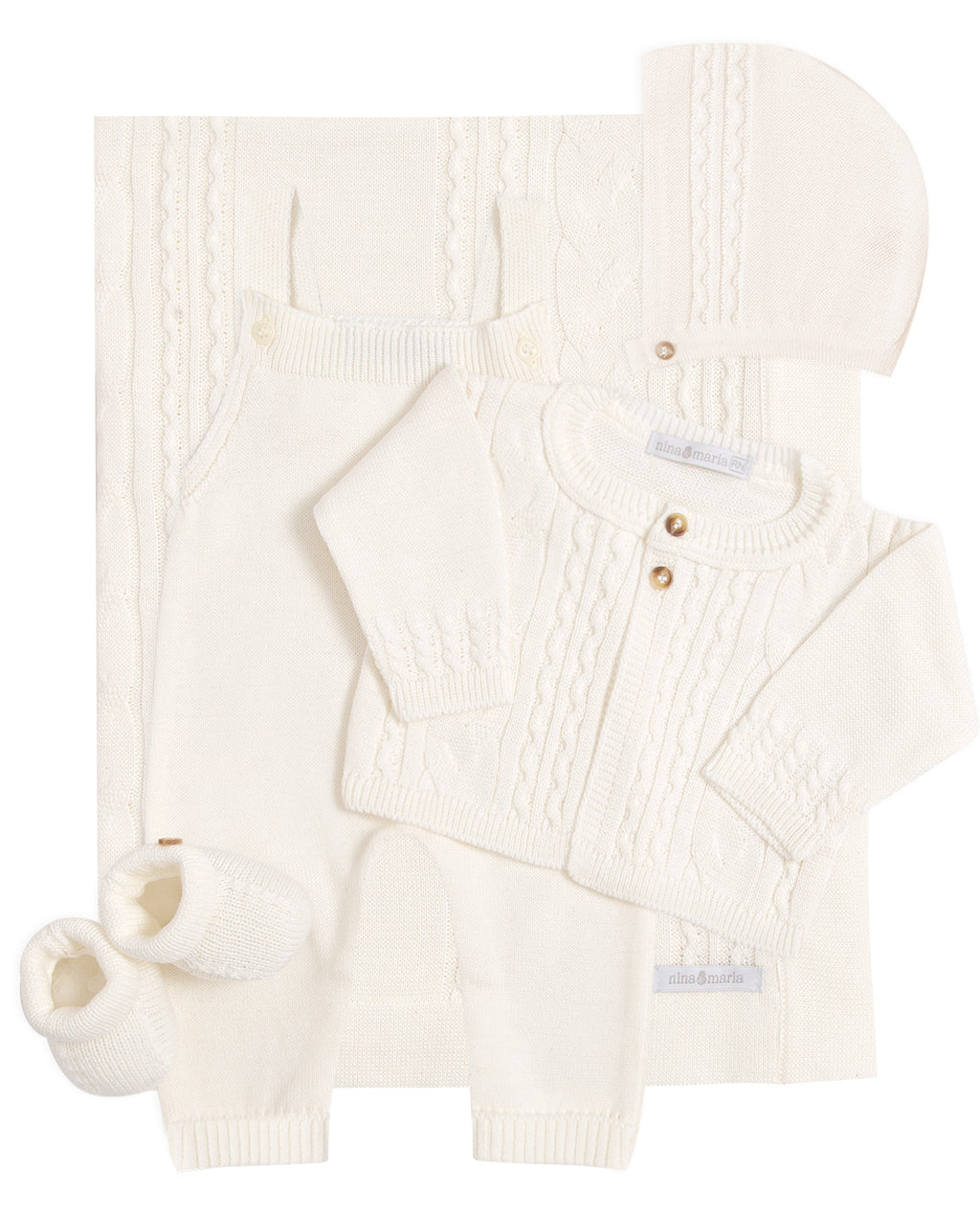 Saída de maternidade 5 peças. Casaquinho, jardineira sem pé com abotoamento nas alças, sapatinhos, gorrinho e manta de tricot com o mesmo trabalho do casaquinho.