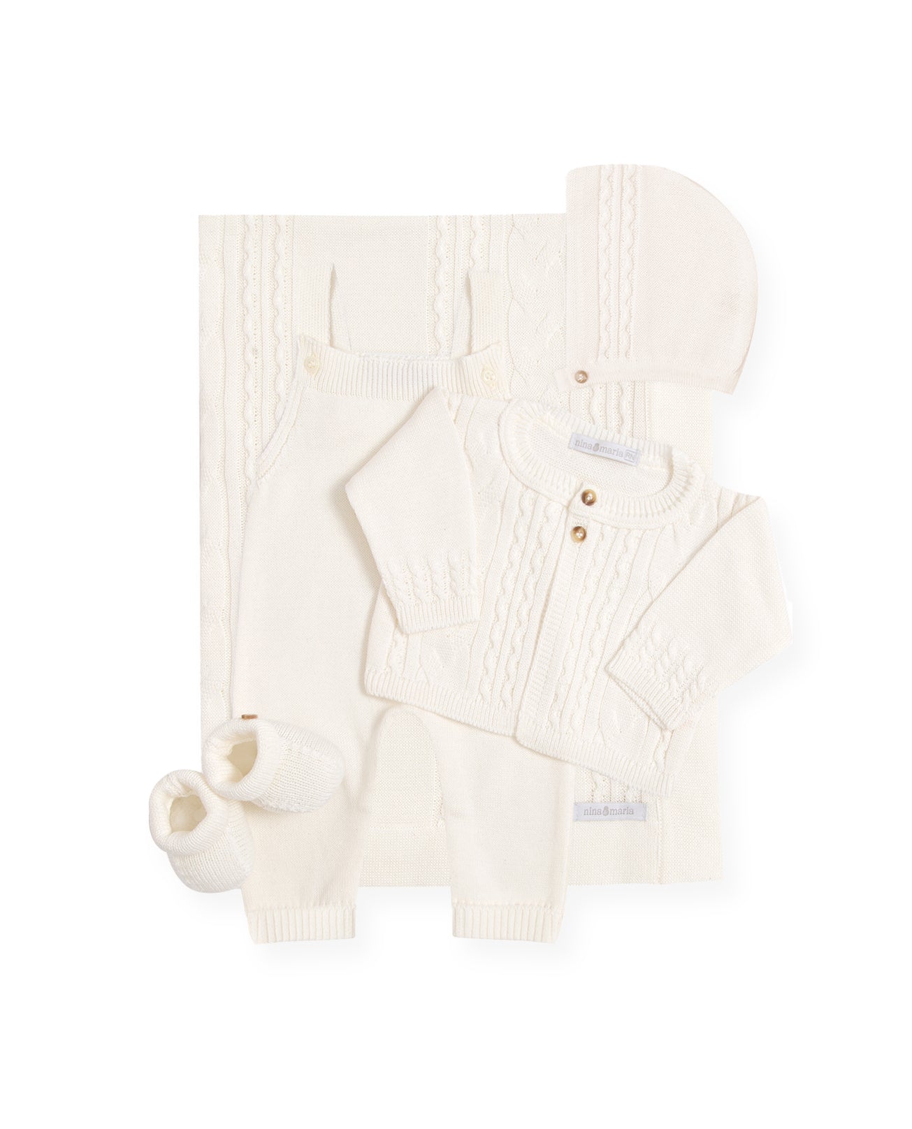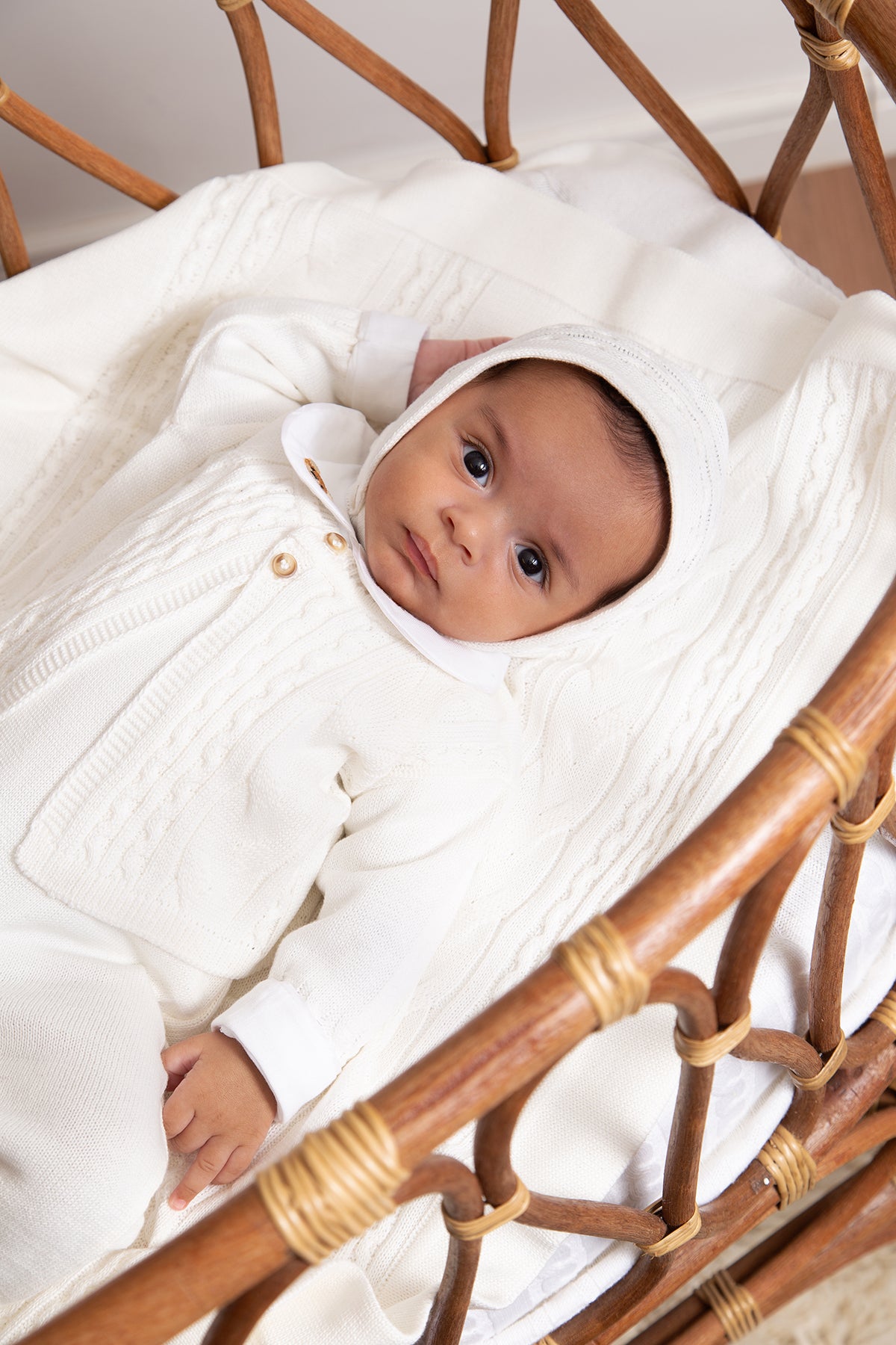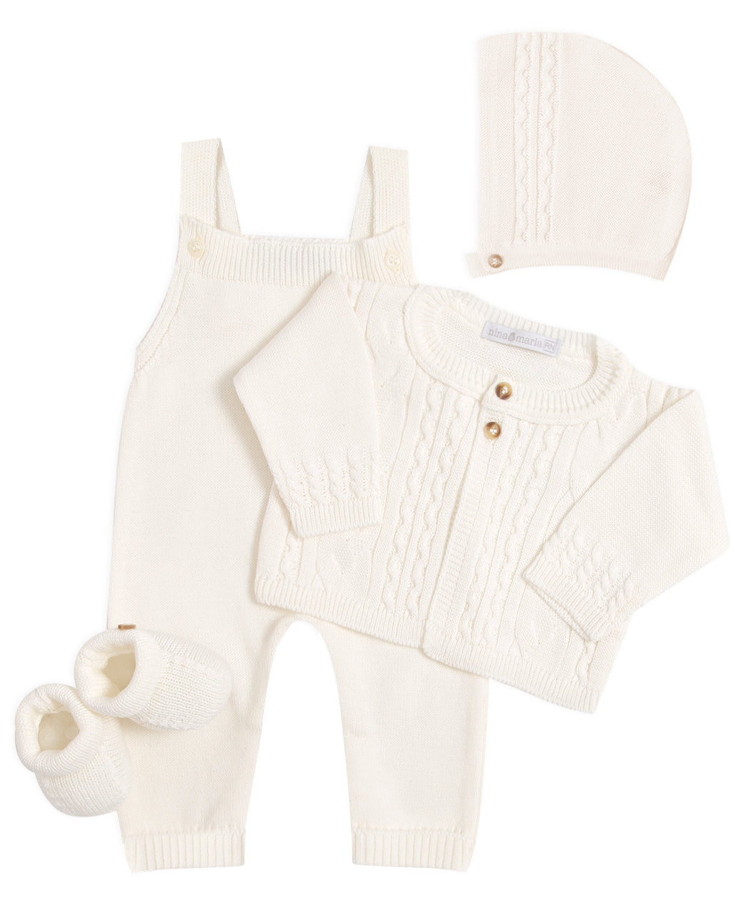 Saída de maternidade 5 peças. Casaquinho, jardineira sem pé com abotoamento nas alças, sapatinhos, gorrinho e manta de tricot com o mesmo trabalho do casaquinho.
