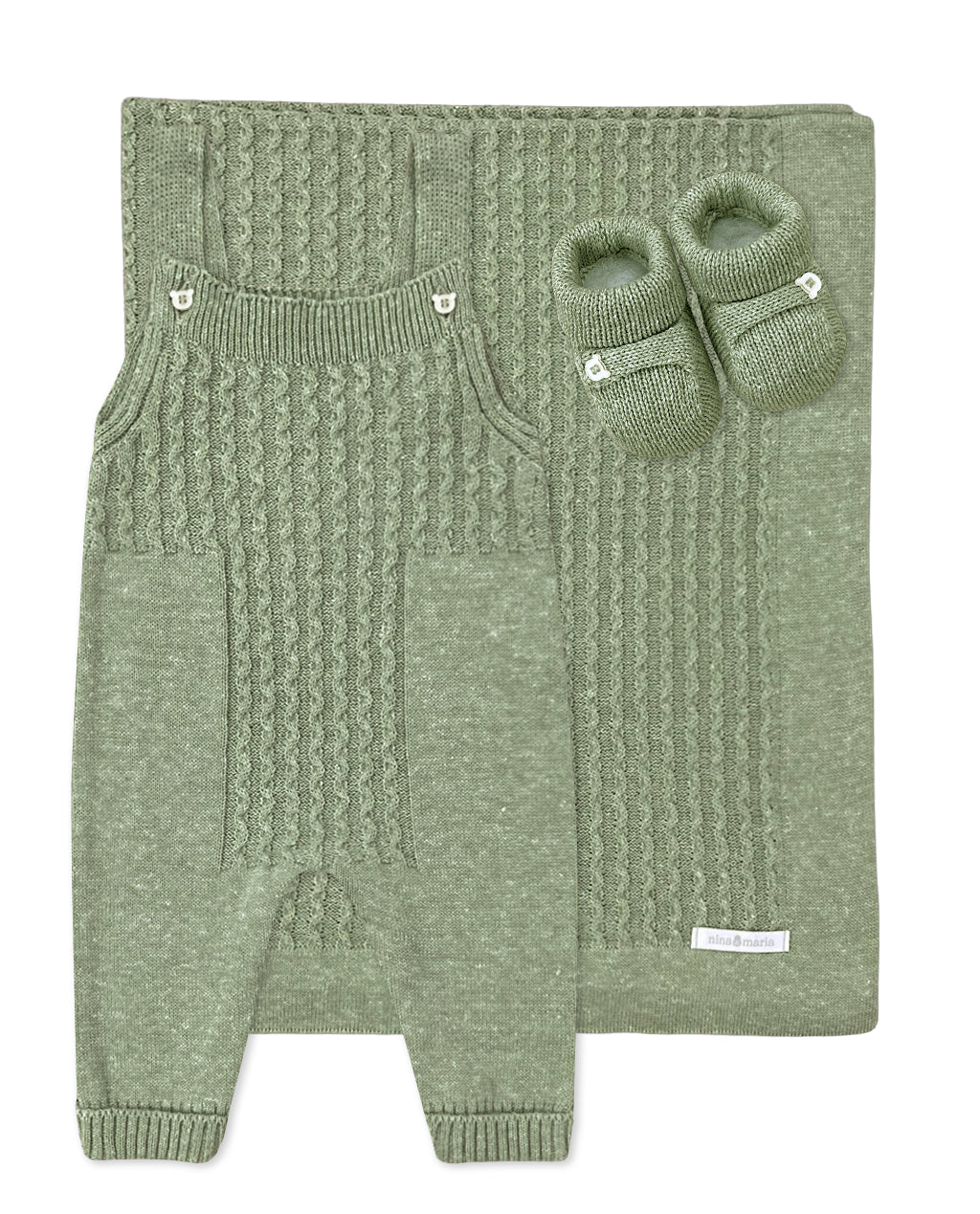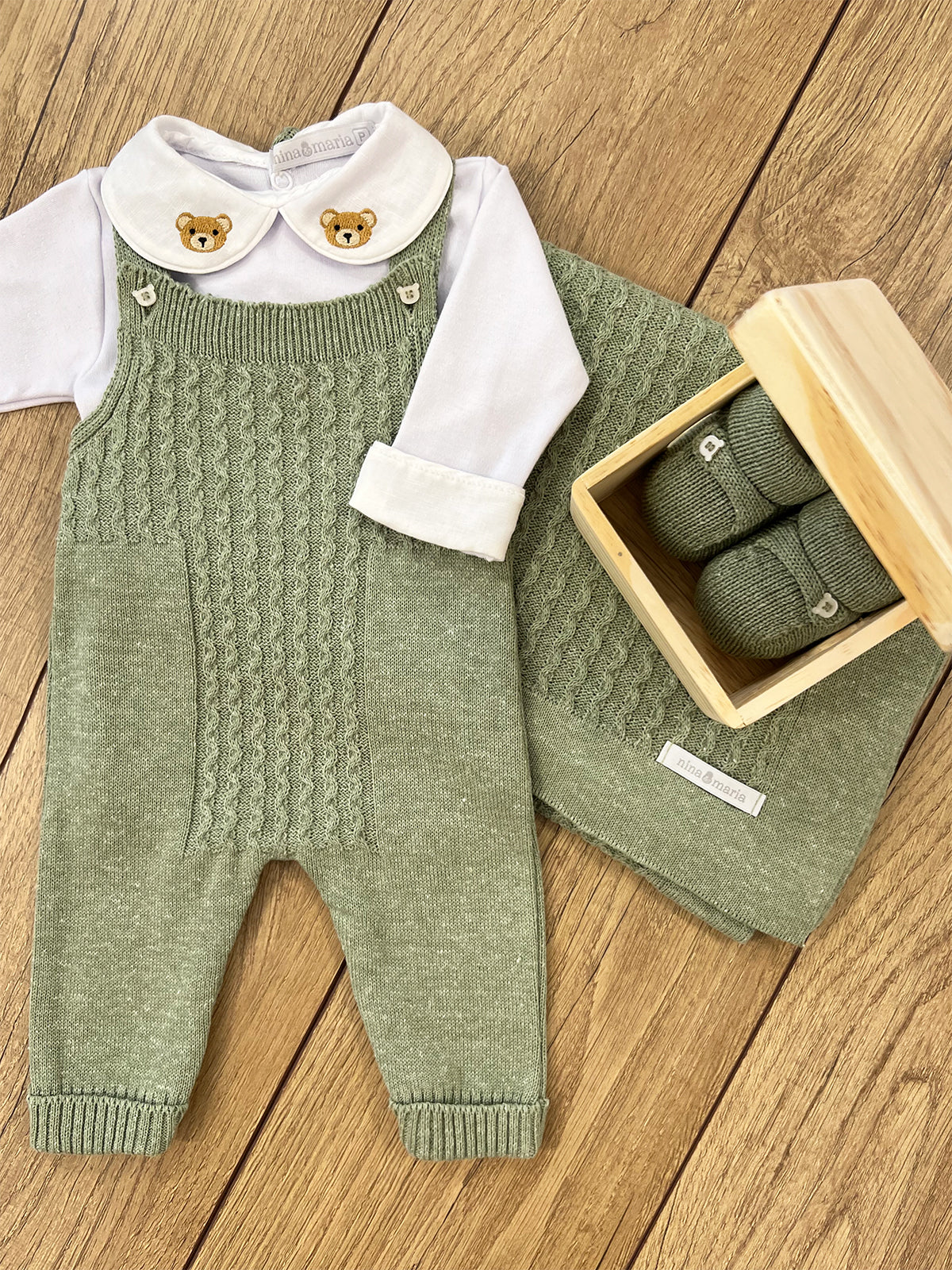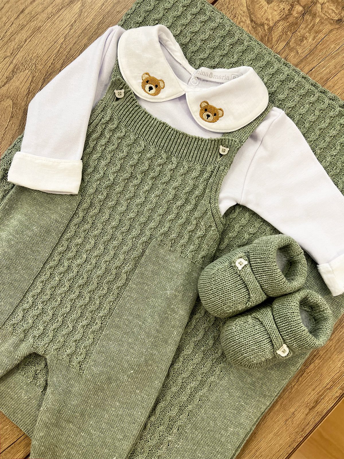 Saída de maternidade 3 peças. Jardineira sem pé com abotoamento nas alças e na entreperna, sapatinhos e manta de tricot com o mesmo trabalho da jardineira.