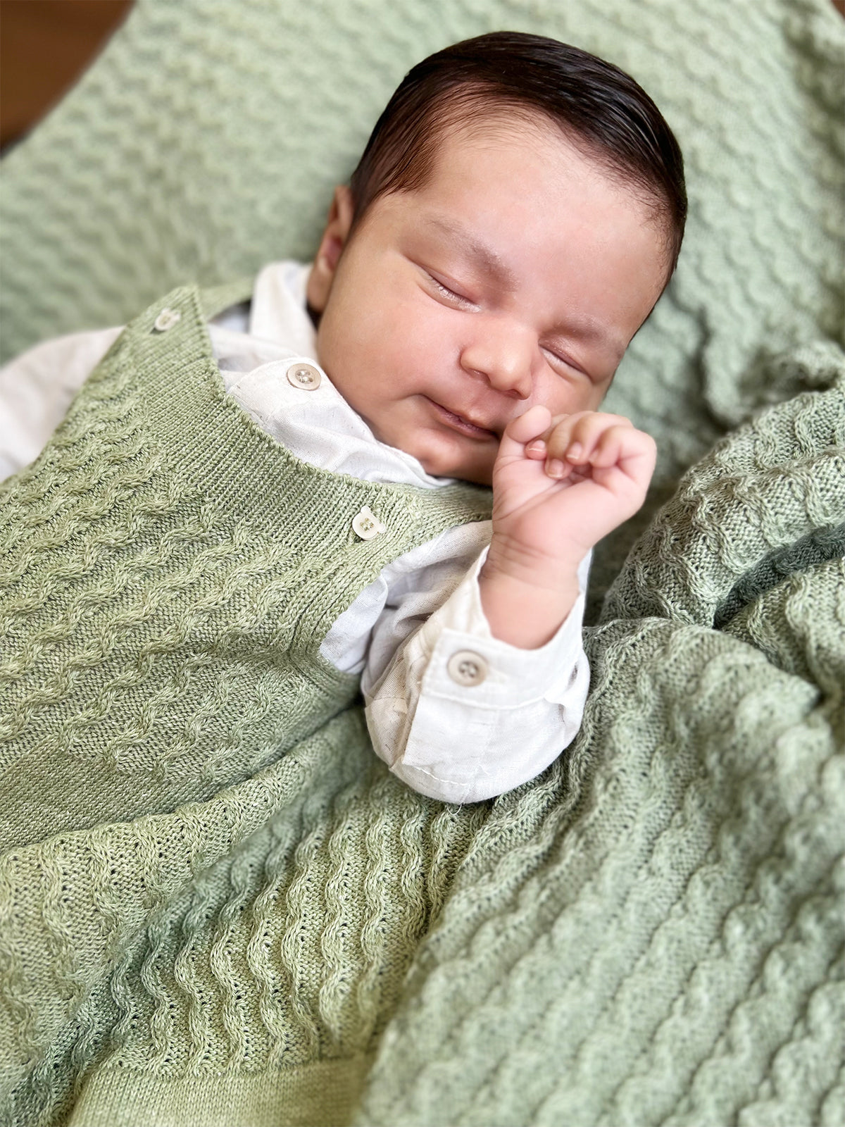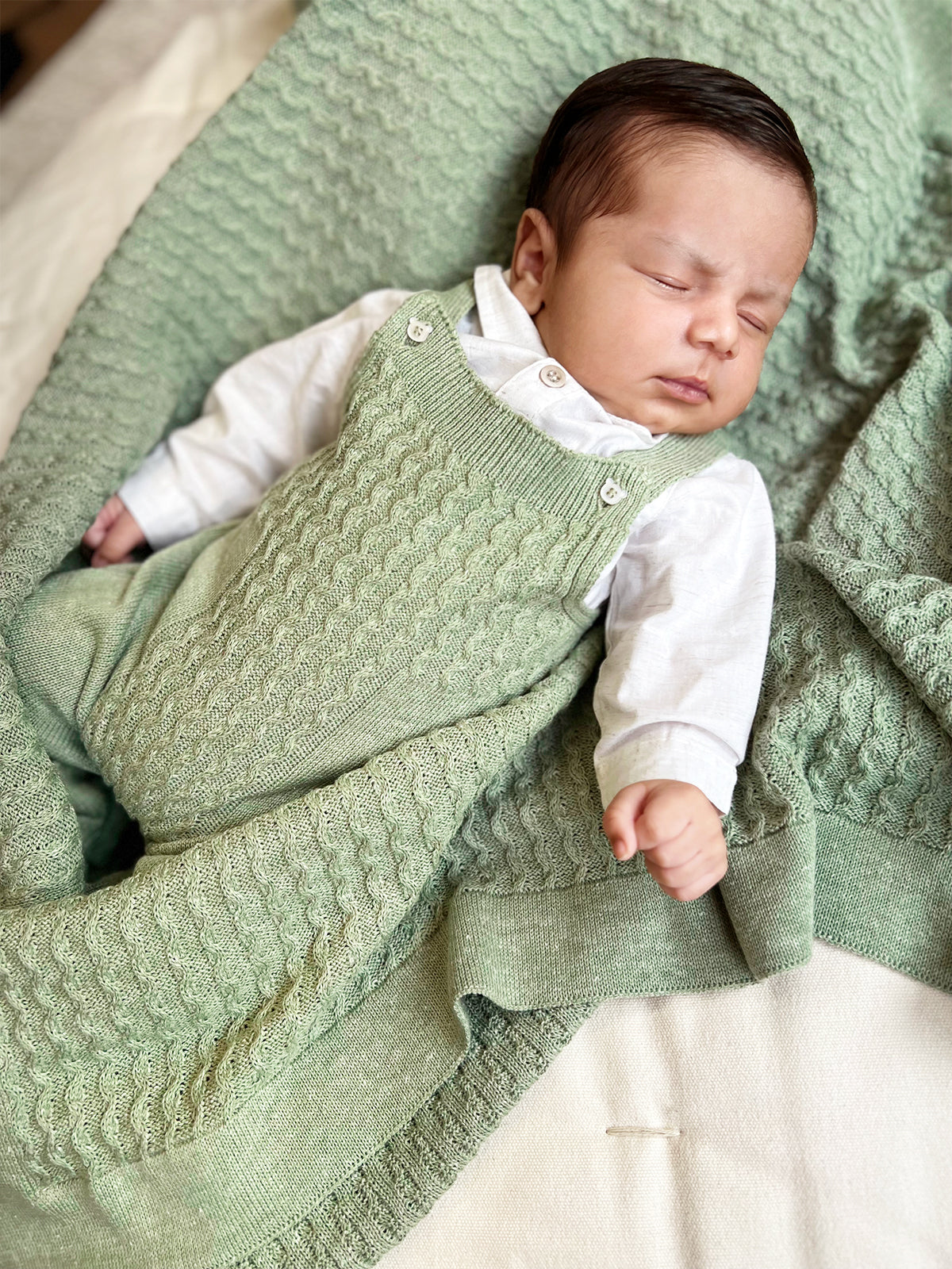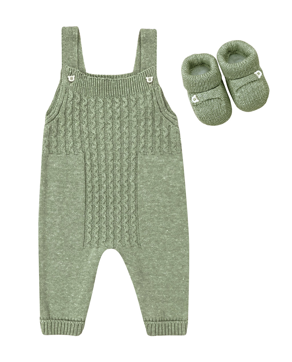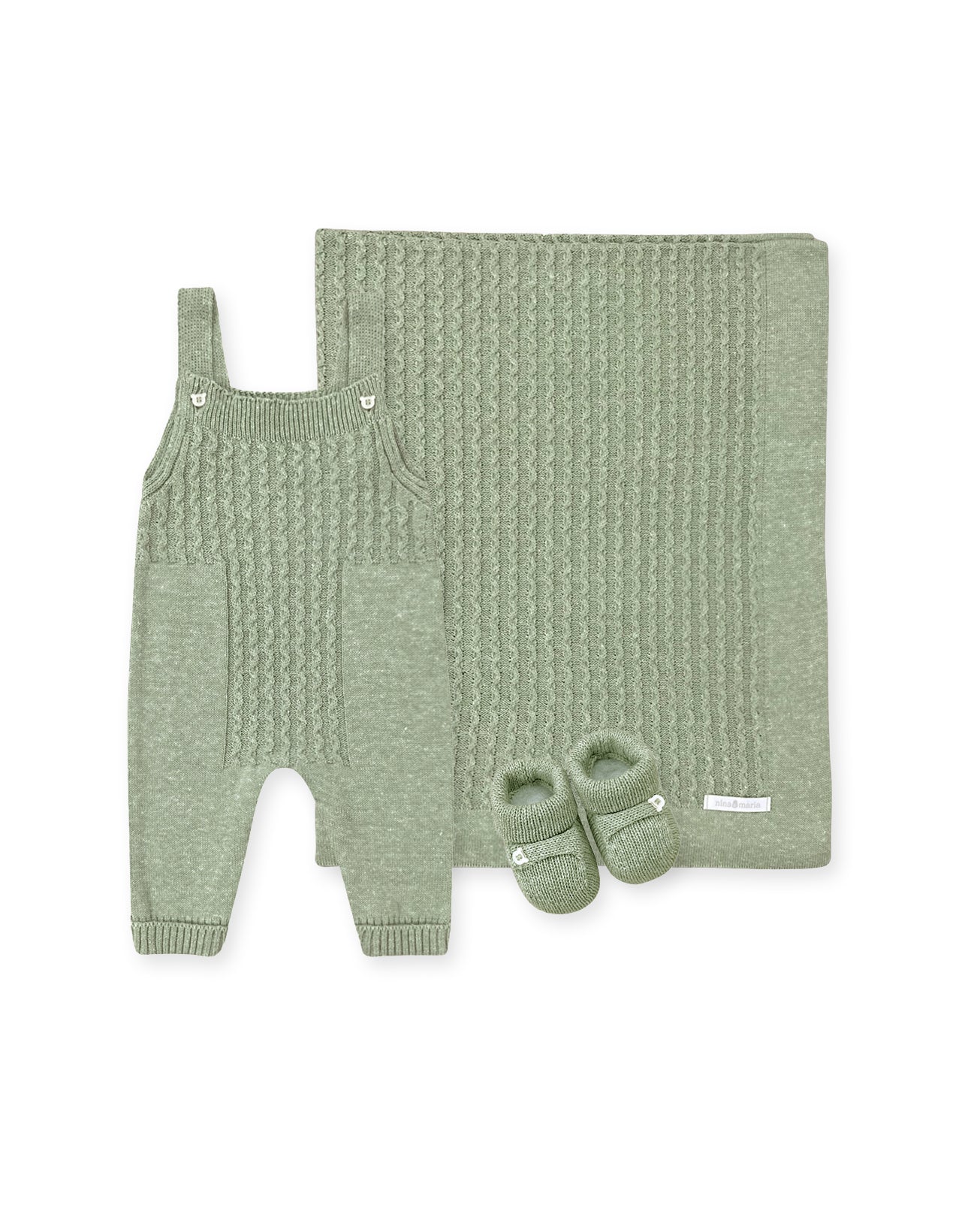 Saída de maternidade 3 peças. Jardineira sem pé com abotoamento nas alças e na entreperna, sapatinhos e manta de tricot com o mesmo trabalho da jardineira.