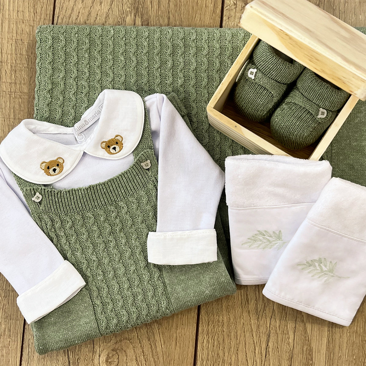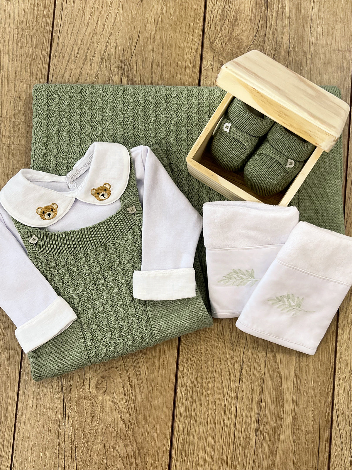 Atenção: Foto ilustrativa, incluso jardineira, sapatinhos e manta, o body com golinha e os outros itens são uma sugestões de composição e são vendidos separadamente.