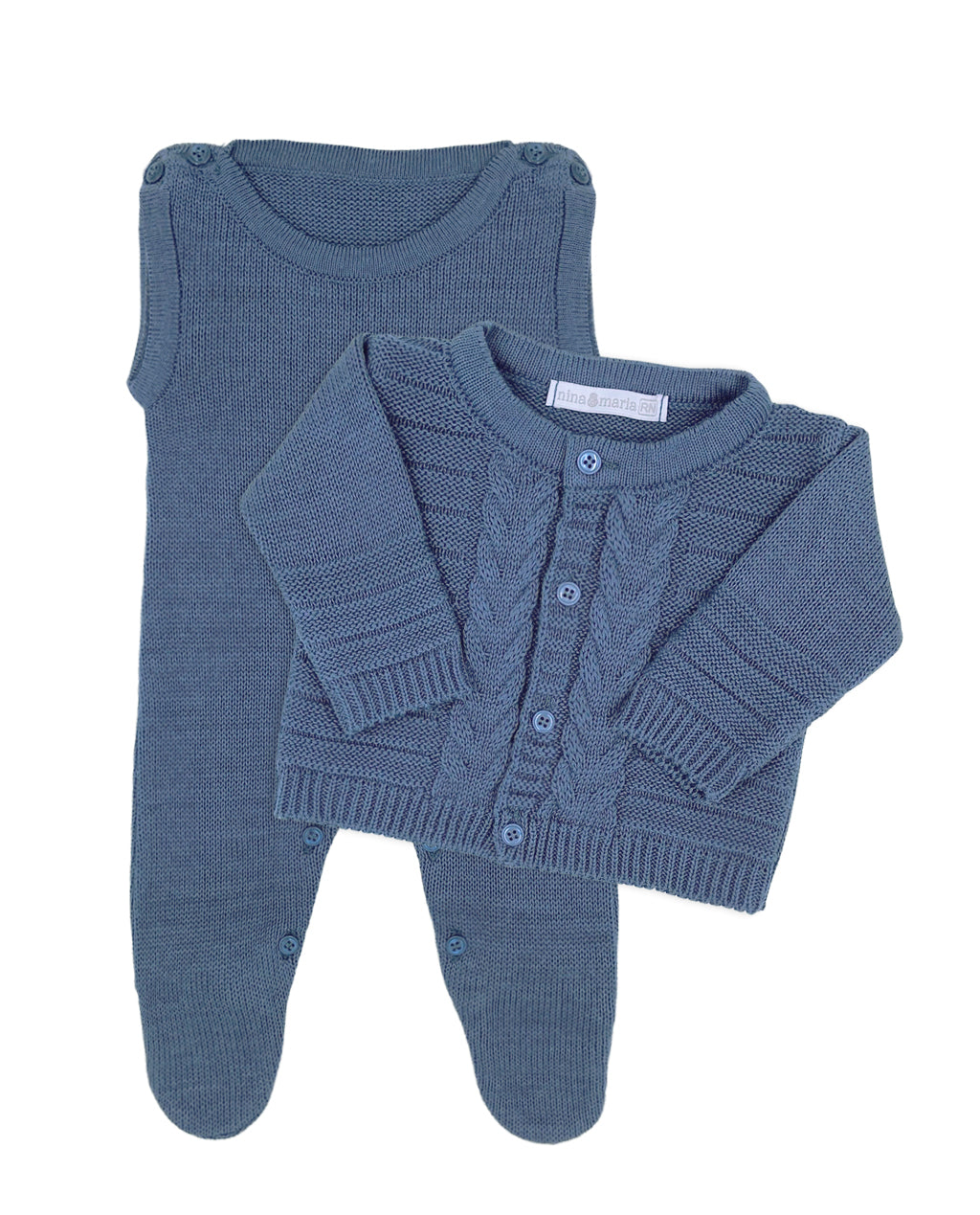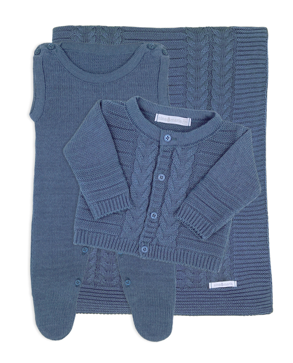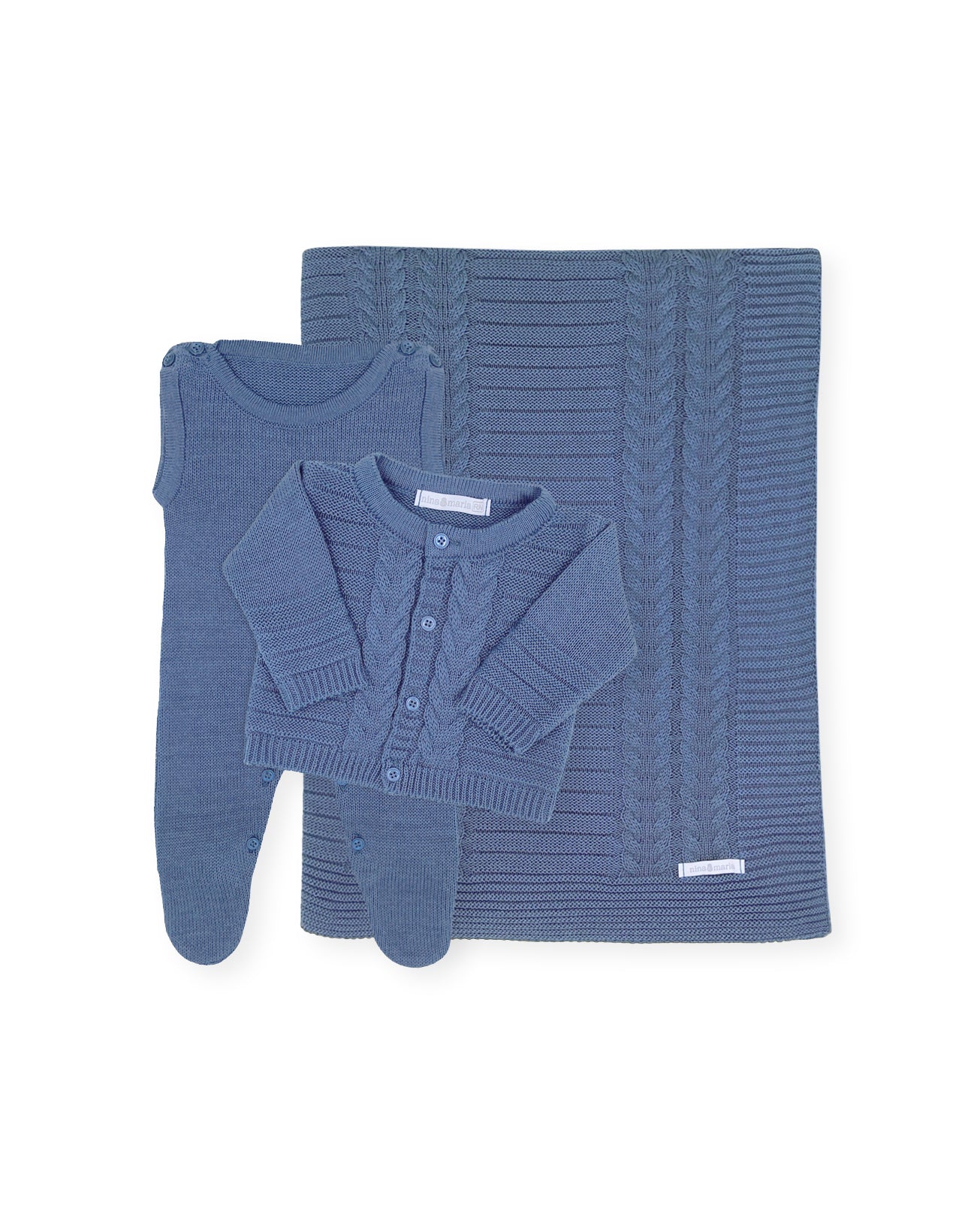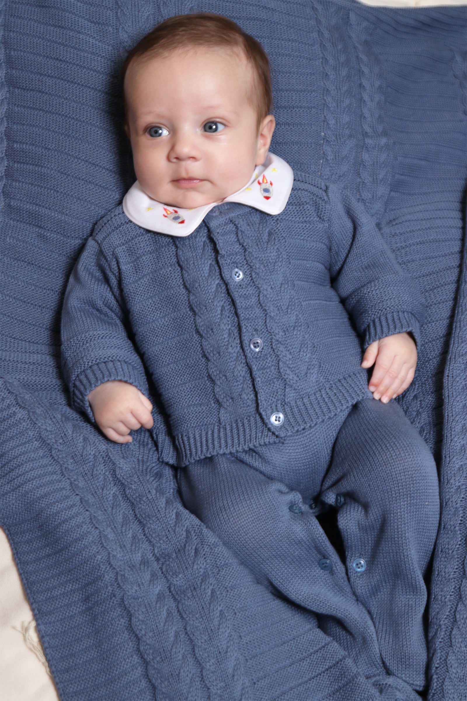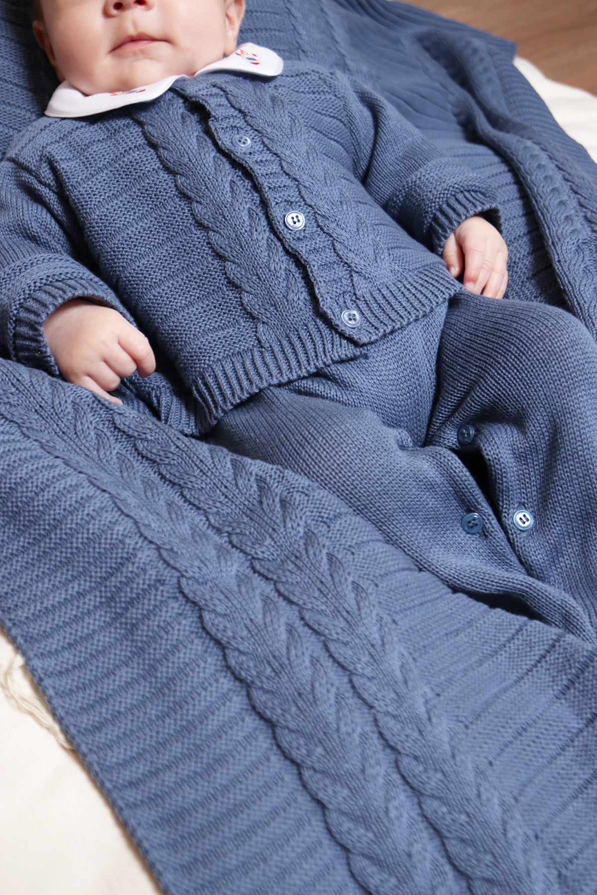 Saída de maternidade 3 peças. Casaquinho com trabalho de tranças, jardineira com abotoamento nos ombros e nas entrepernas. Manta de tricot com o mesmo trabalho do casaquinho.
