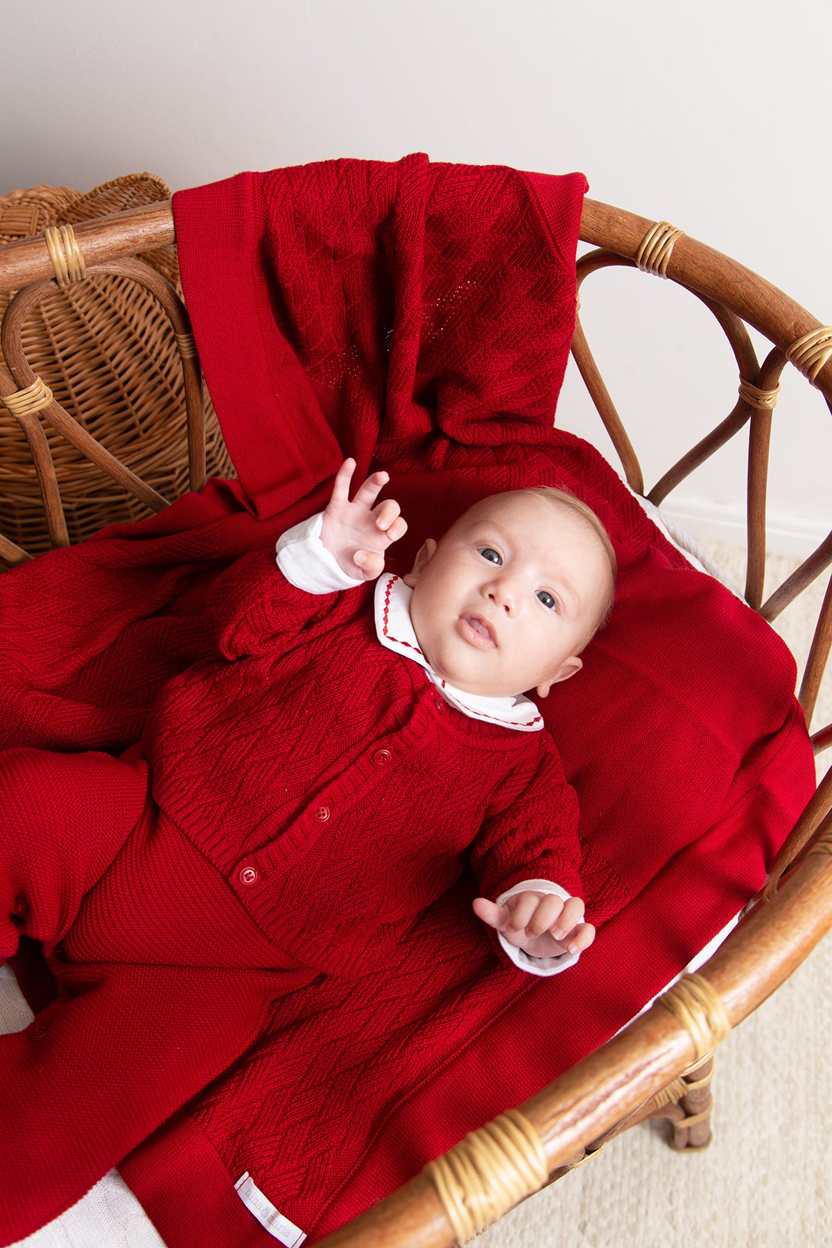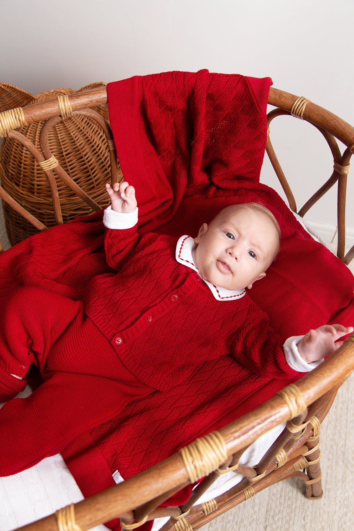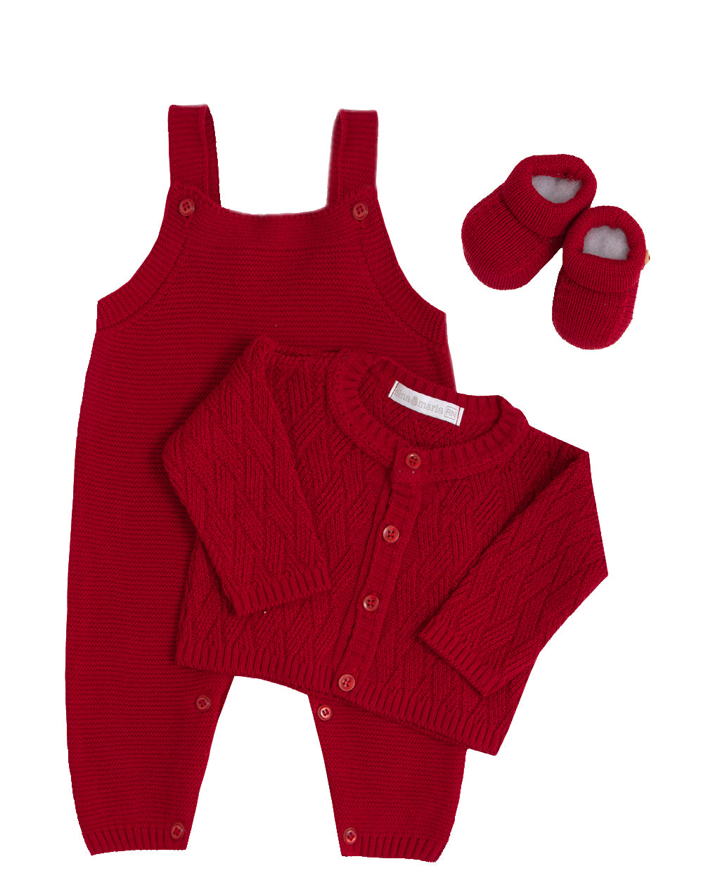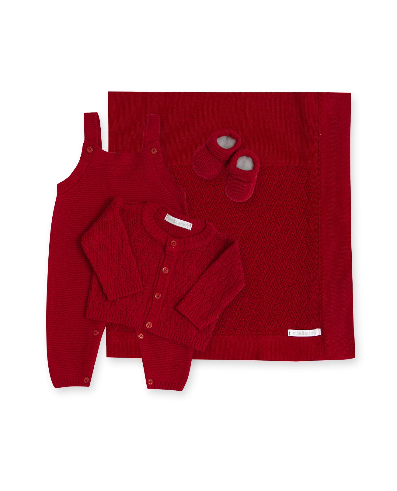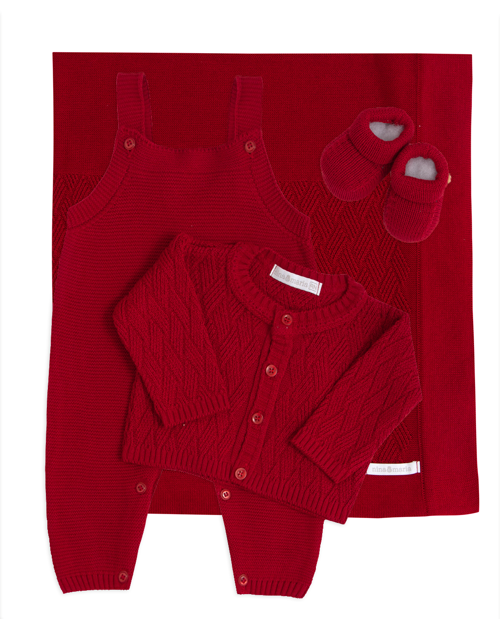 Saída de maternidade 4 peças. Casaquinho, jardineira sem pé com abotoamento nas alças e na entreperna, sapatinhos e manta de tricot com o mesmo trabalho do casaquinho.