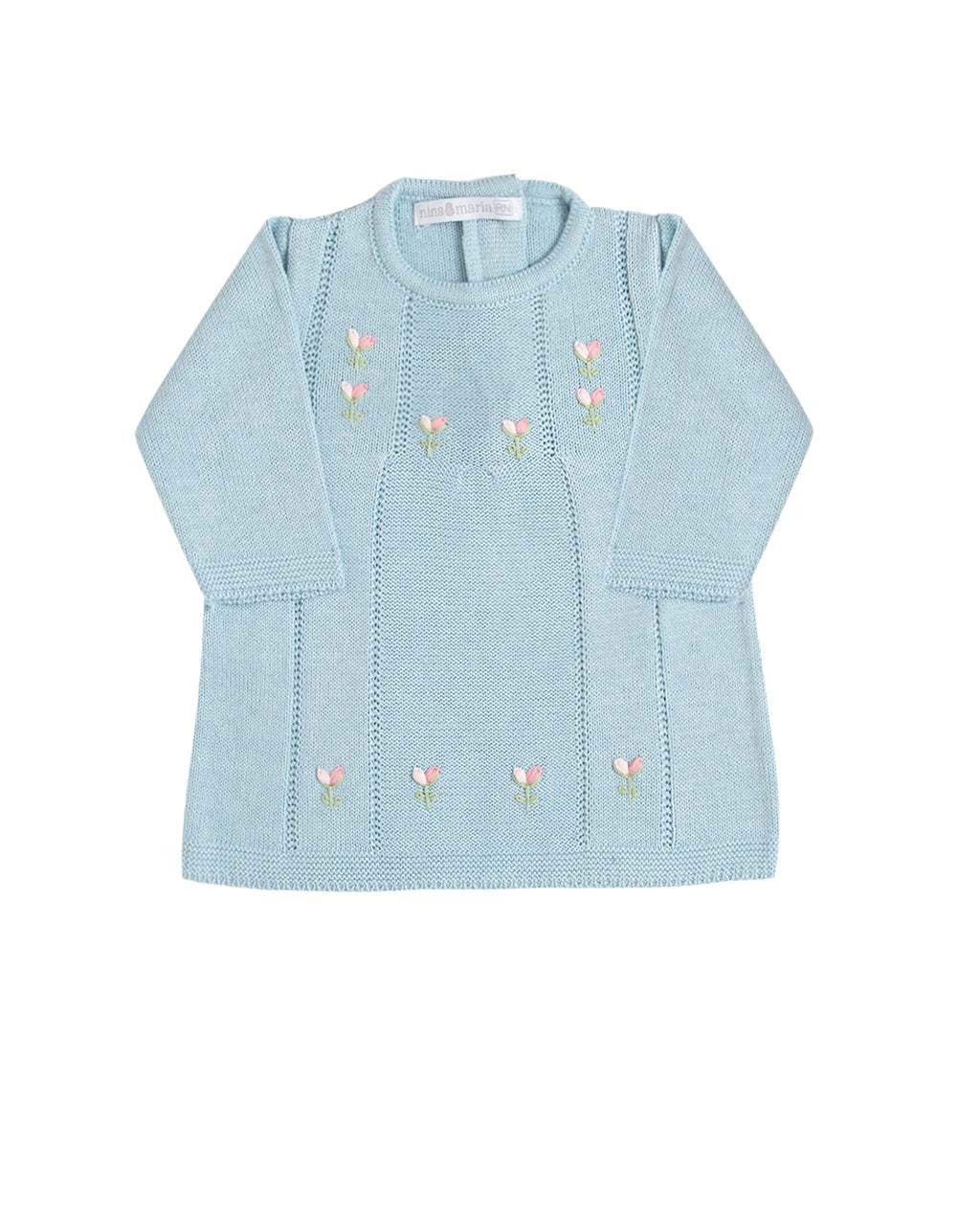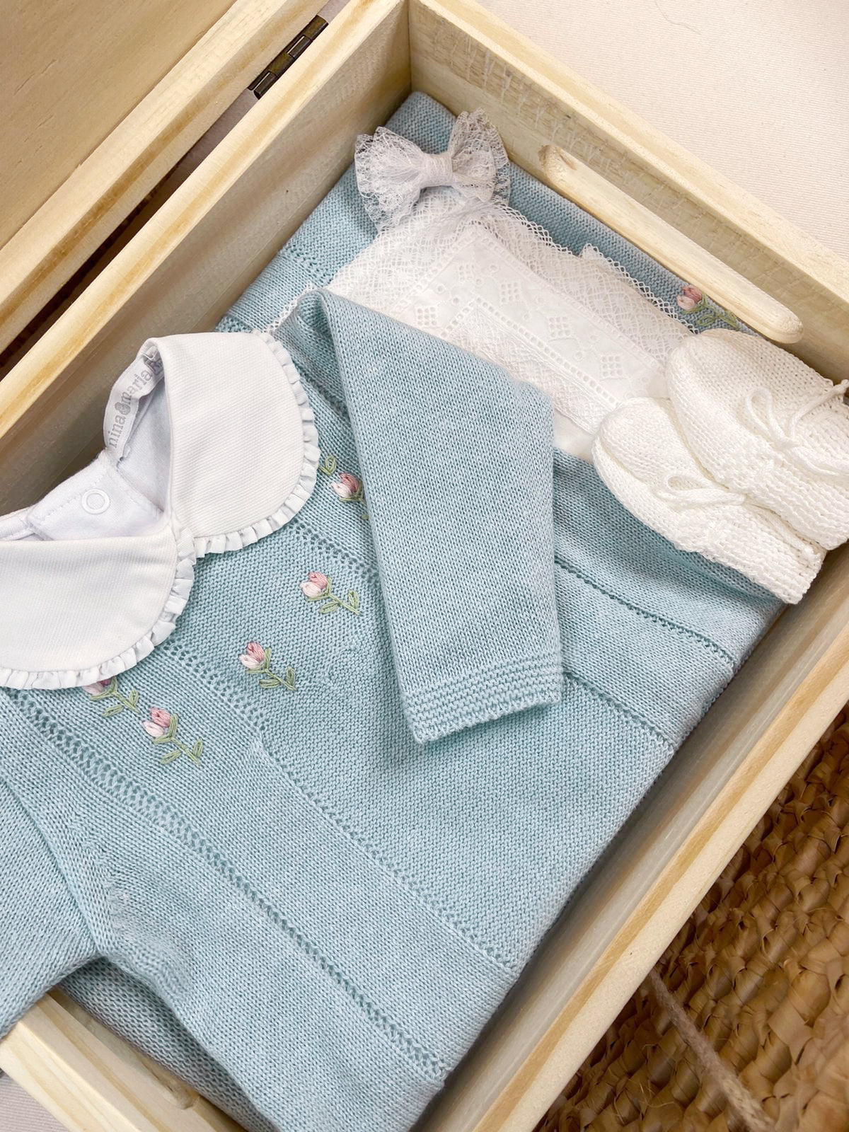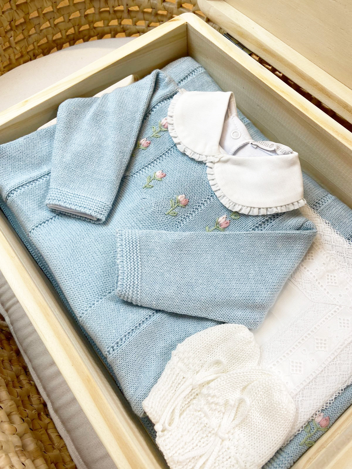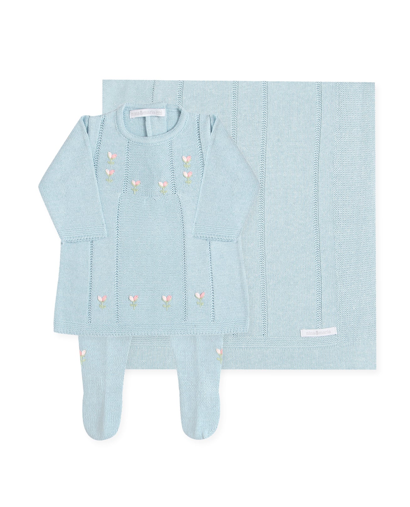 Saída de maternidade 3 peças. Vestido com bordado de tulipas, legging, manta de tricot com o mesmo trabalho do vestido.