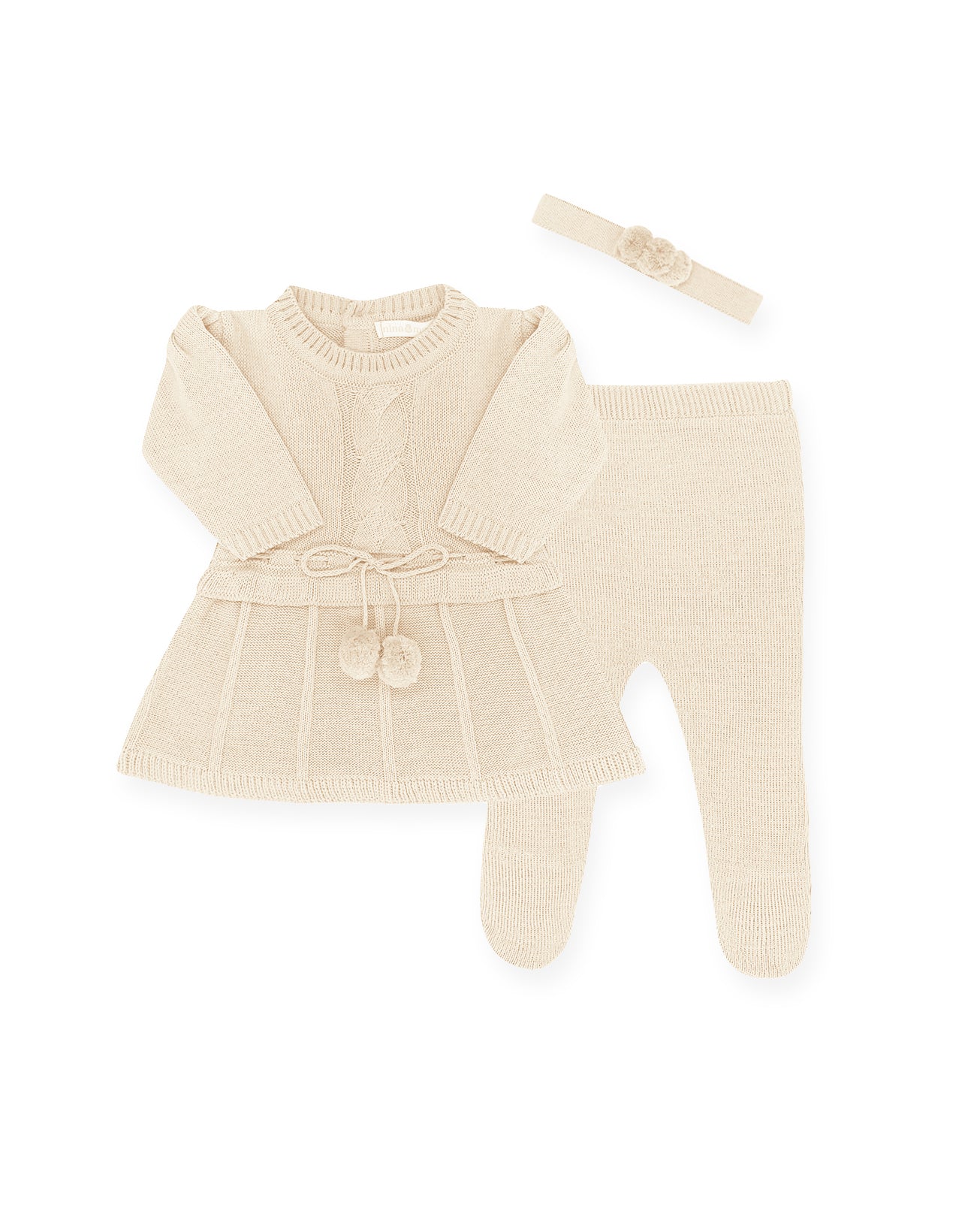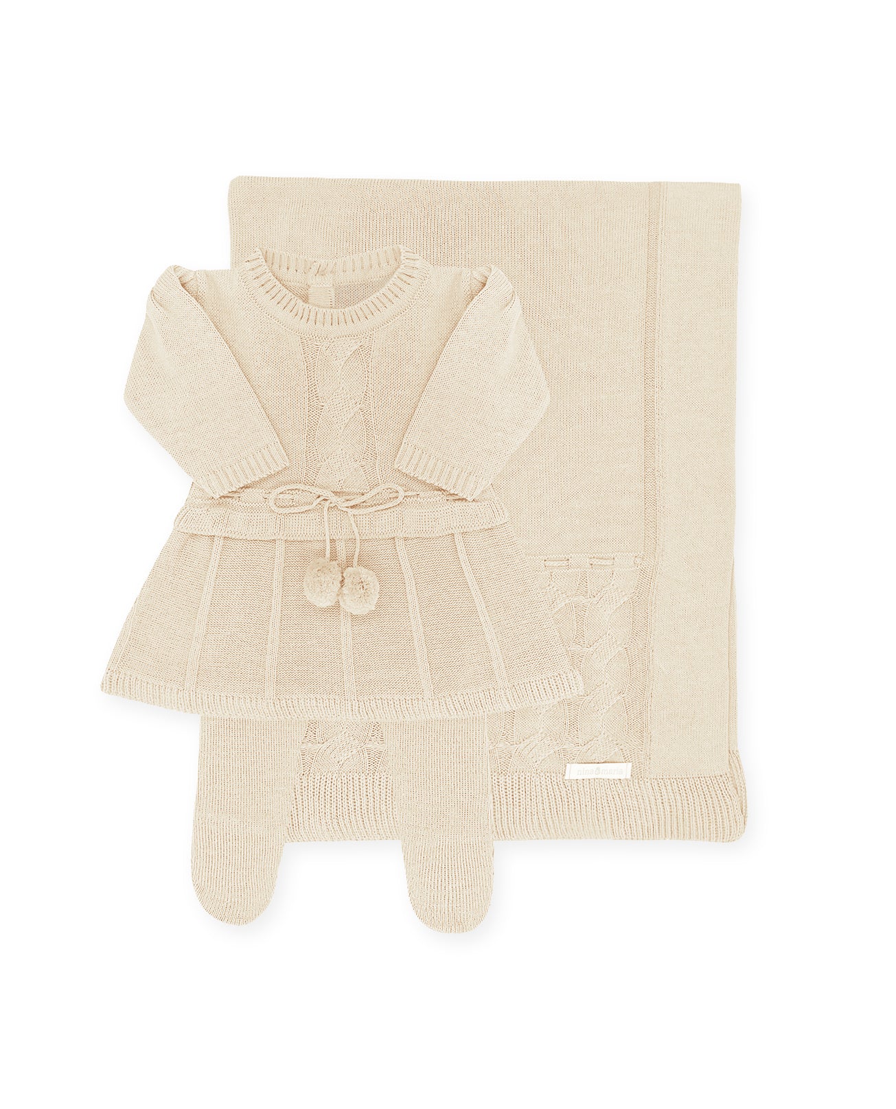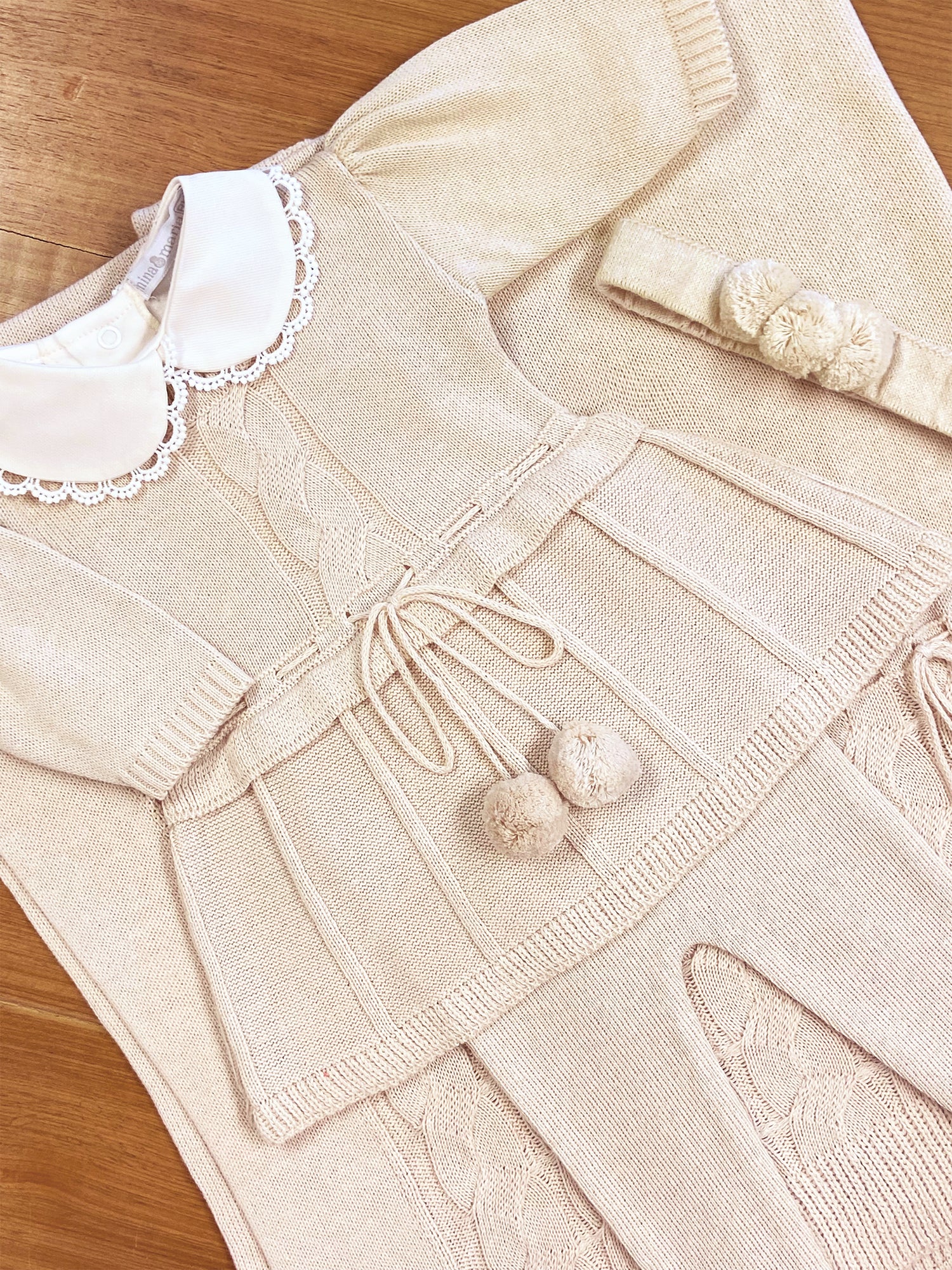 Saída de maternidade 4 peças. Vestido com aplique ajuste de amarração de pompom na cintura, legging, manta de tricot com o mesmo trabalho trançado do vestido vem com faixinha de cabelo em tricot com mini pompom.