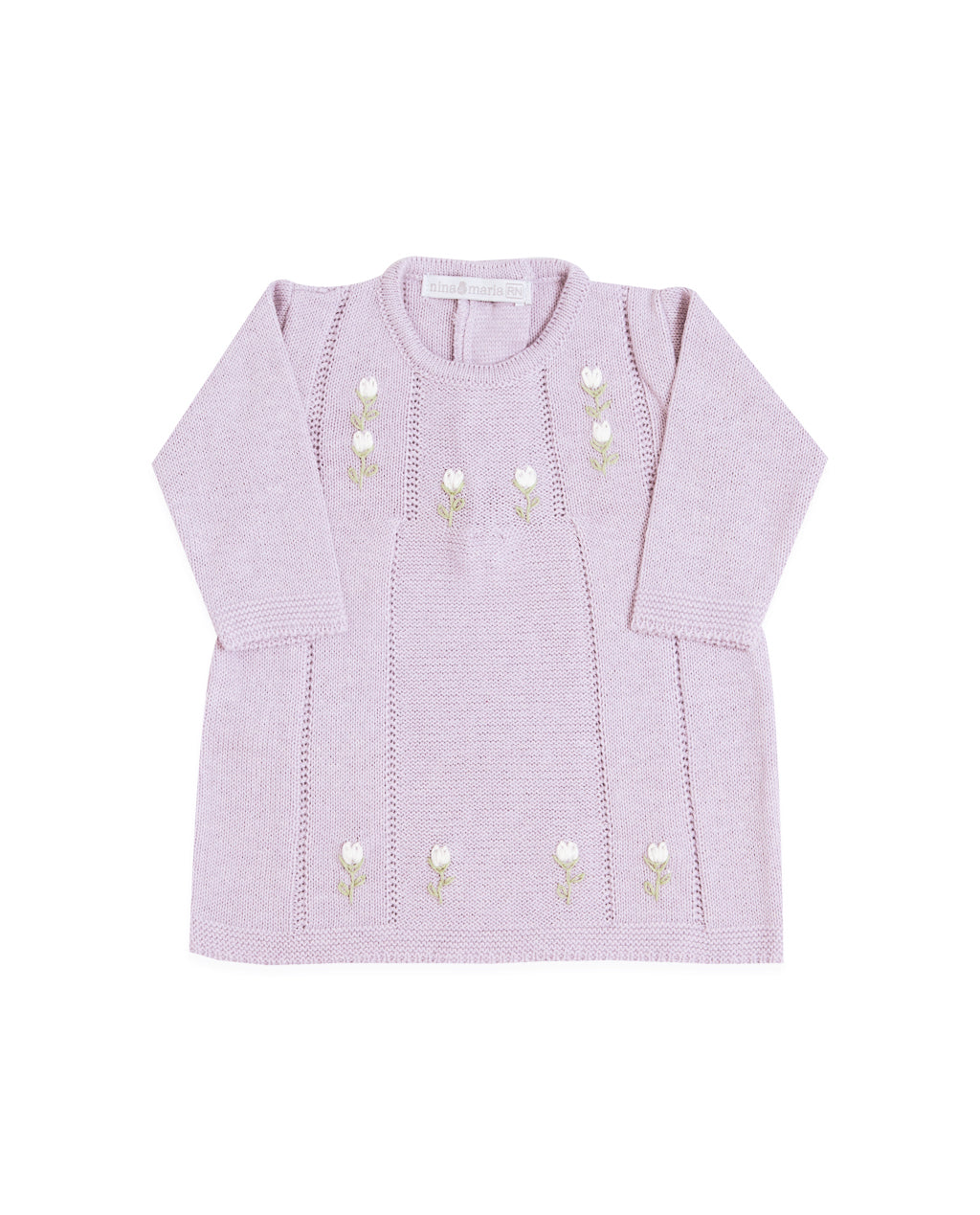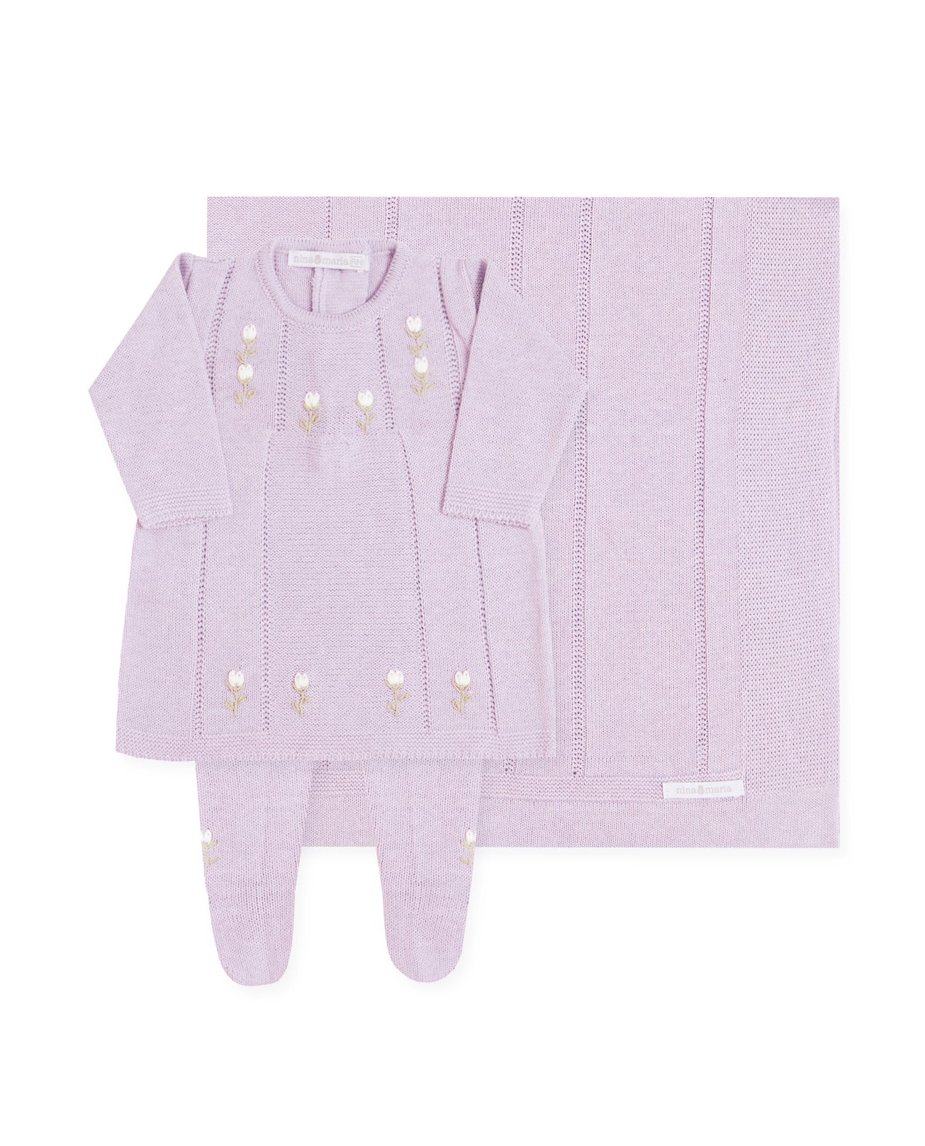 Saída de maternidade 3 peças. Vestido com bordado de tulipas, legging, manta de tricot com o mesmo trabalho do vestido.