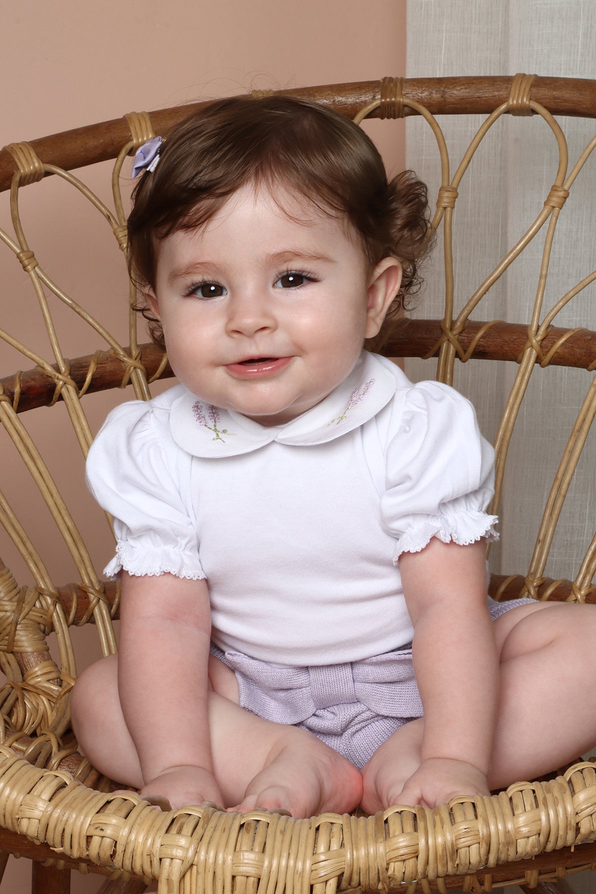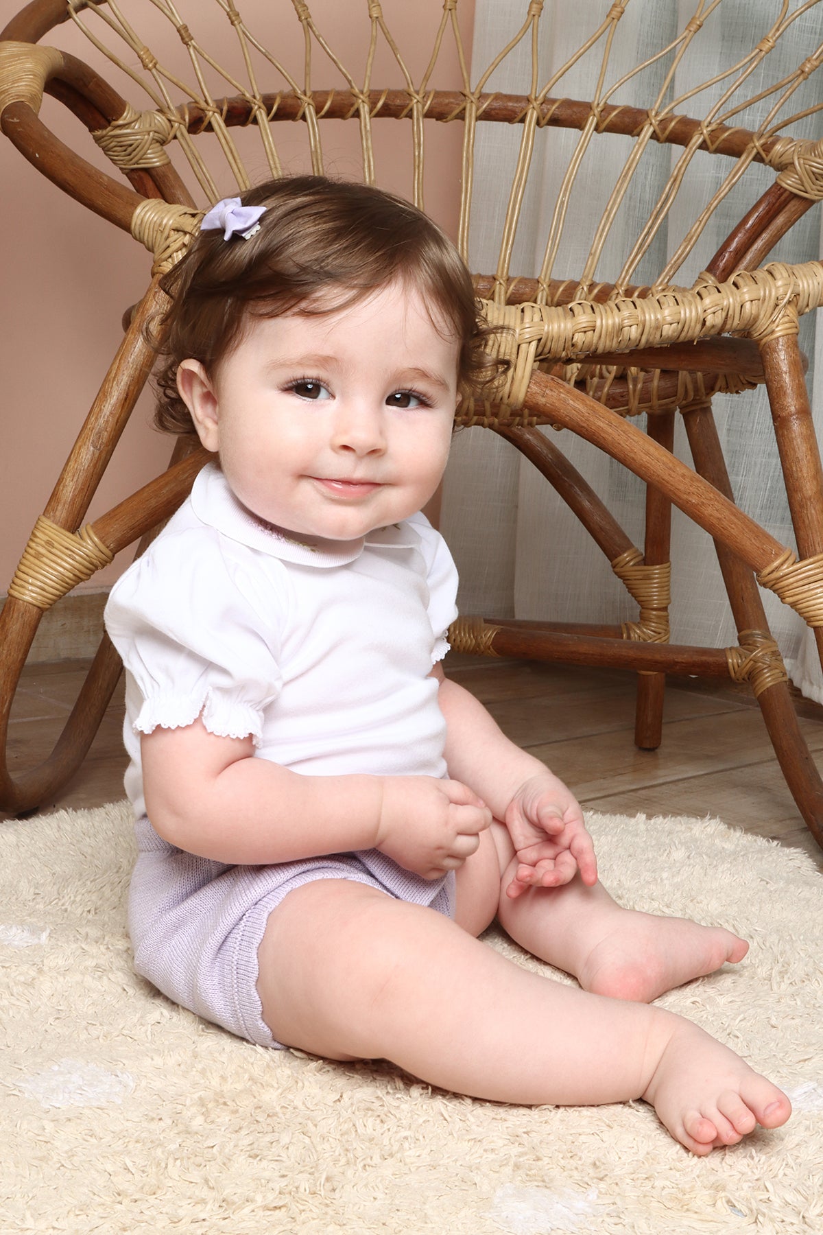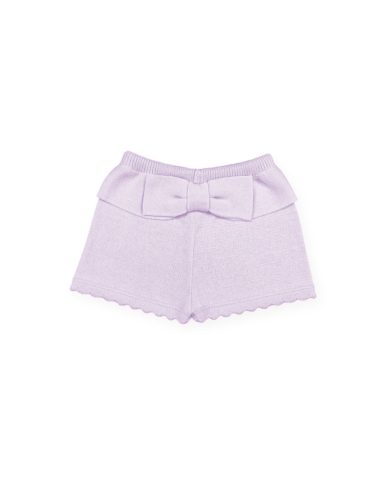 Shortinho tapa-fraldas em tricot lilás com laço.